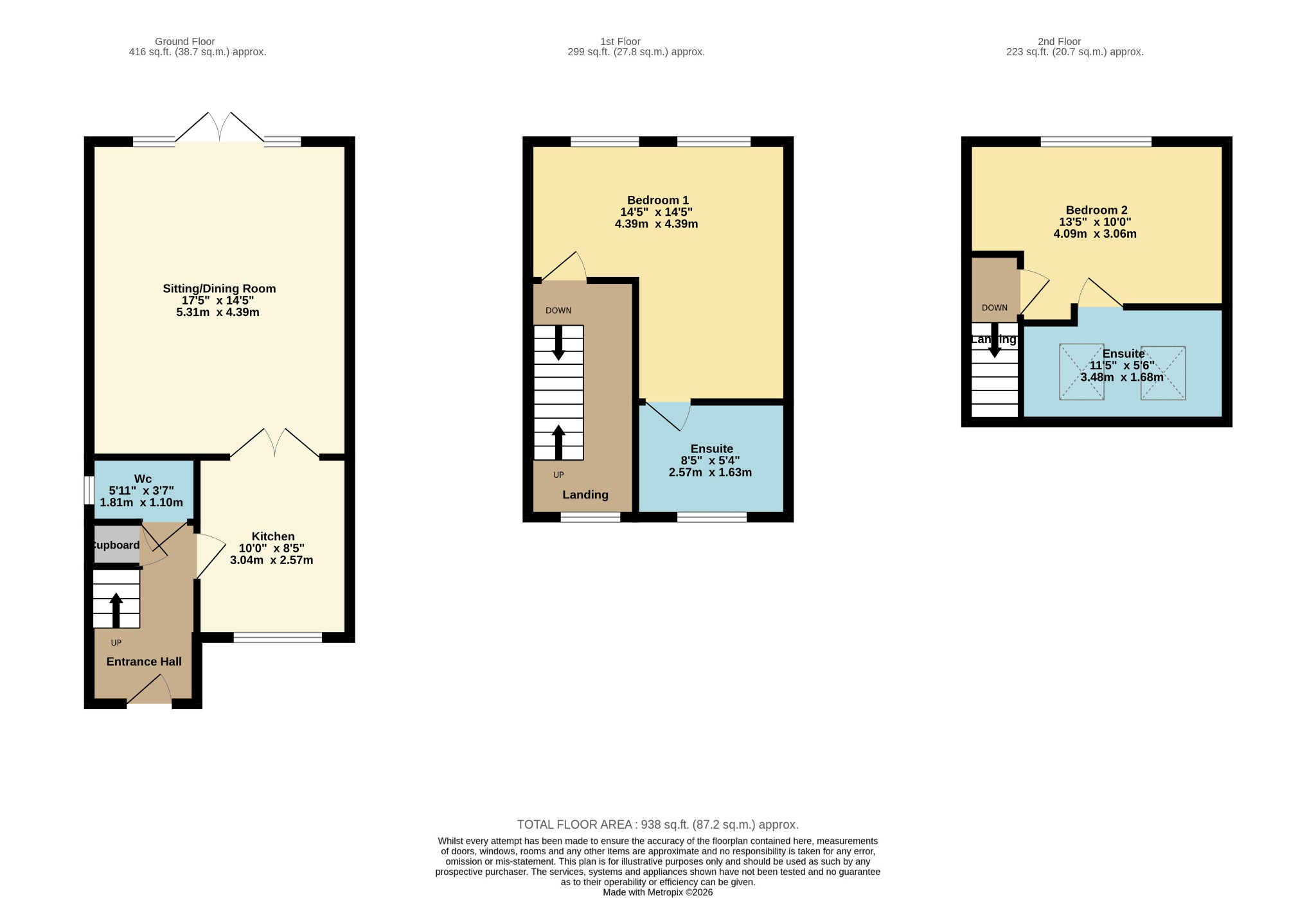 Constructed approximately three years ago, this two bedroom end-of-terrace property provides well-proportioned and modern accommodation. Situated on a corner plot position, the property enjoys a generous south facing rear garden. Both of the bedrooms provide en-suite facilities and there is a ground floor WC. The kitchen has attractive French doors which open into the spacious sitting/dining room. From the first floor landing is access to the master bedroom and en-suite shower room. From the second floor landing is access to a further double bedroom and en-suite bathroom.