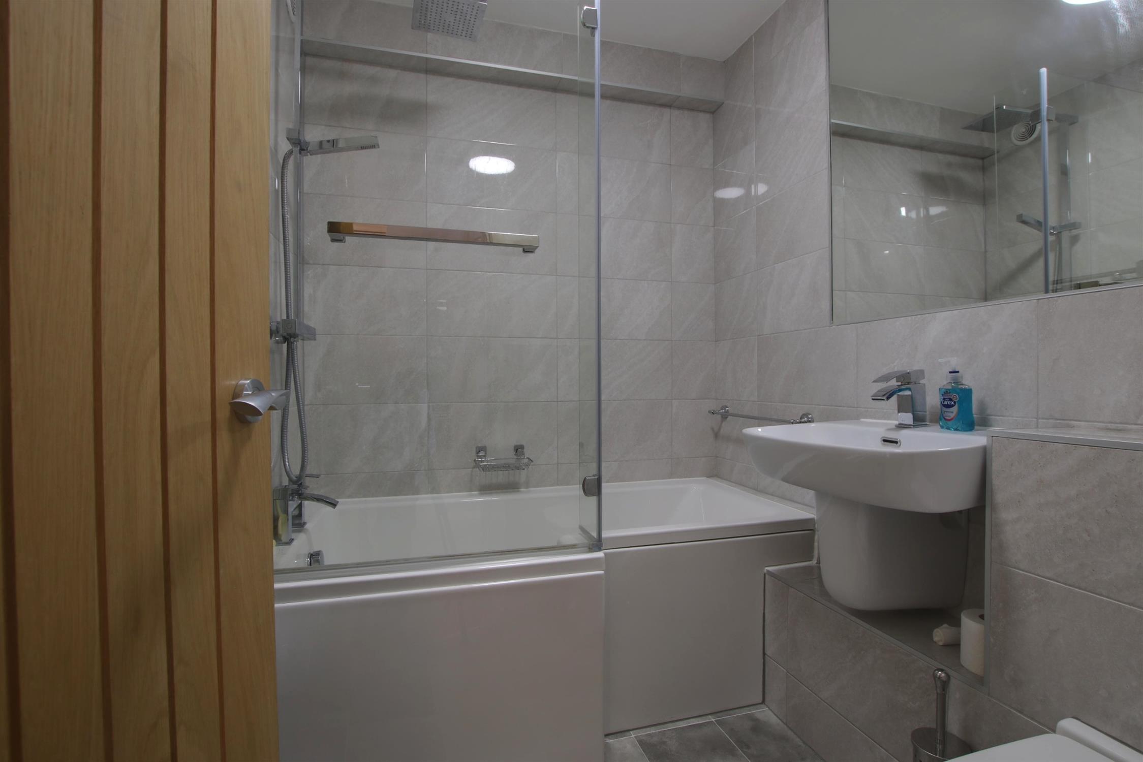 Smooth ceiling. Vinyl tile effect flooring. Modern suite comprising bath with shower over and screen. Wash hand basin. Low level WC. Electric heated towel rail. Part tiled walls. Extractor fan.