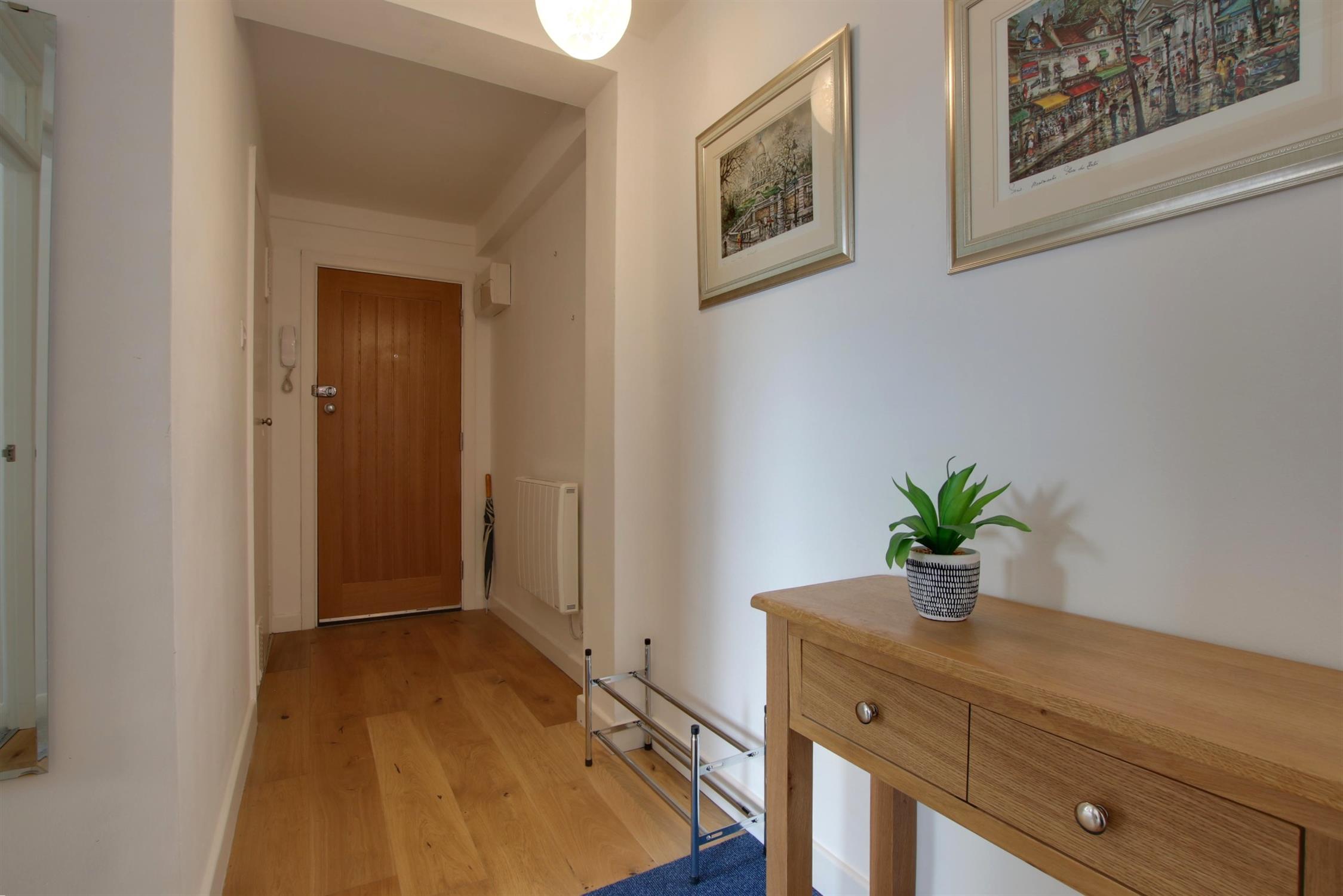 Smooth ceiling. Wooden flooring. Intercom system. Double storage cupboard with a shelf and hanging space. Storage cupboard with 'Stelflow' water tank. Wall mounted electric heater. Doors leading to: