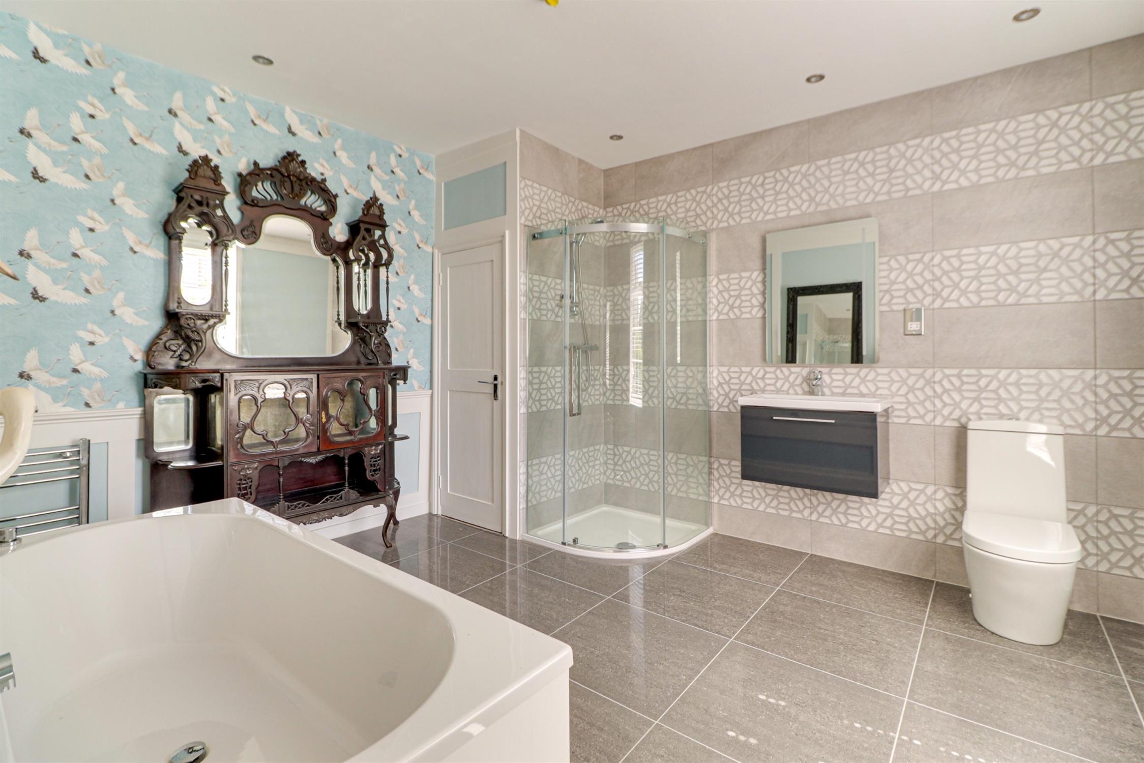 Smooth ceiling, inset spotlights, double glazed obscured window, corner shower cubicle, panelled bath, wash hand basin with cupboards beneath, WC, fitted mirror with built in lights, shaver point, panelling, part tiled walls, tiled floor.