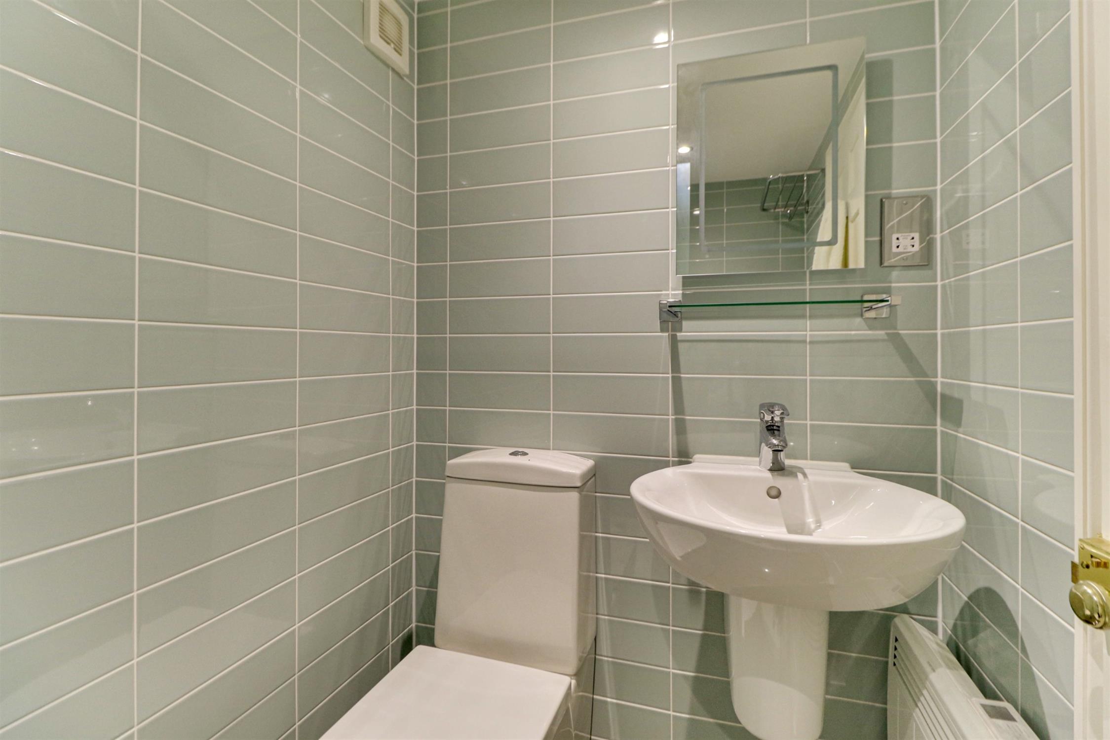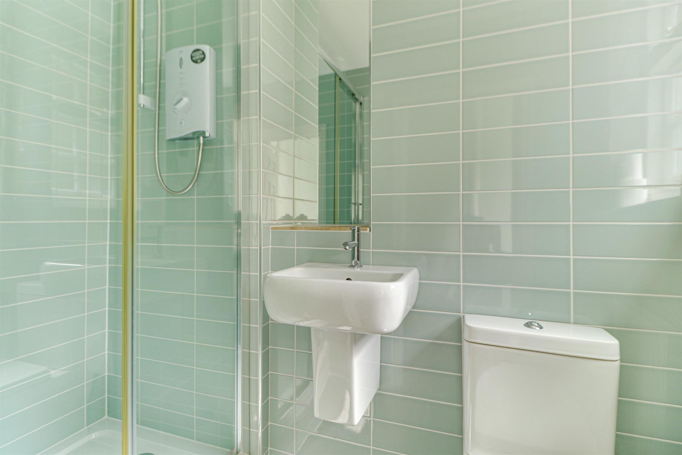 Smooth ceiling, inset spotlights, double glazed window, shower cubicle, wash hand basin, WC, radiator, recessed shelf, fitted mirror, tiled walls, tiled floor.