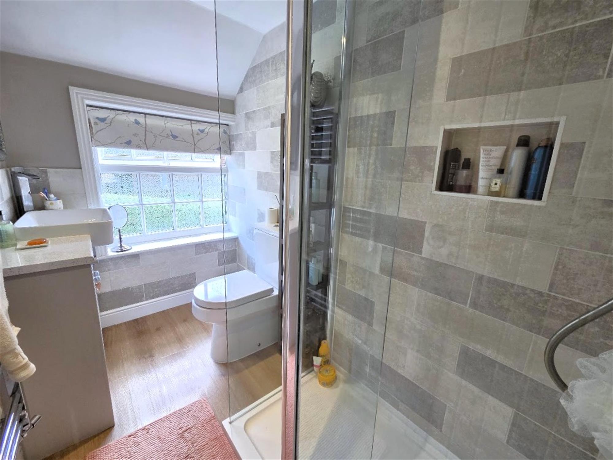 Glazed shower enclosure with mains-fed shower attachment, vanity-housed wash basin, low-level WC, ceramic tiled splash backs, chrome heated towel rail radiator, upvc obscured double-glazed window to the front aspect, timber effect laminated flooring.