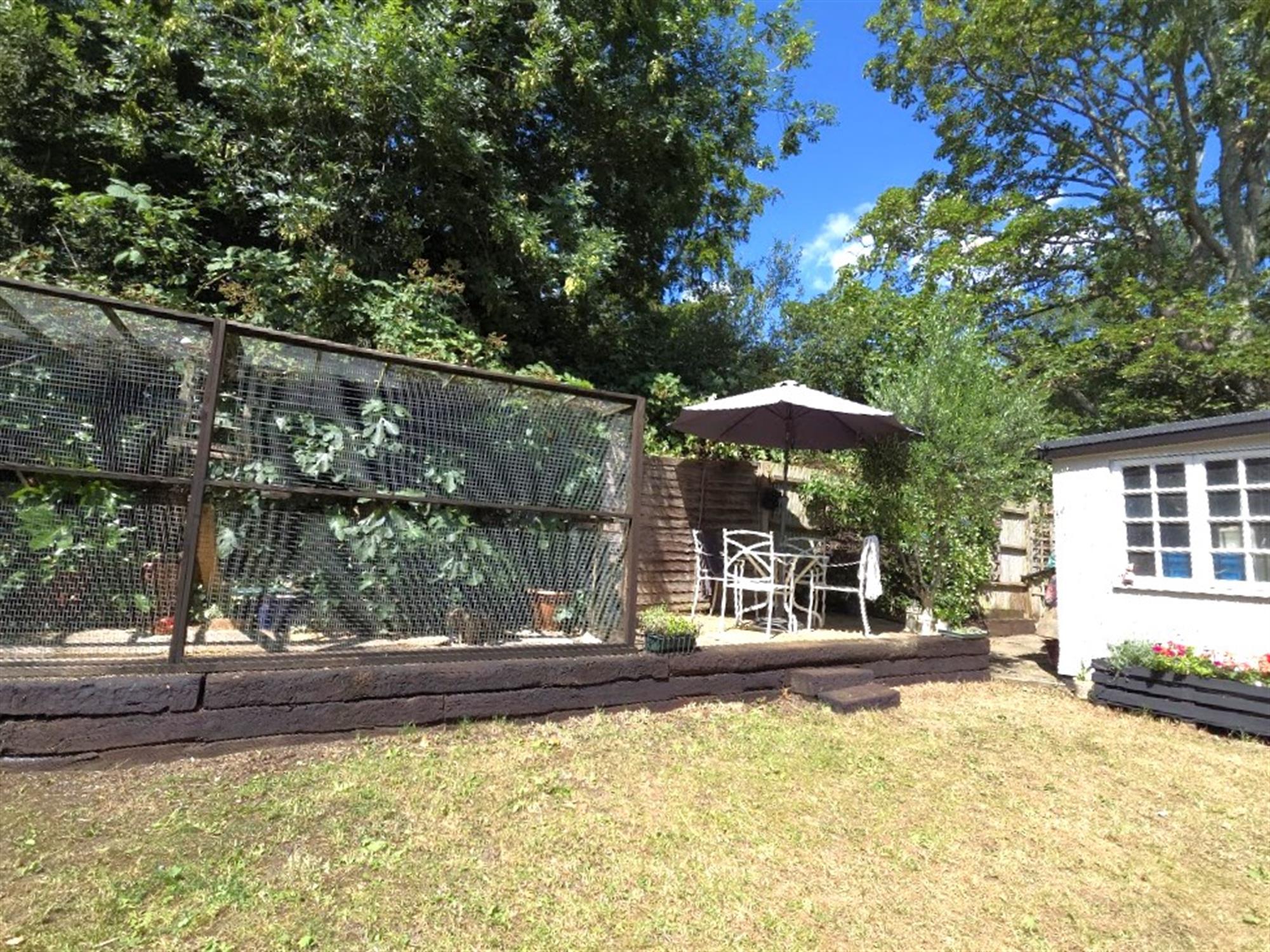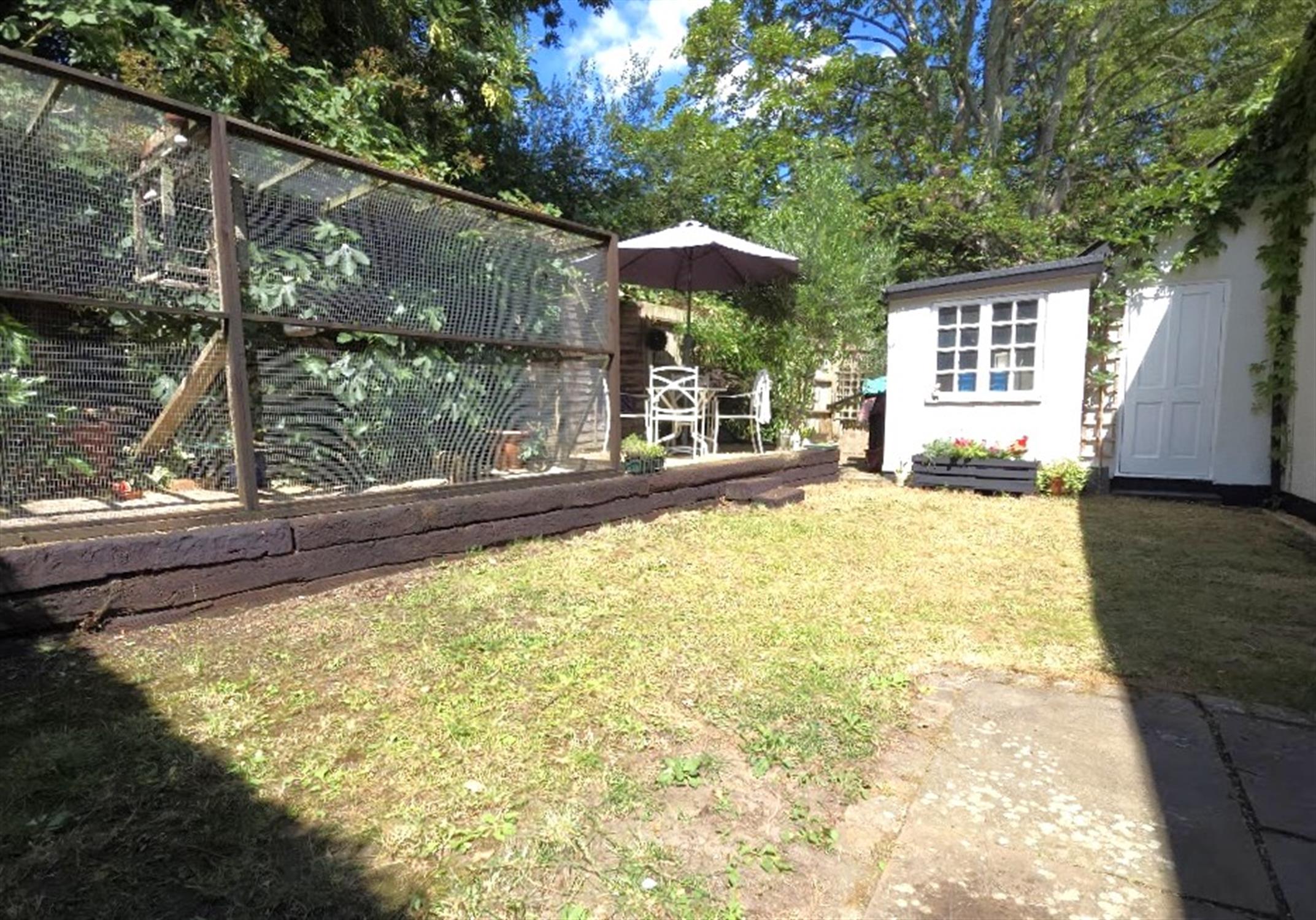 Fully enclosed, a good variety of shrubs, flower borders, area of lawn, paved patio seating area with timber pergola with maturing climbers, timber shed, door access to the garage.