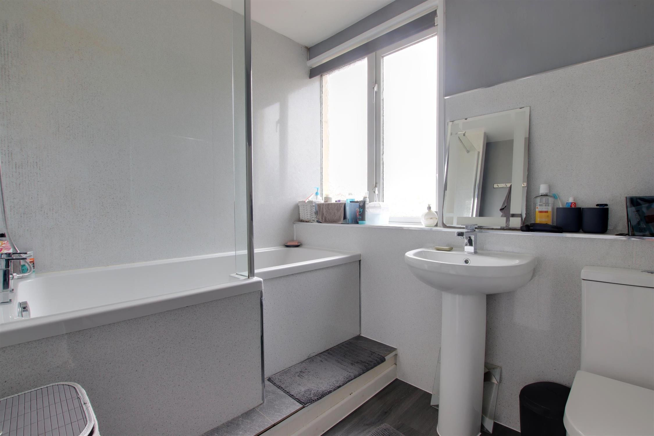 Double glazed window to the rear aspect. Smooth ceiling. Modern suite with 'P' shaped bath with hand shower and screen. Wash hand basin and low level WC. Aquaboarding splashback. Radiator. Wood effect laminate flooring.