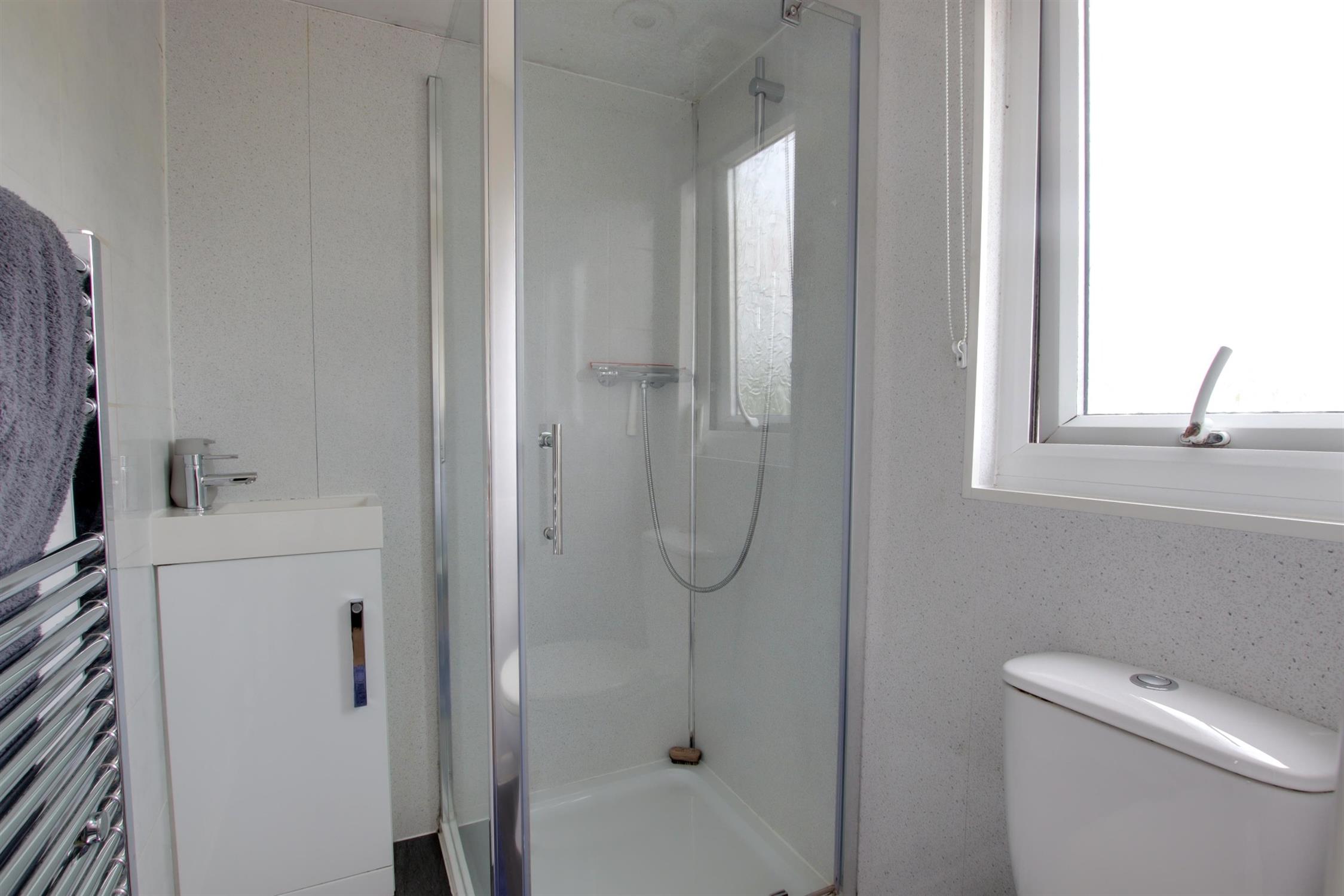 Double glazed window to the rear aspect. Modern suite comprising; shower cubicle. Low level WC. Wash hand basin. Aquaboard splashback. Heated towel rail.