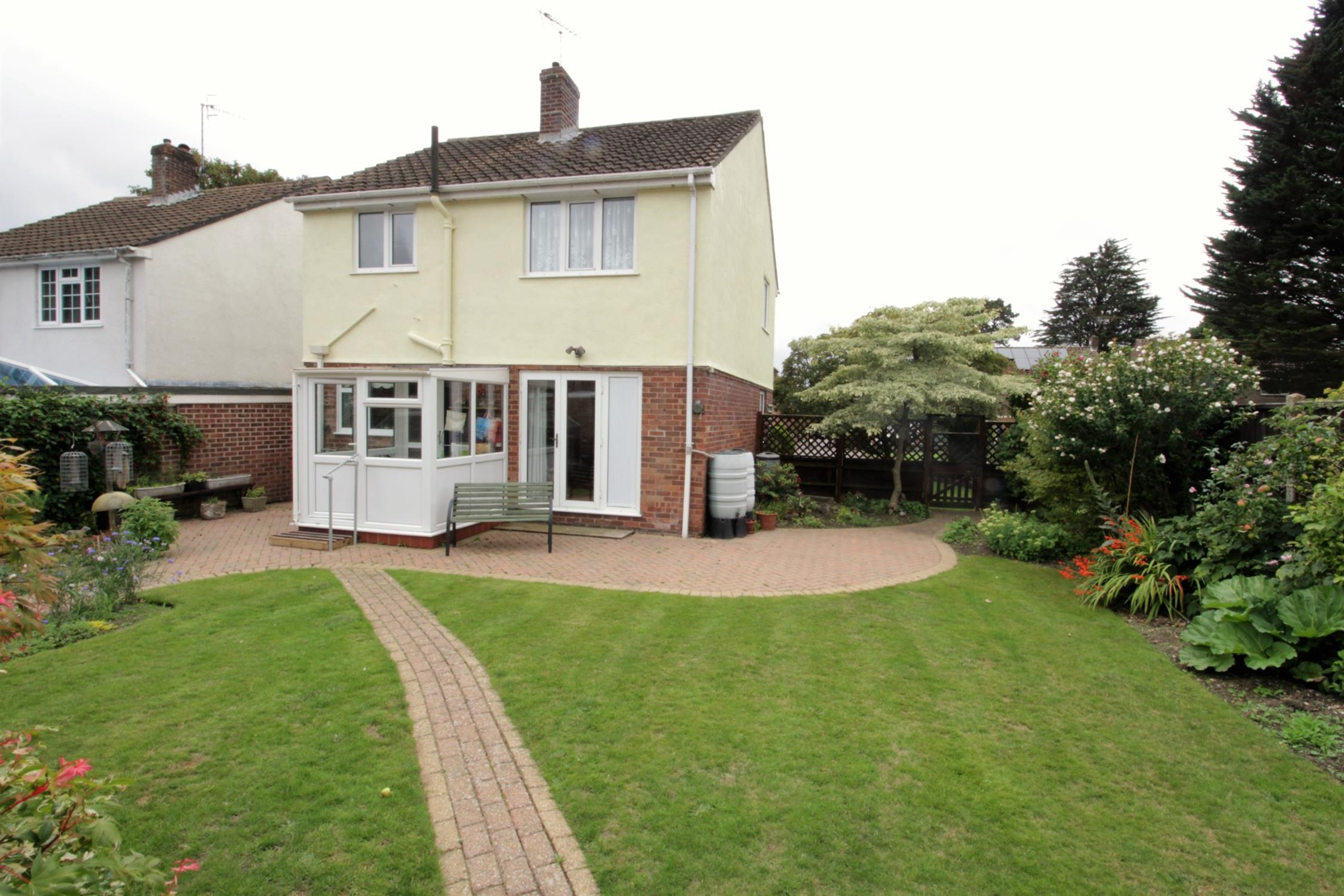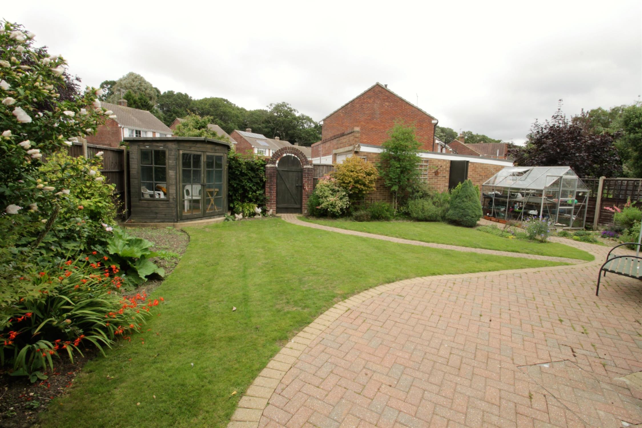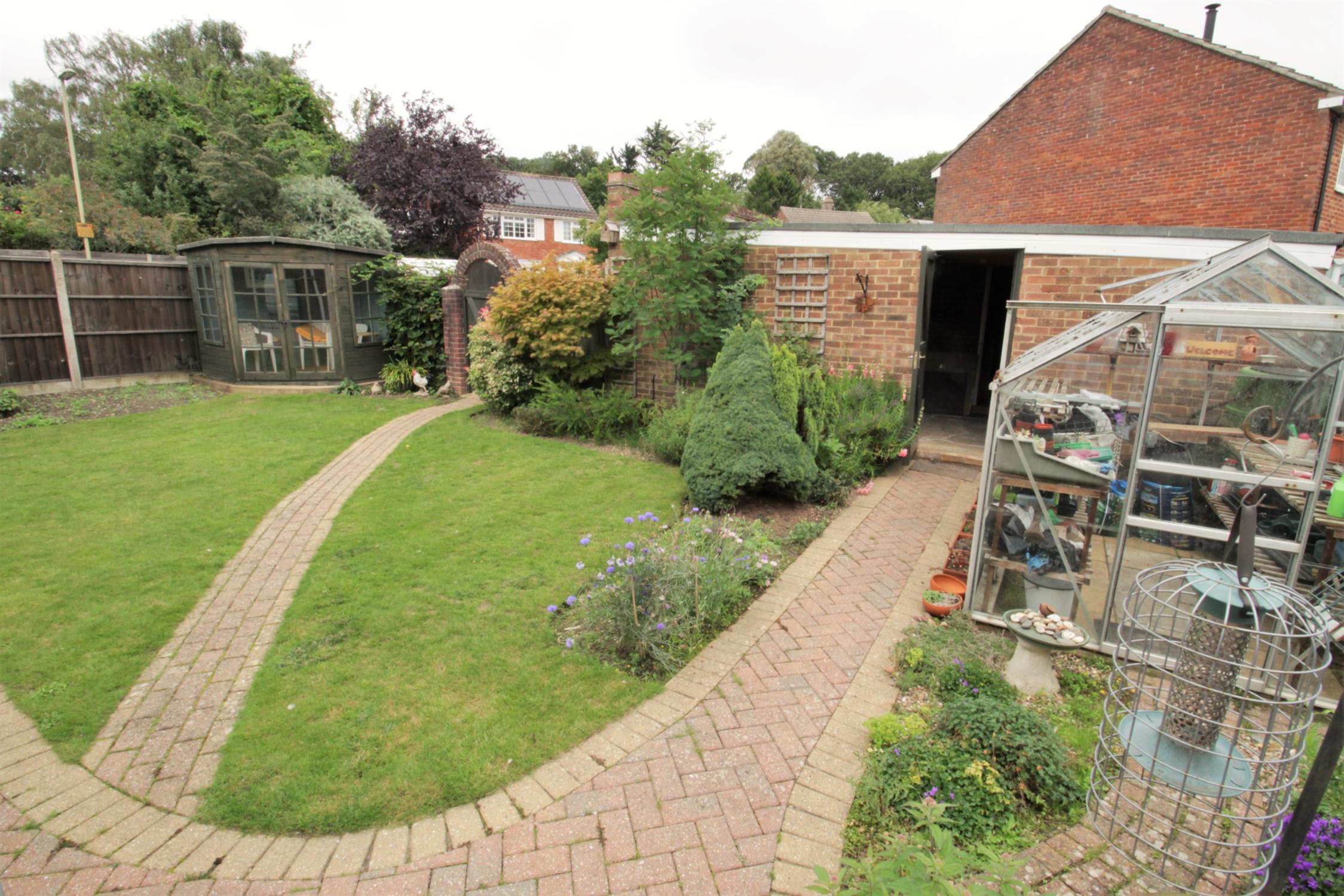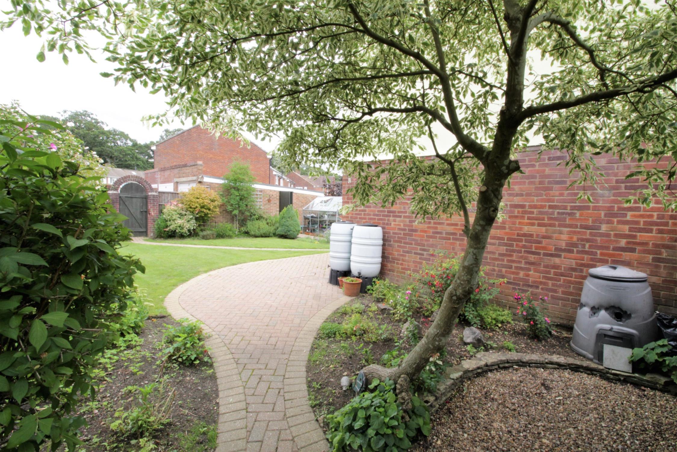 Sunny aspect wrap around garden to rear and side, timber fence panel enclosed, paved patio and pathway, established lawn, flowering shrub borders, outside tap, gated rear access to double width block paved driveway.