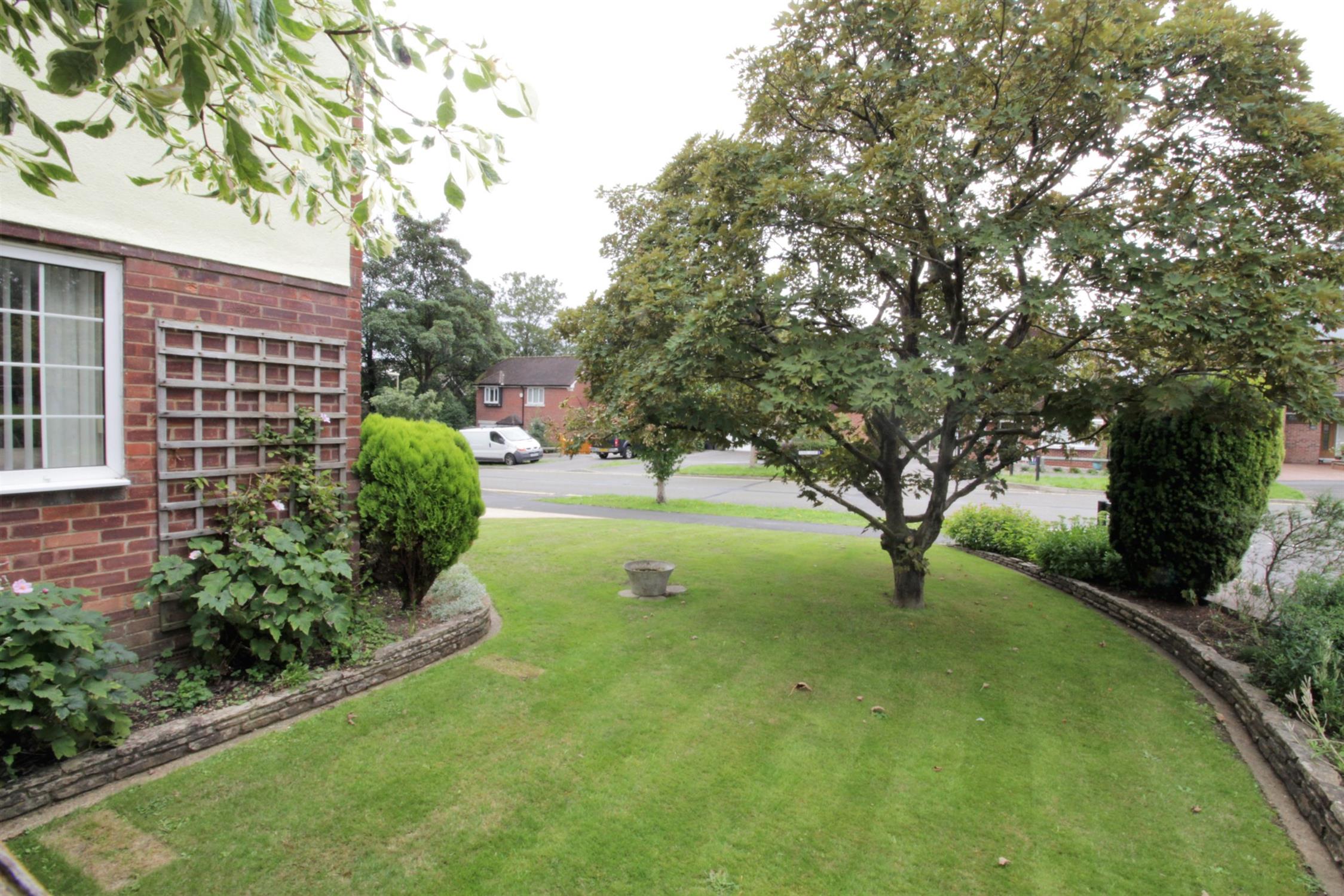 Open plan lawned area with planted shrubs and pathway to front door.