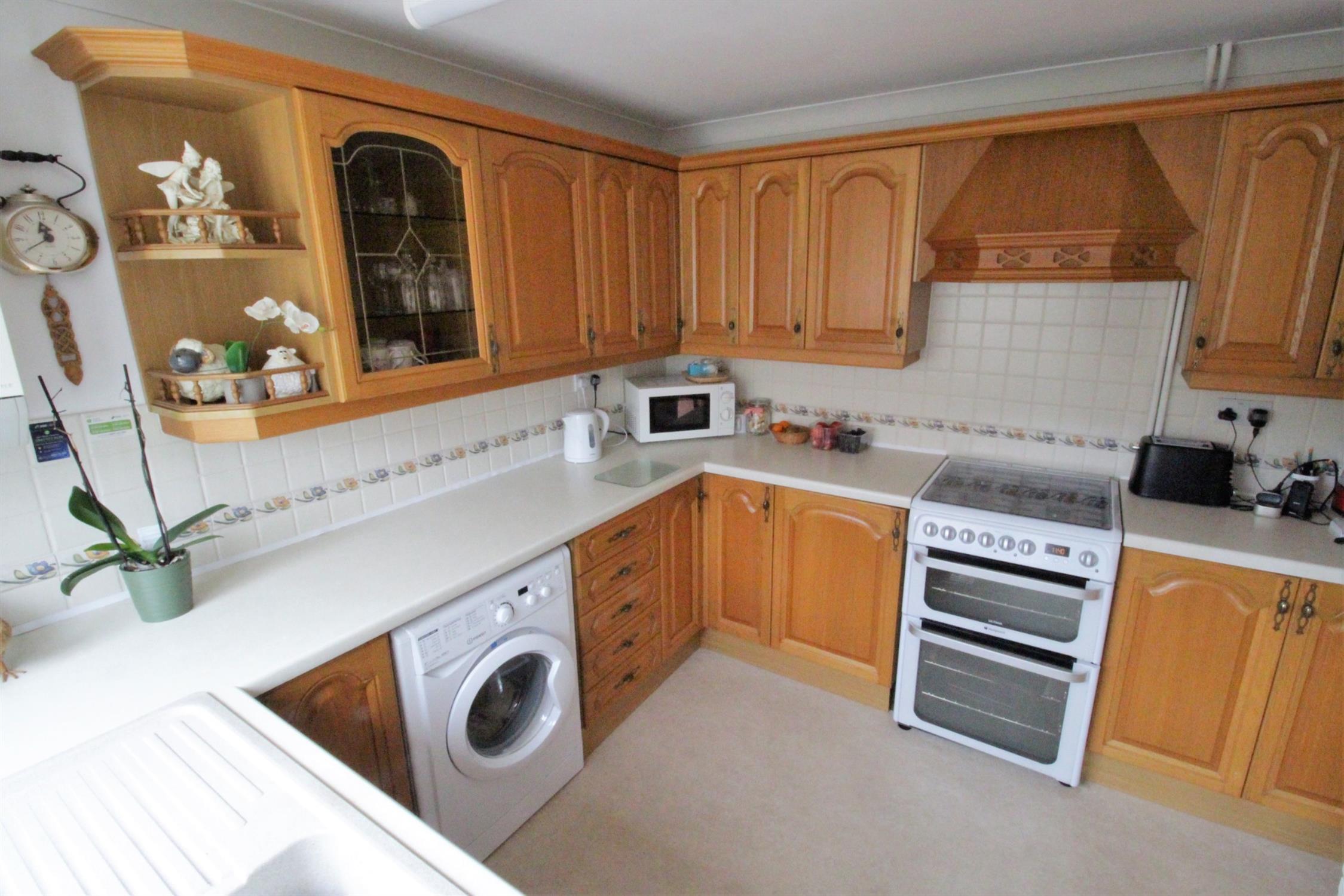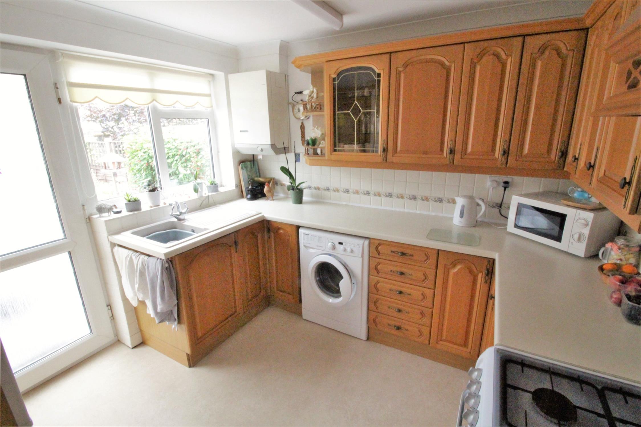 Double glazed window to rear, double glazed door to conservatory, range of fitted wall and base units, roll edge worksurfaces with inset single bowl sink and drainer, mixer tap, space for gas cooker, overhead extractor, plumbing and space for washing machine, space for tall fridge/freezer, shelved pantry cupboard, wall mounted Worcester gas boiler.