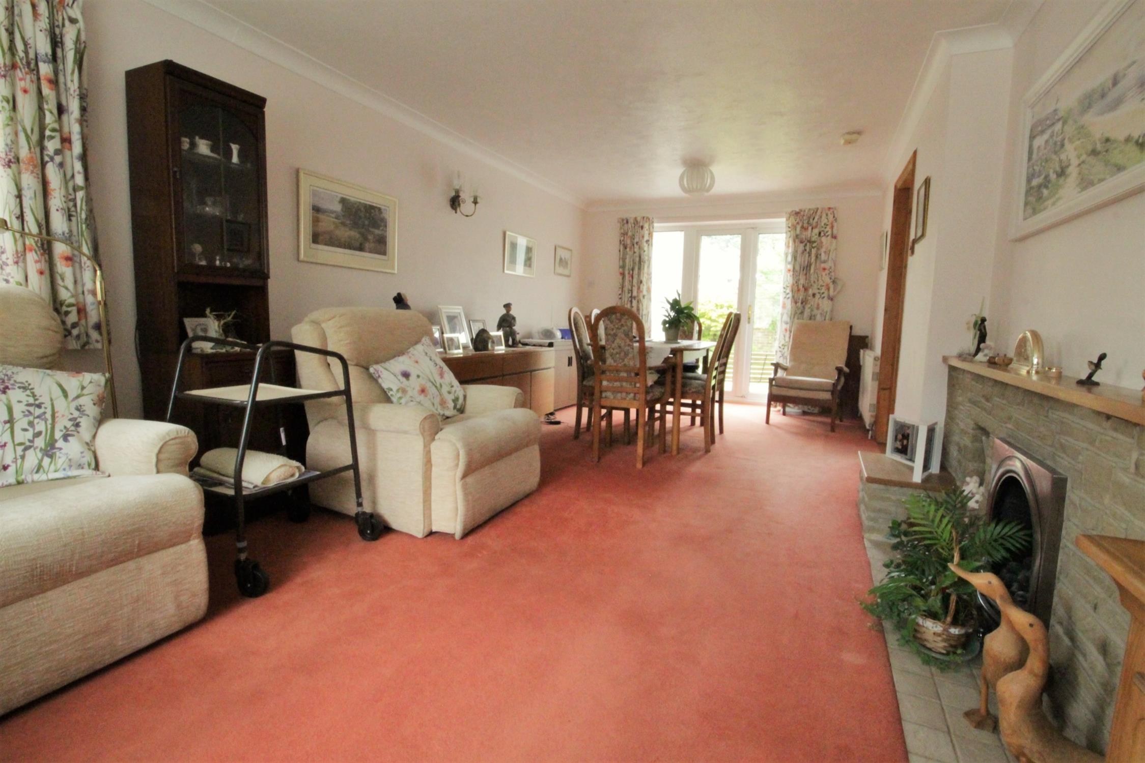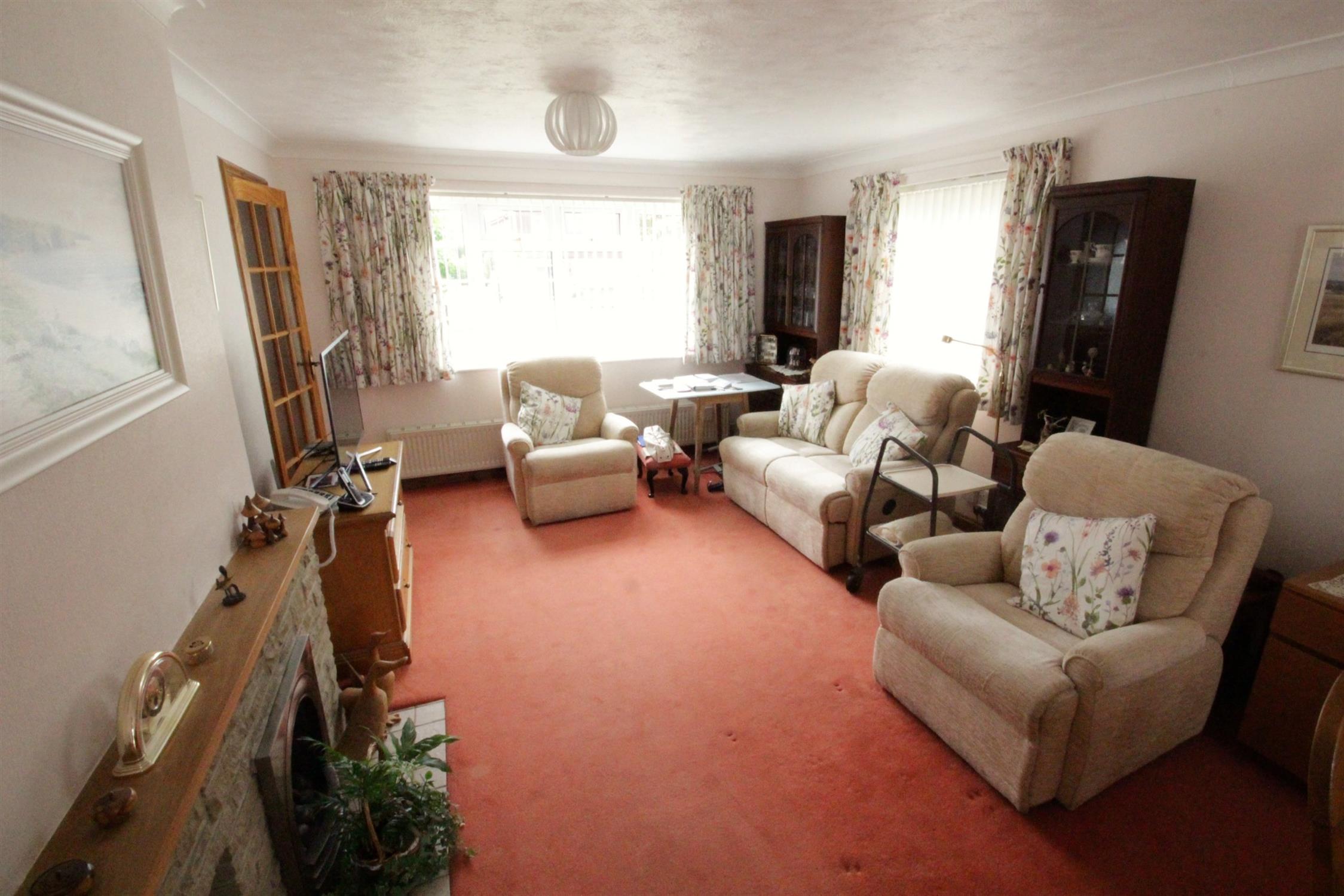 Double glazed window to front and side, double glazed patio doors to rear garden, two radiators, chimney breast with stone hearth and surround, timber mantle, inset gas fire.
