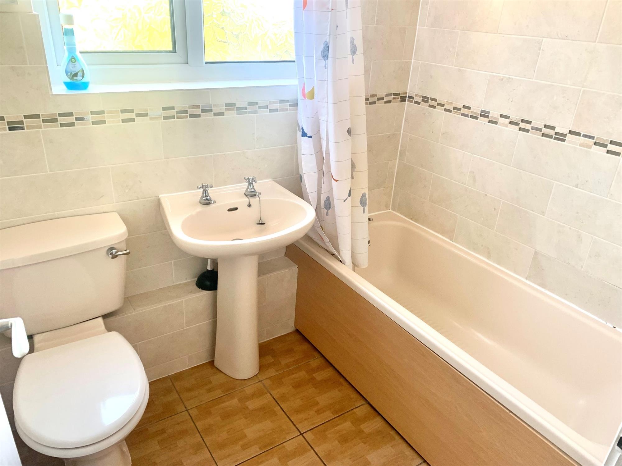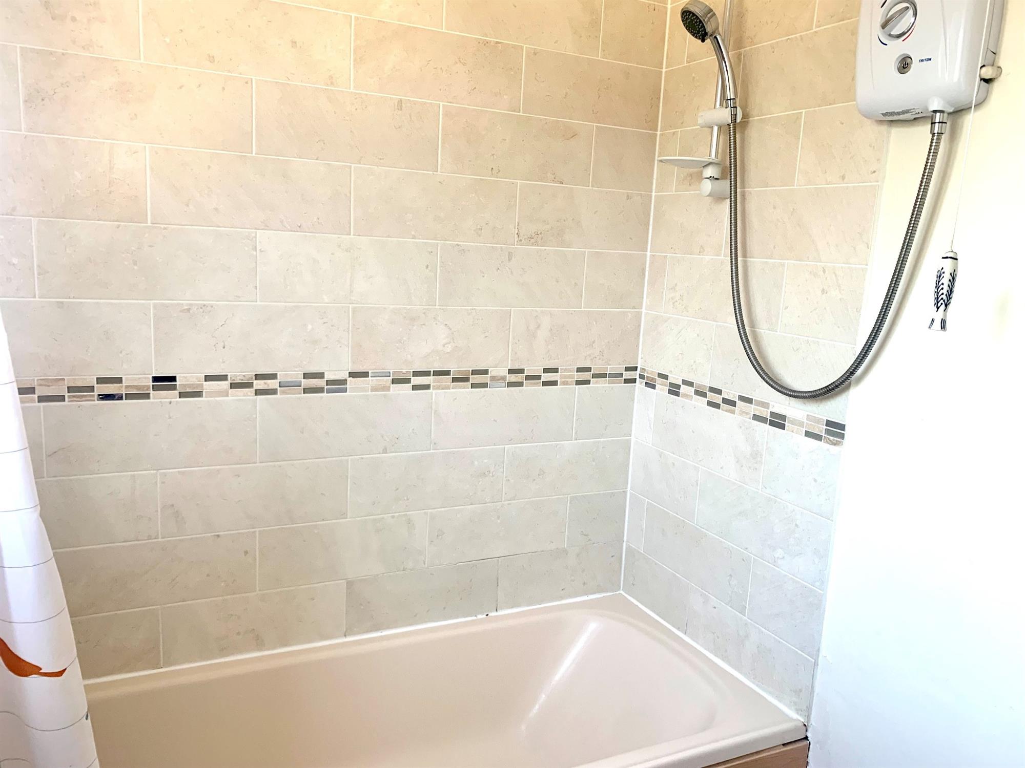 Cream suite with bath with electric shower over, WC and a sink. Window to rear.