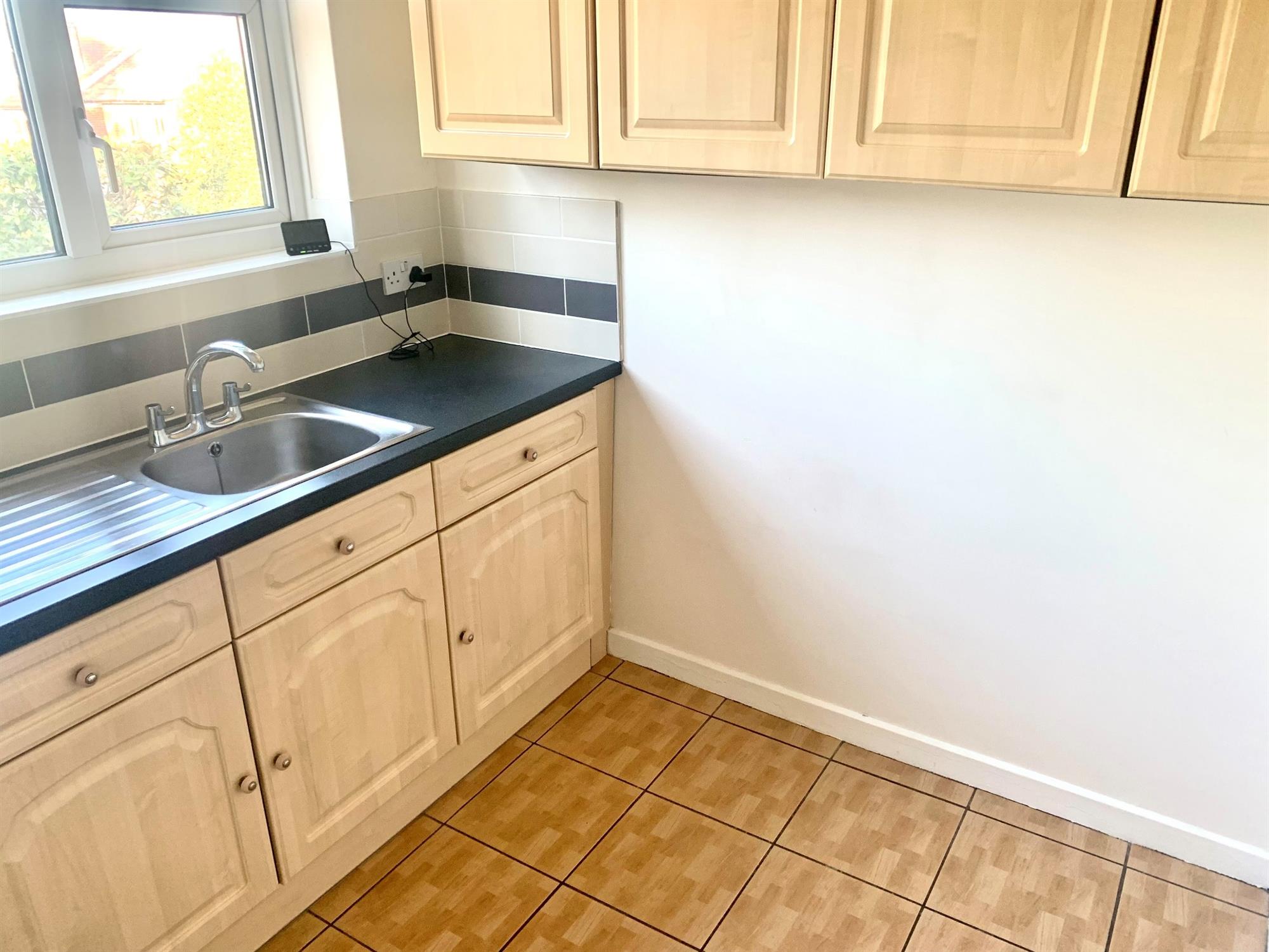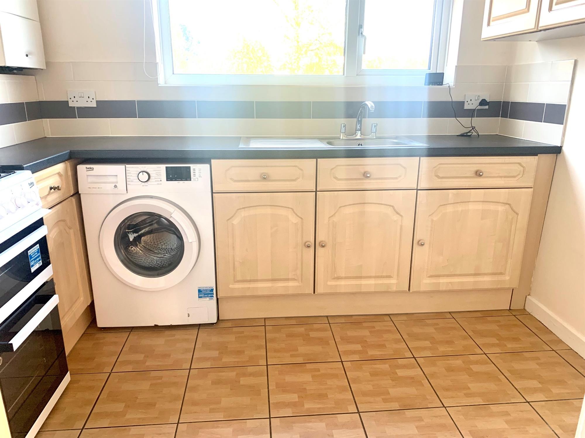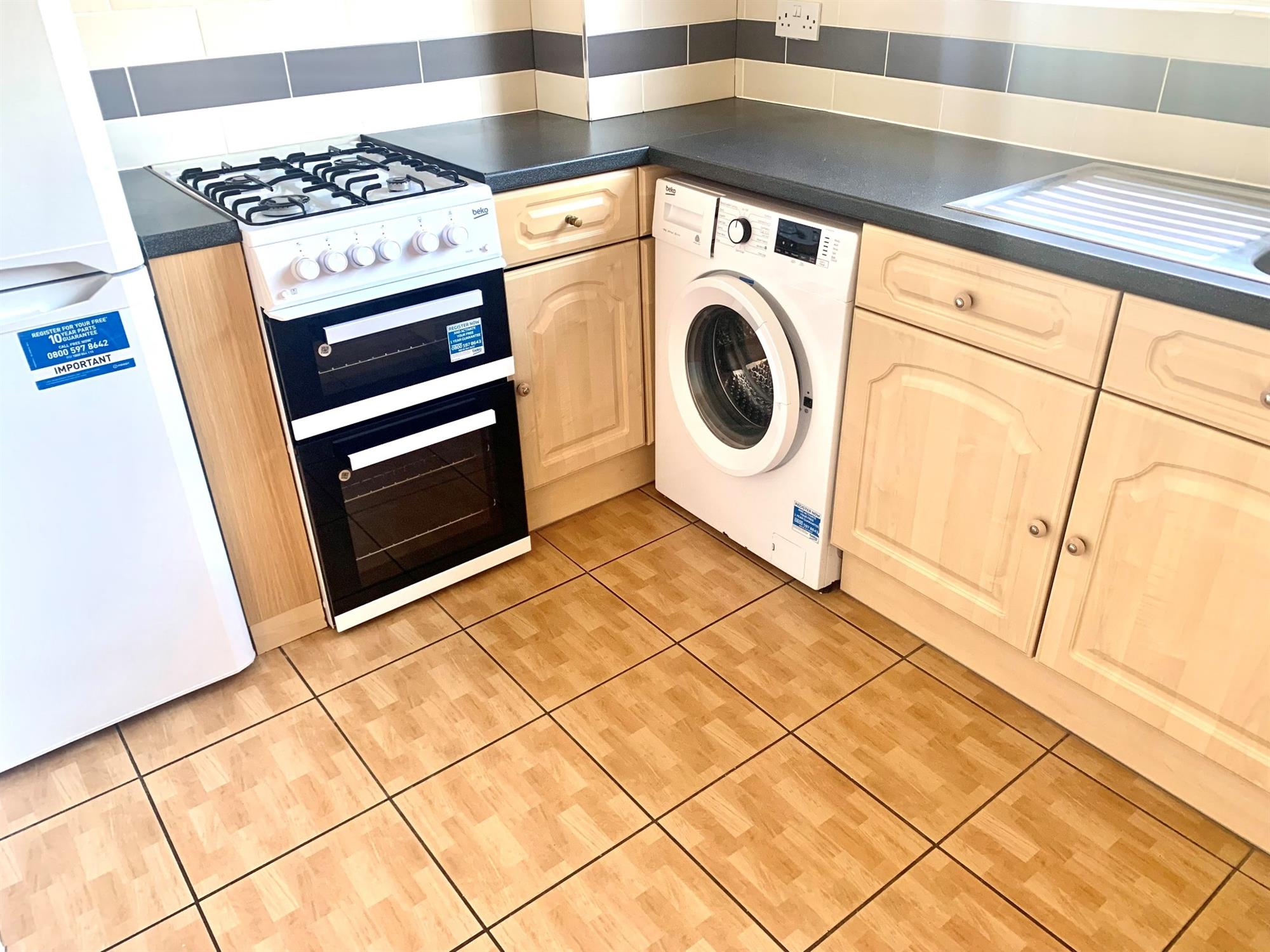 Range of wall and base units with gas oven, fridge/freezer and washing machine. Window overlooking rear.
