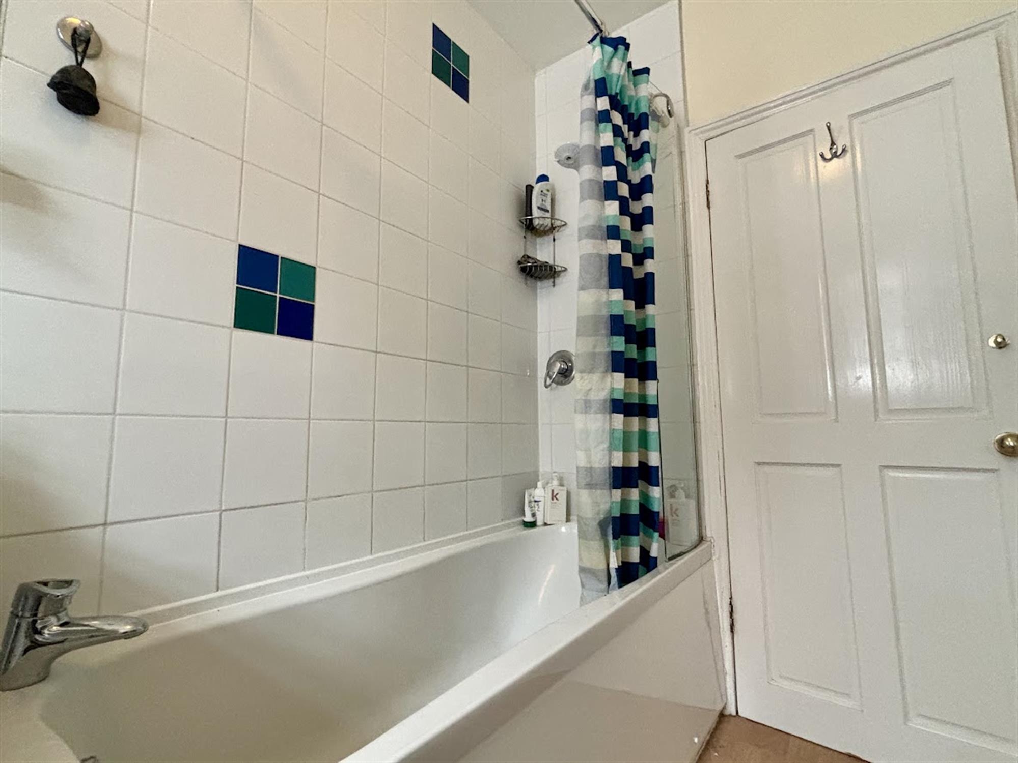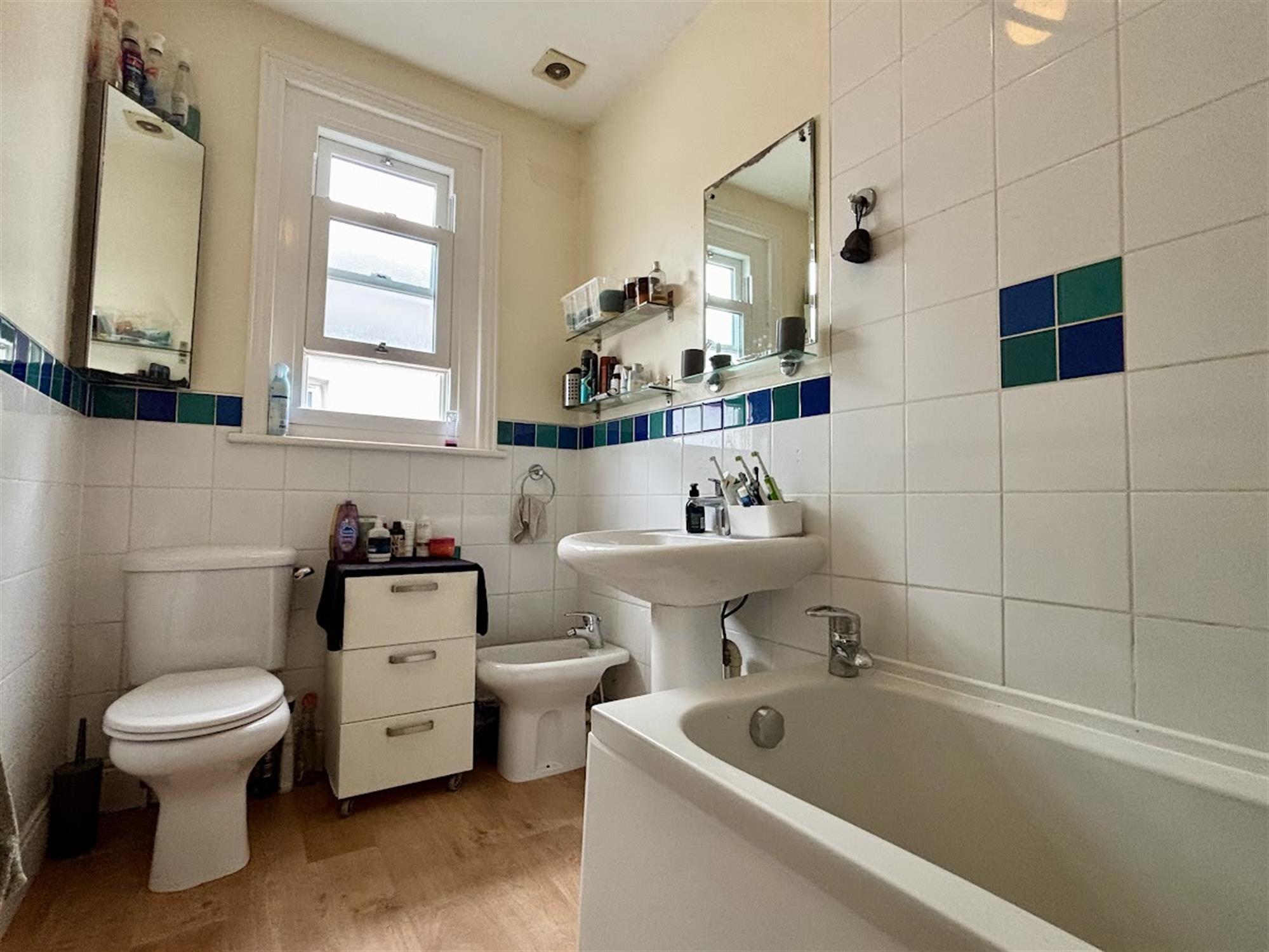 A three-piece bathroom suite consists of a bath with shower over, a hand basin, and a low-level WC. The bathroom also benefits from a bidet and a window to the side.