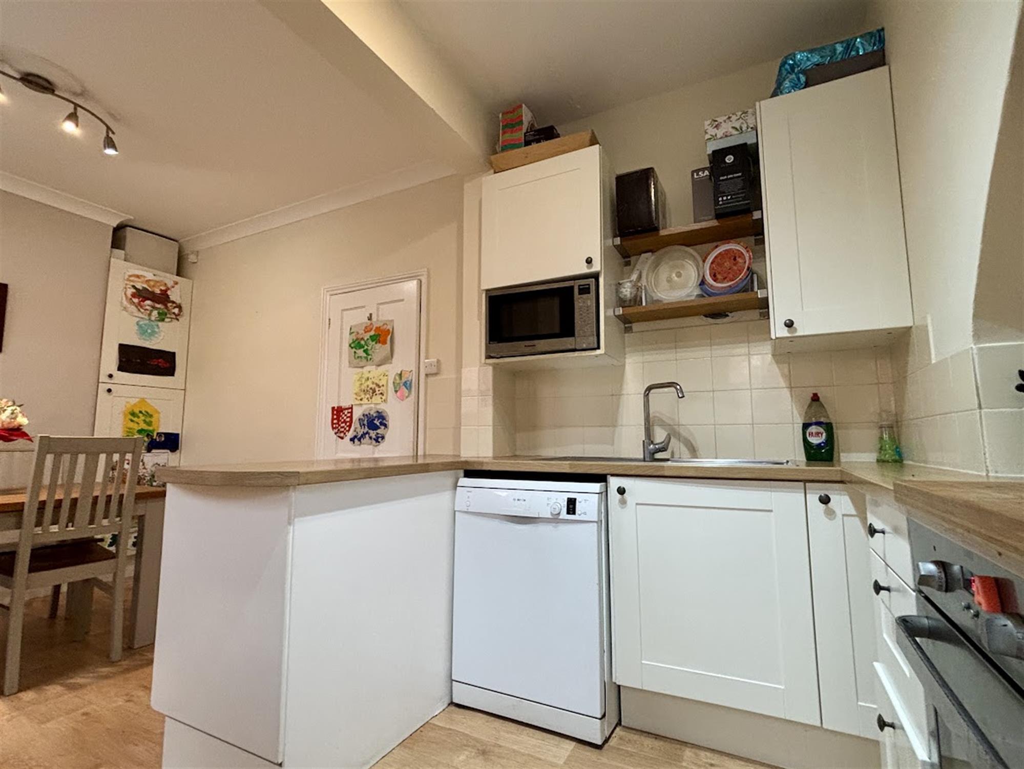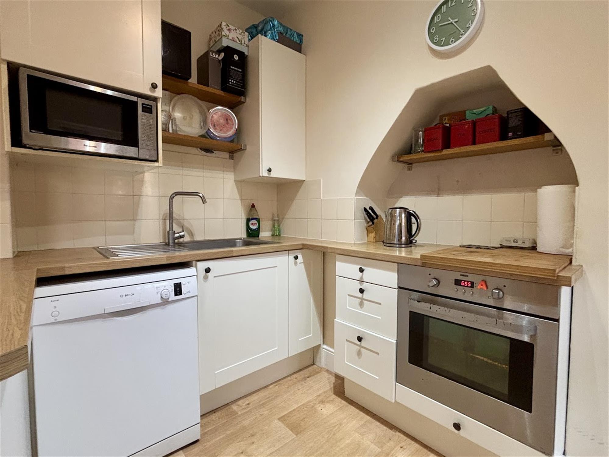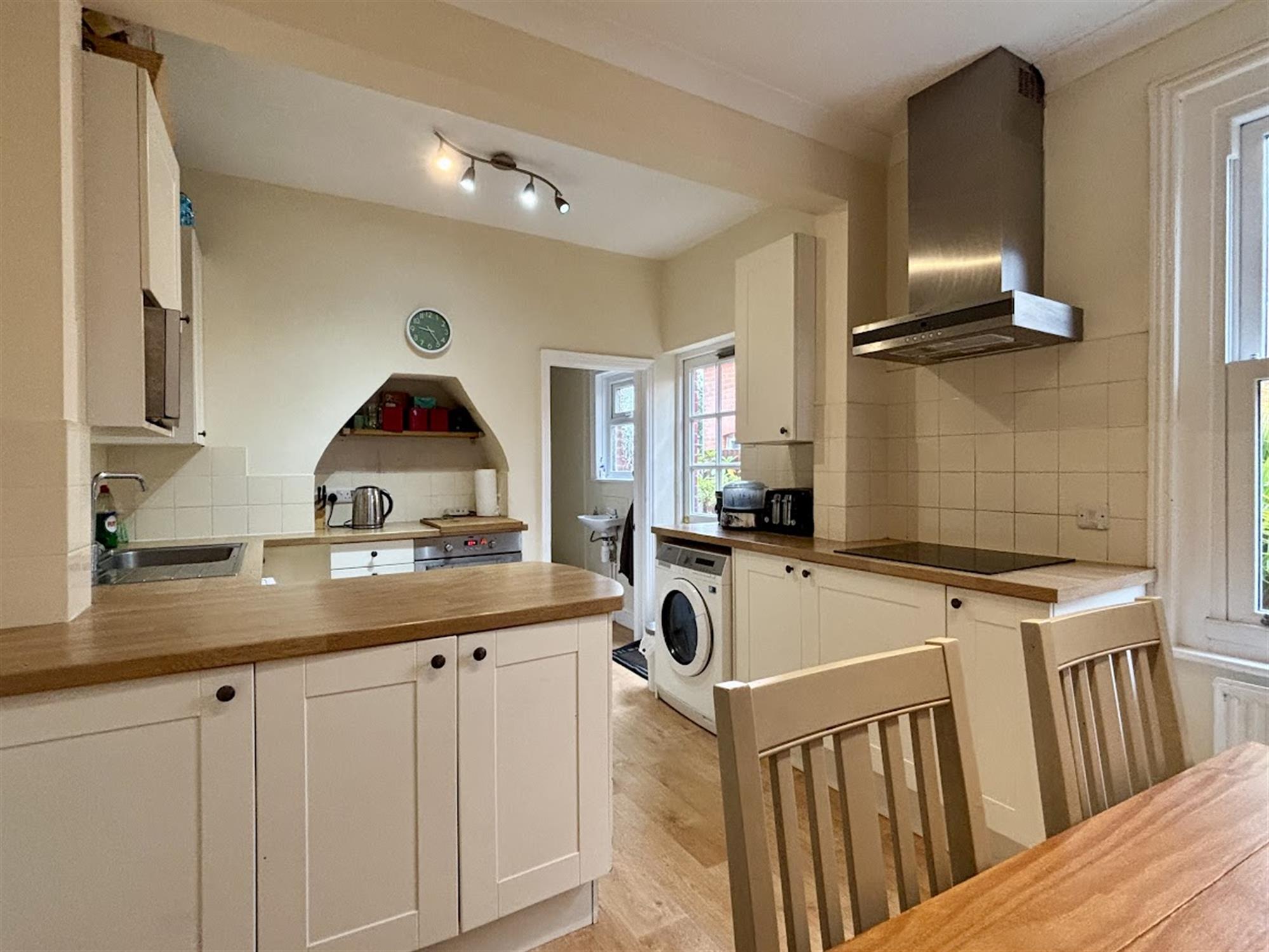 Modern fitted kitchen with various wall and base units and wooden flooring. The appliances consist of a brand-new oven and hob, with optional white goods (fridge/freezer, washing machine and dishwasher). A window to the side and a door leading to the side access and garden. Off the kitchen is a cloakroom, housing the boiler.