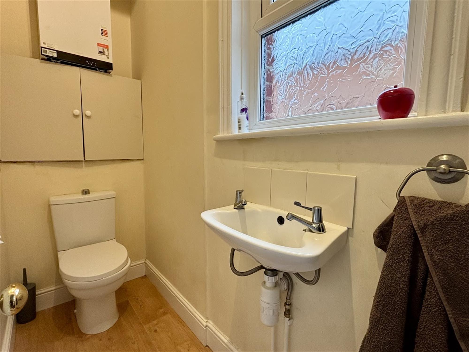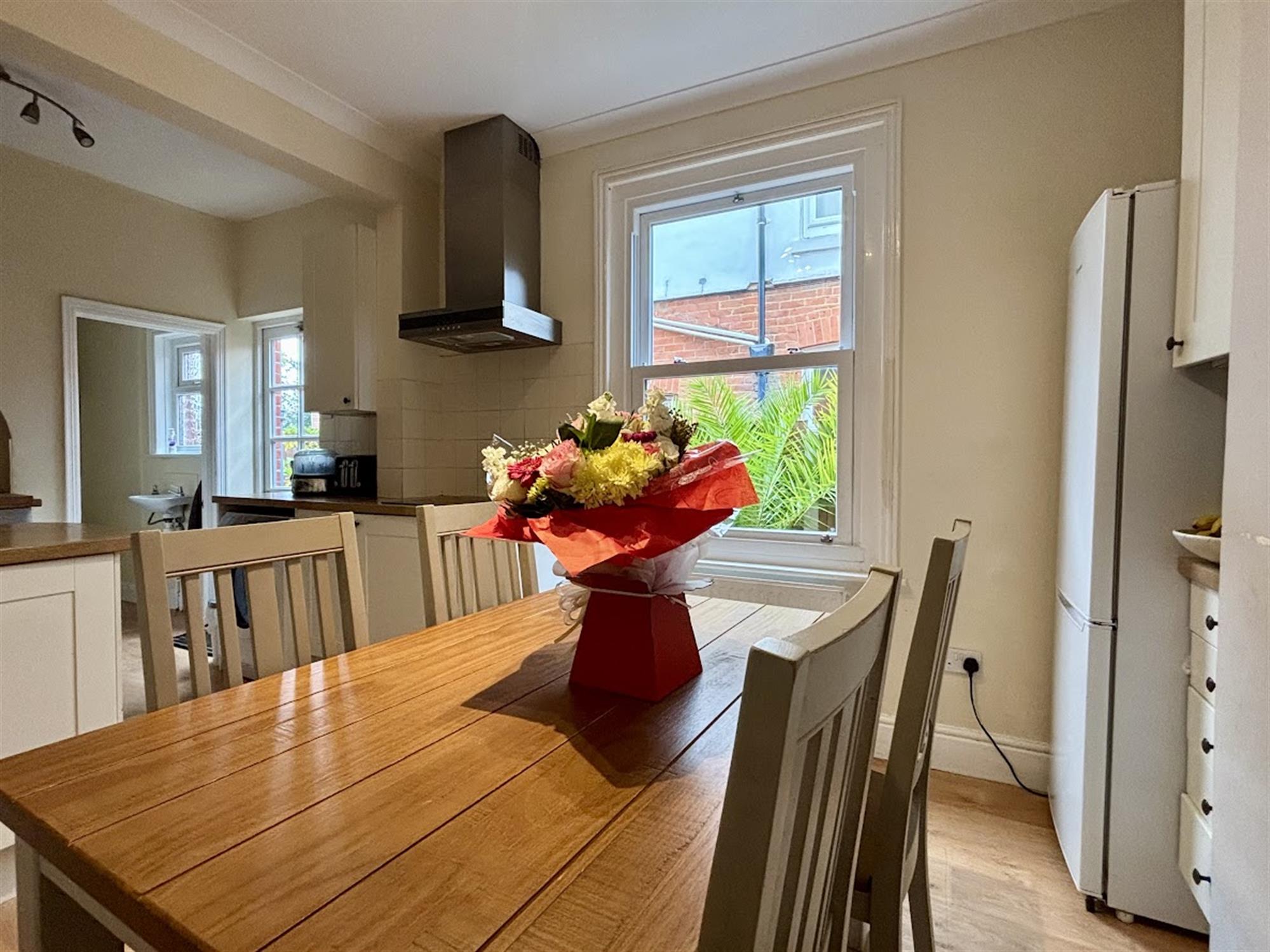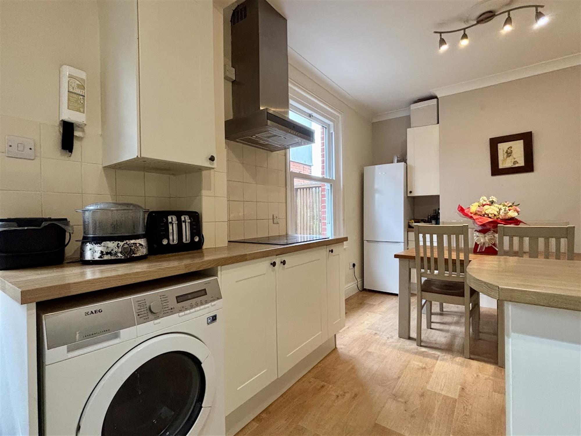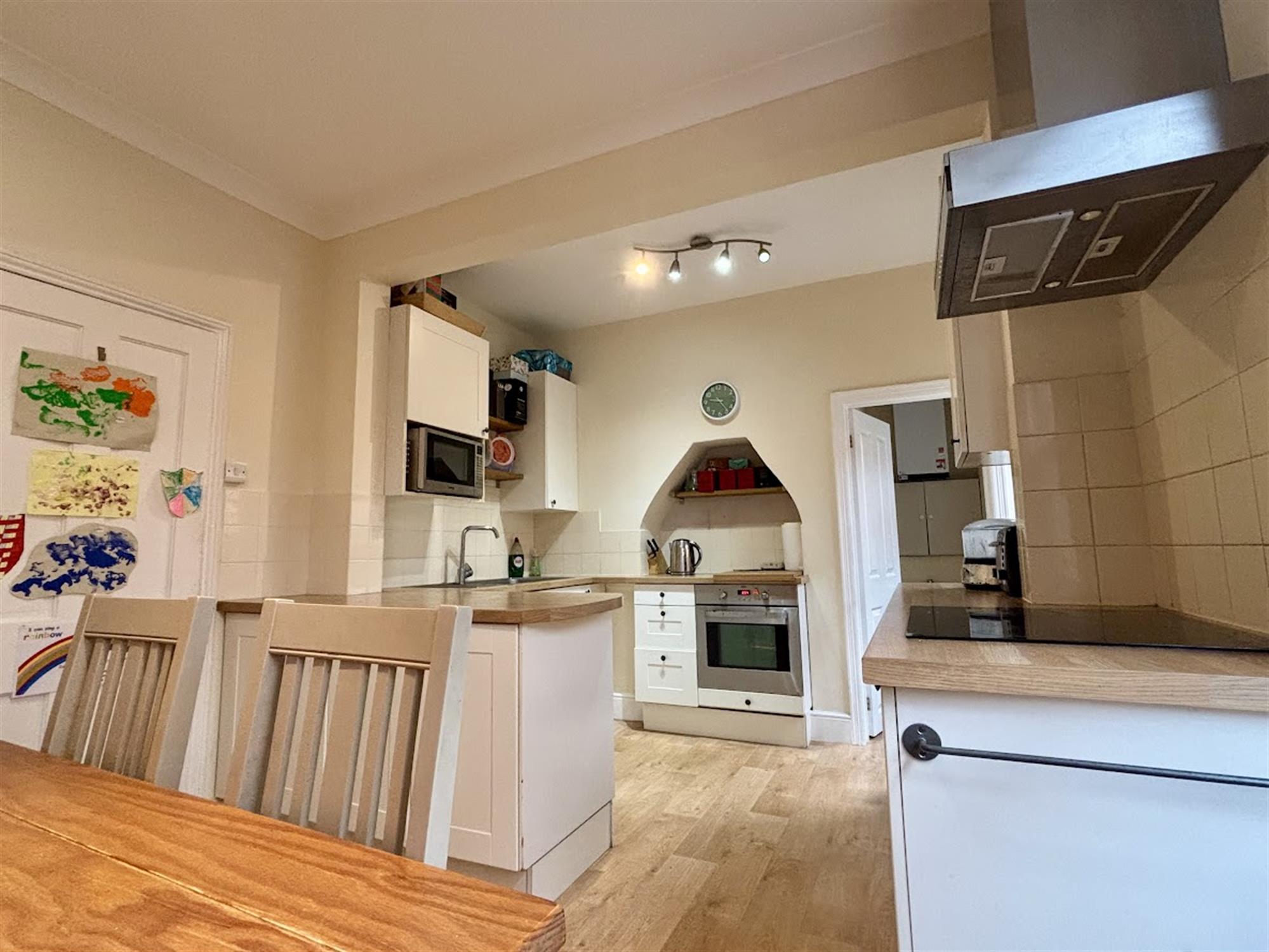 Modern fitted kitchen with various wall and base units and wooden flooring. The appliances consist of a brand-new oven and hob, with optional white goods (fridge/freezer, washing machine and dishwasher). A window to the side and a door leading to the side access and garden. Off the kitchen is a cloakroom, housing the boiler.