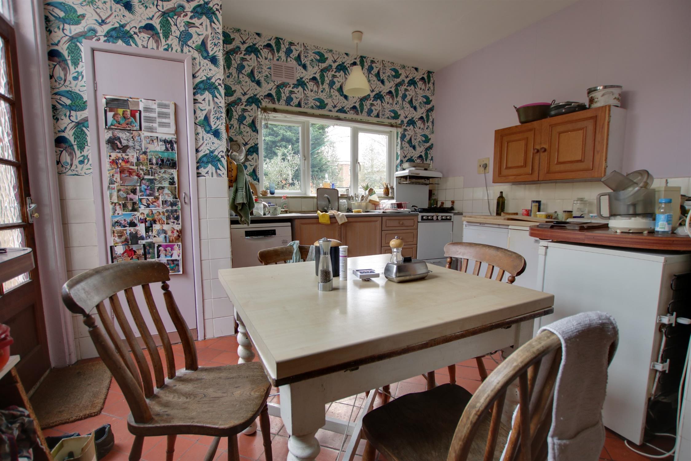 Double glazed window to rear aspect. Window to side aspect. Smooth ceiling. Walk-in pantry. Part glazed door opening onto rear garden. Single drainer one and a half bowl sink unit with mixer tap and cupboard under. Space and plumbing for dishwasher. Space for cooker. Space for under counter fridge and freezer. Radiator. Tiled flooring.