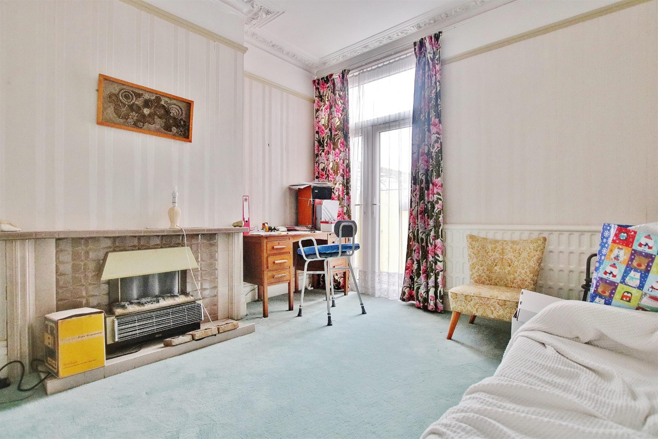 Smooth plastered ceiling. Ornate coving. Original plaster buttresses. Radiator. Carpeted flooring.