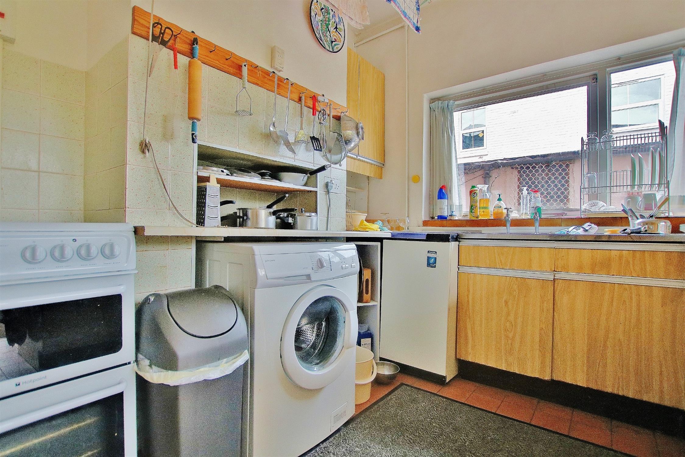 Smooth plastered ceiling. Timber framed double glazed sliding door to the rear aspect. A complementary range of wall mounted and base level units with roll edge worktop over. Space and plumbing for white goods accordingly. Stainless steel sink and drainer with mono bloc tap fitting in chrome finish. Tiled splash back. Tiled flooring. Radiator.