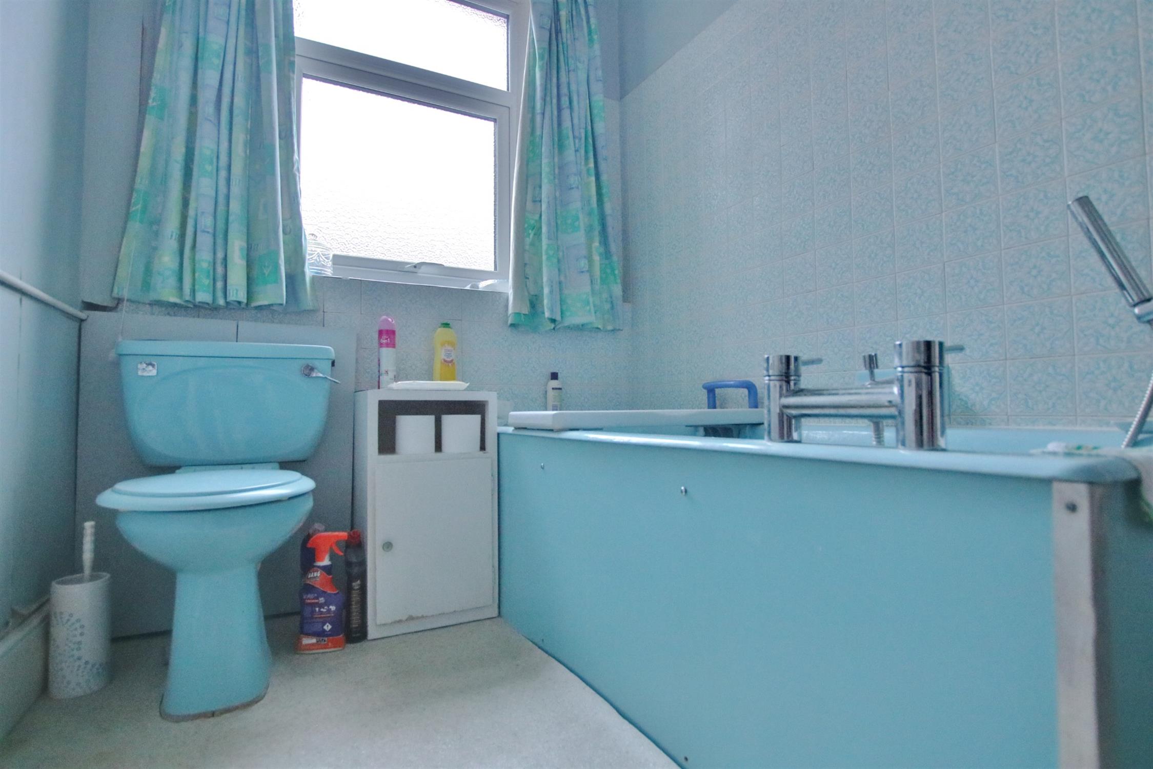 Artexed ceiling. UPVC double glazed obscure window to the side aspect. Three piece bathroom suite comprising; low level w.c., ceramic sink with mono bloc tap fitting in chrome finish and bath tub with mains shower head over. Part tiled. Heater. Radiator. Linoleum flooring.