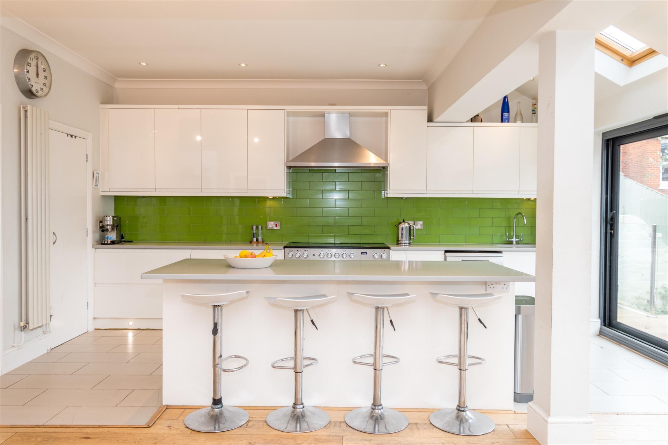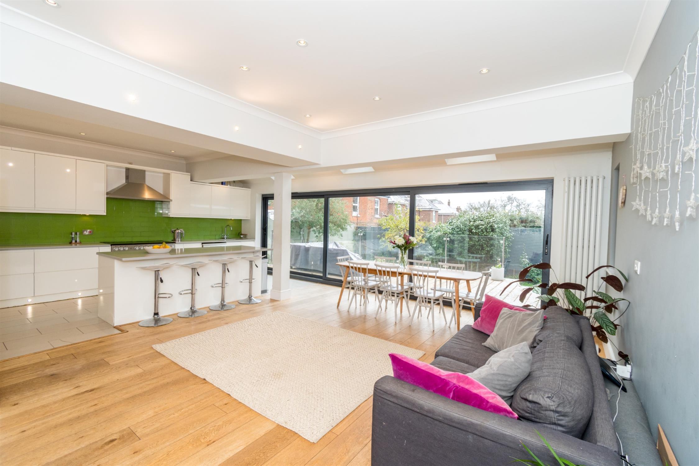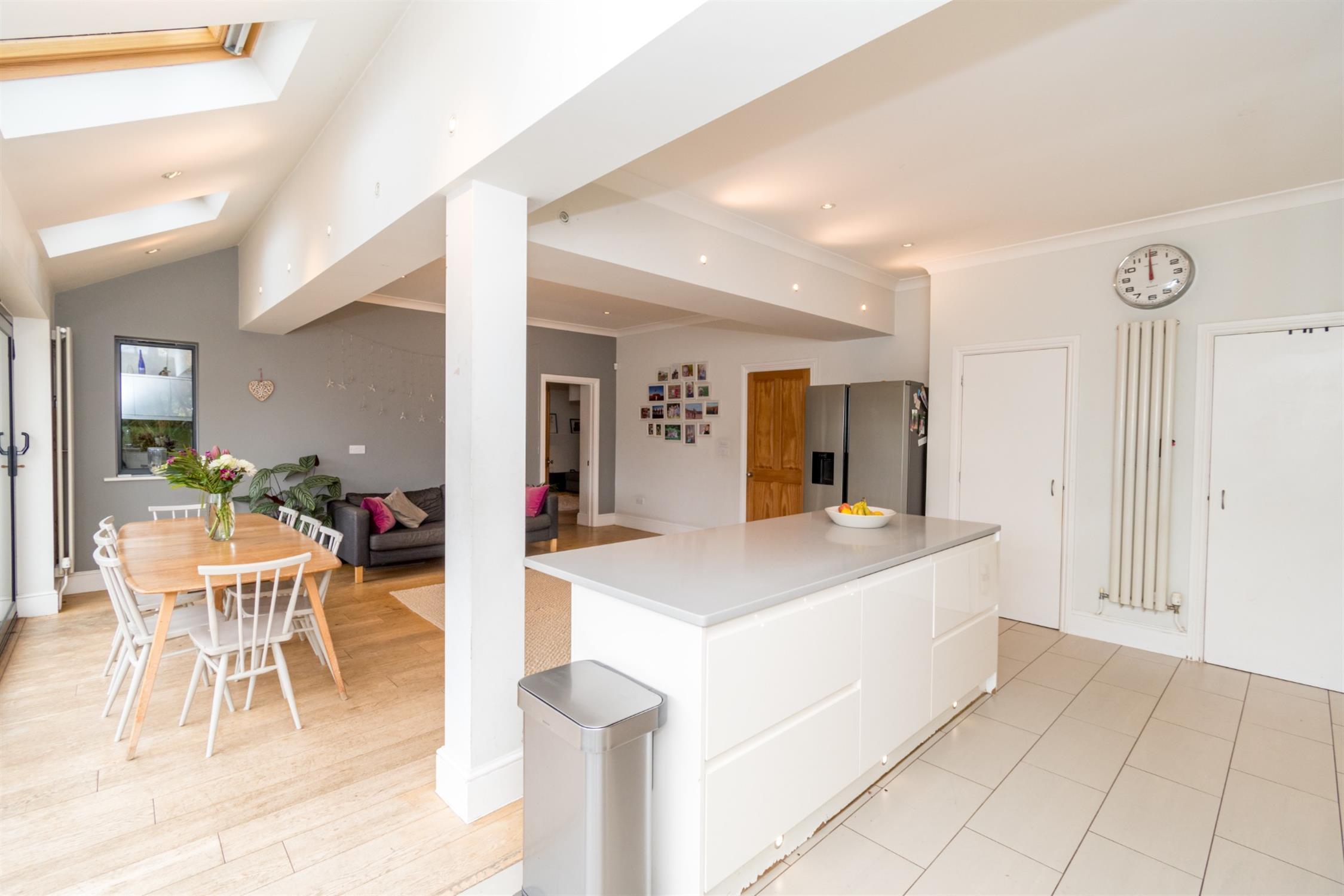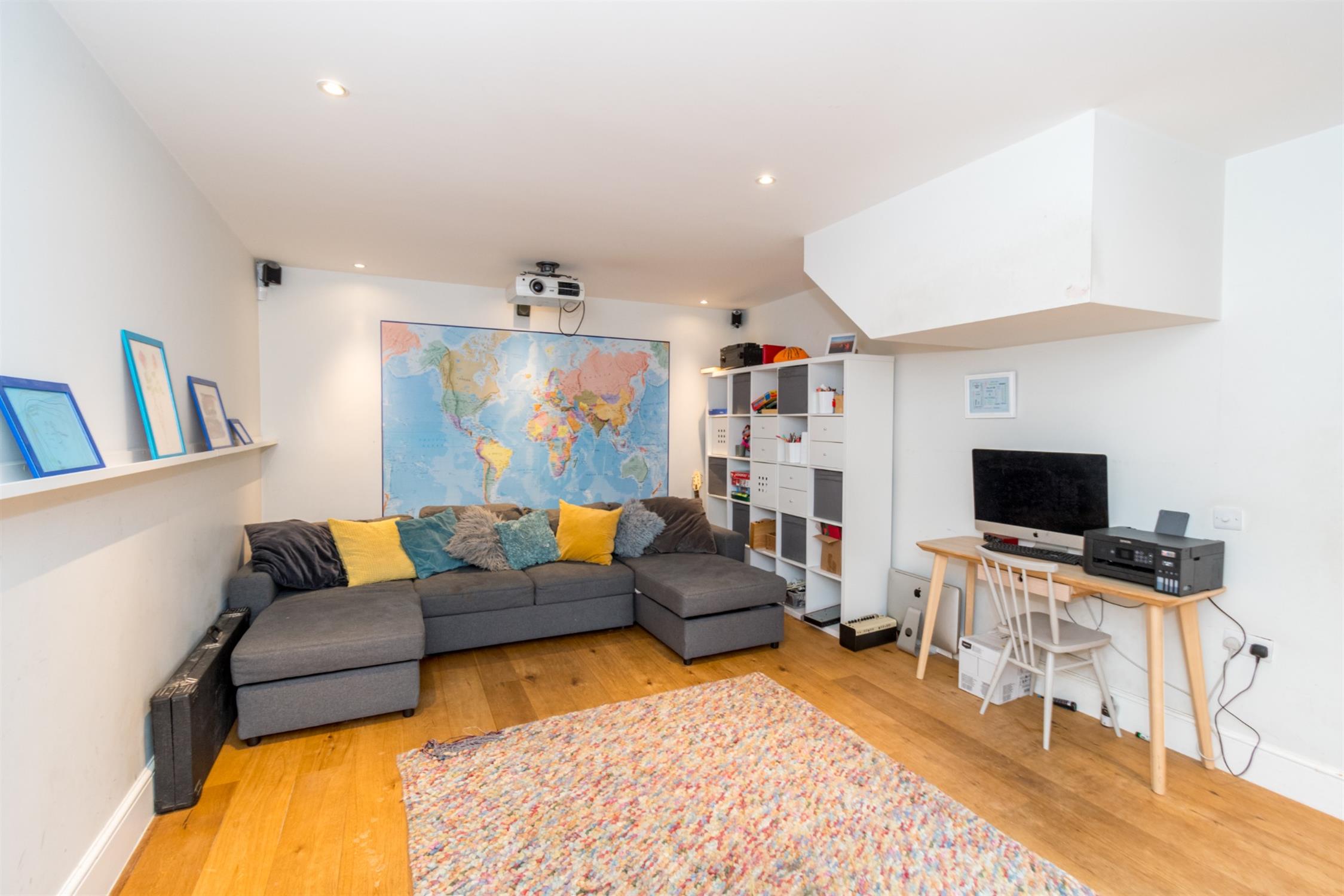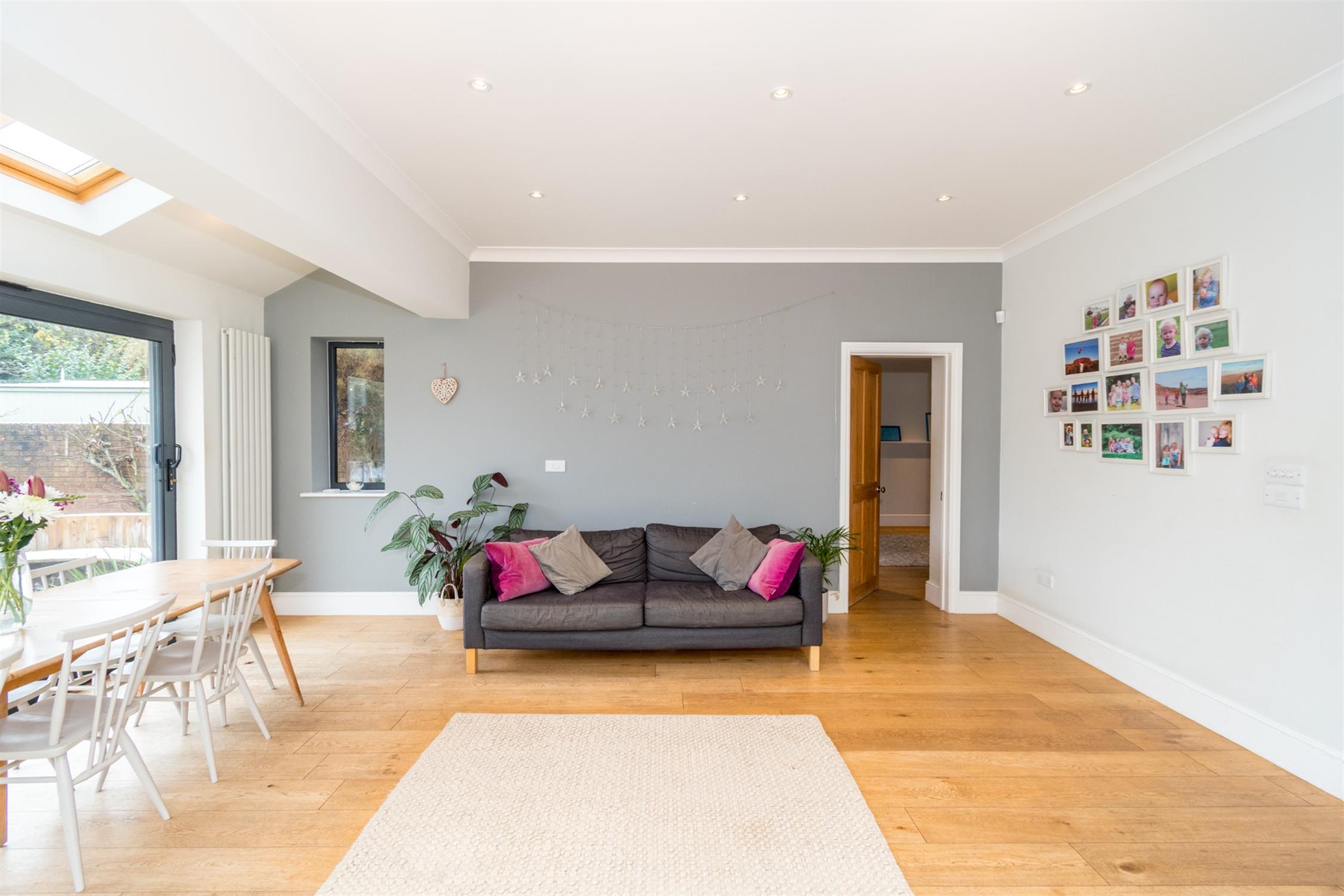 Double glazed French doors and double glazed side windows to rear aspect. Smooth ceiling with recessed lighting. Radiator. Wired-in speaker system for home cinema. Engineered wood flooring.