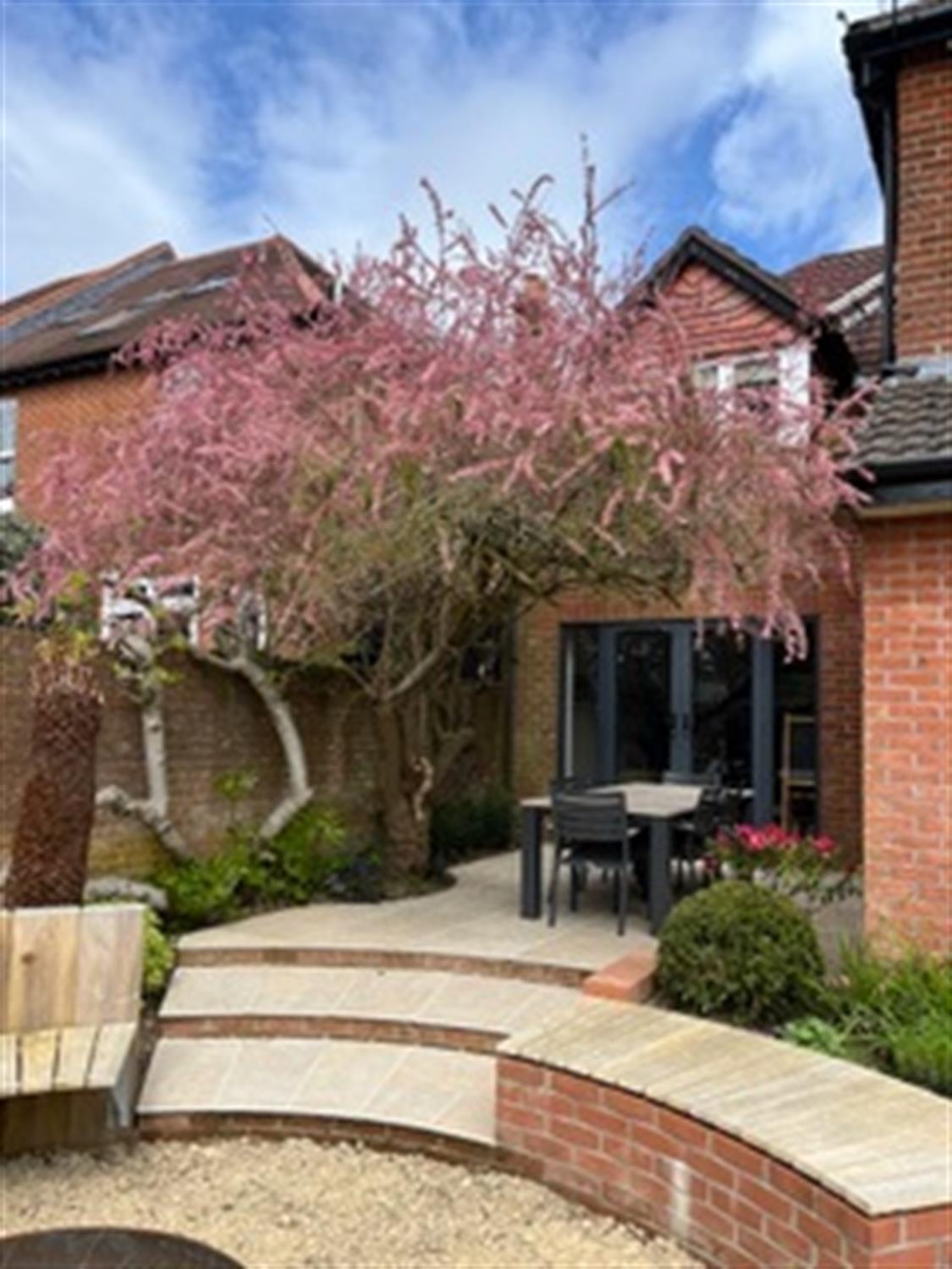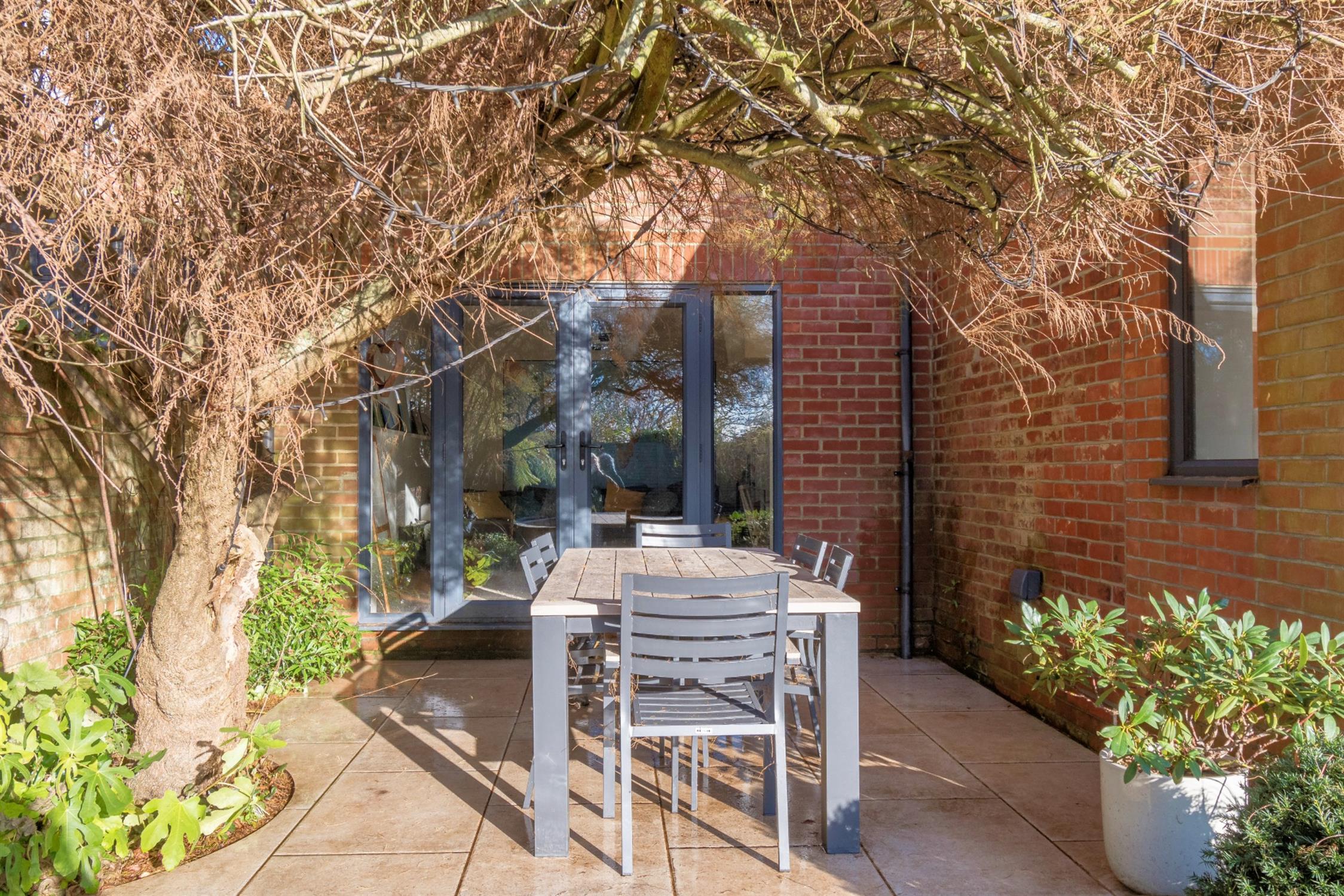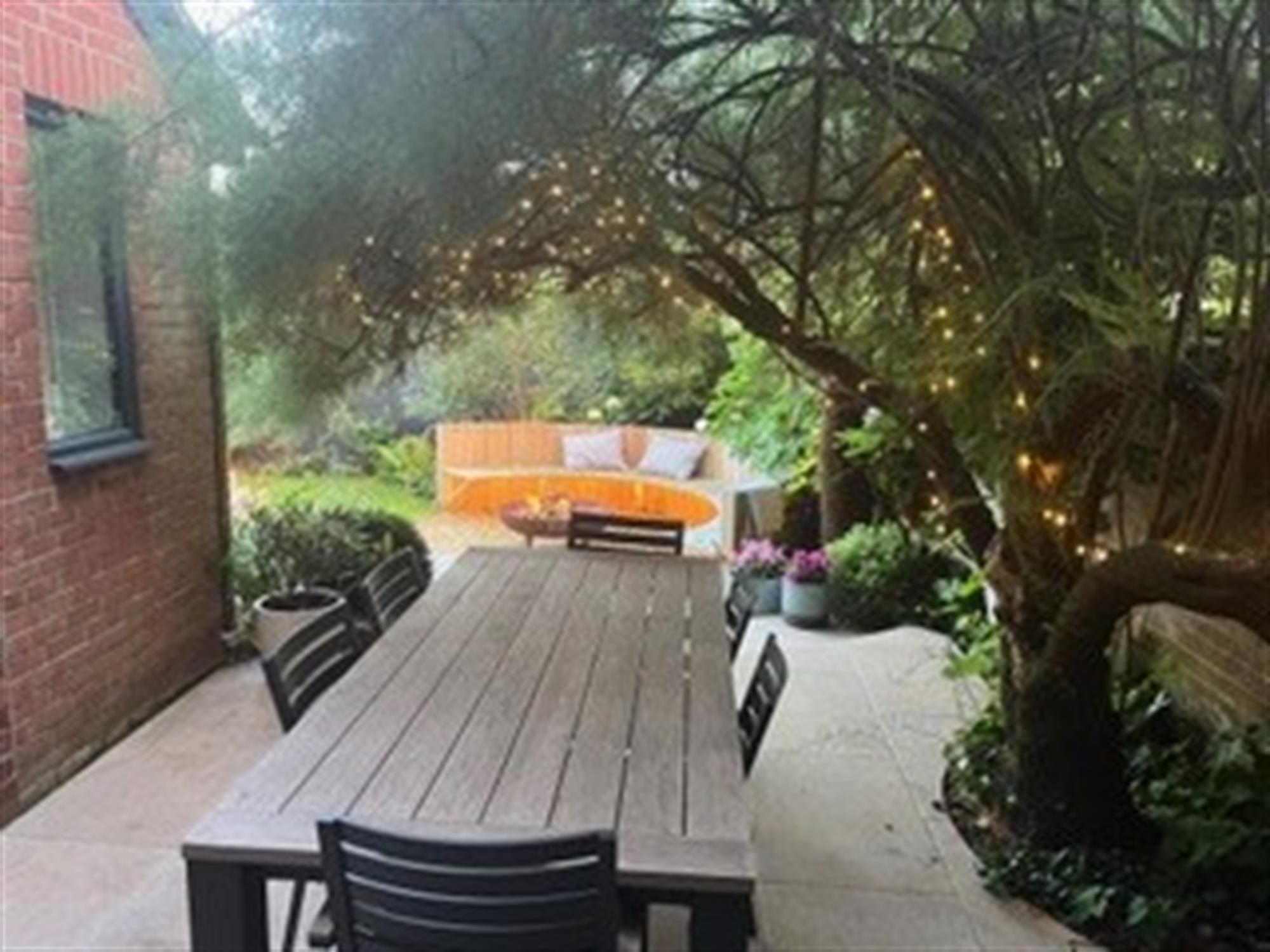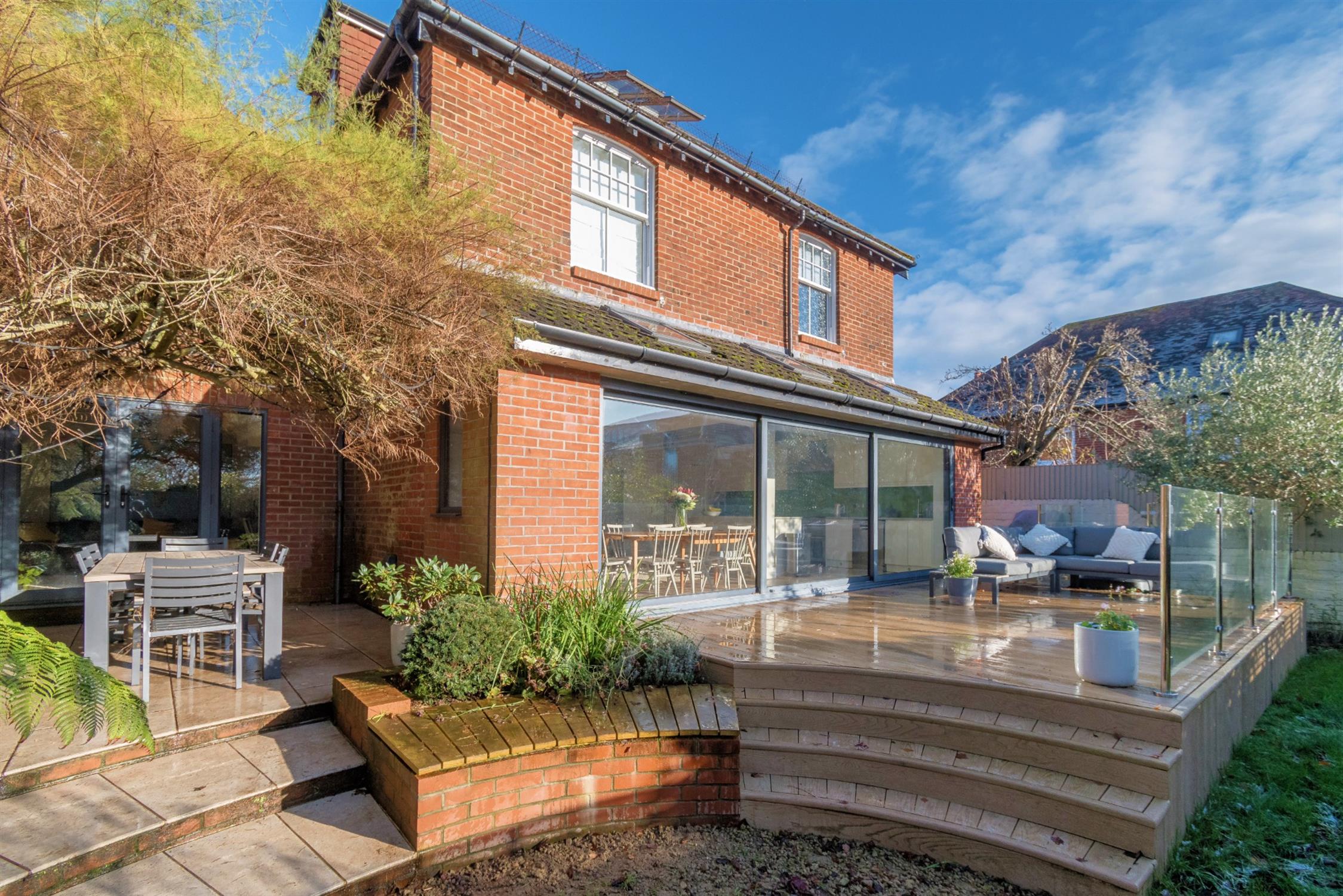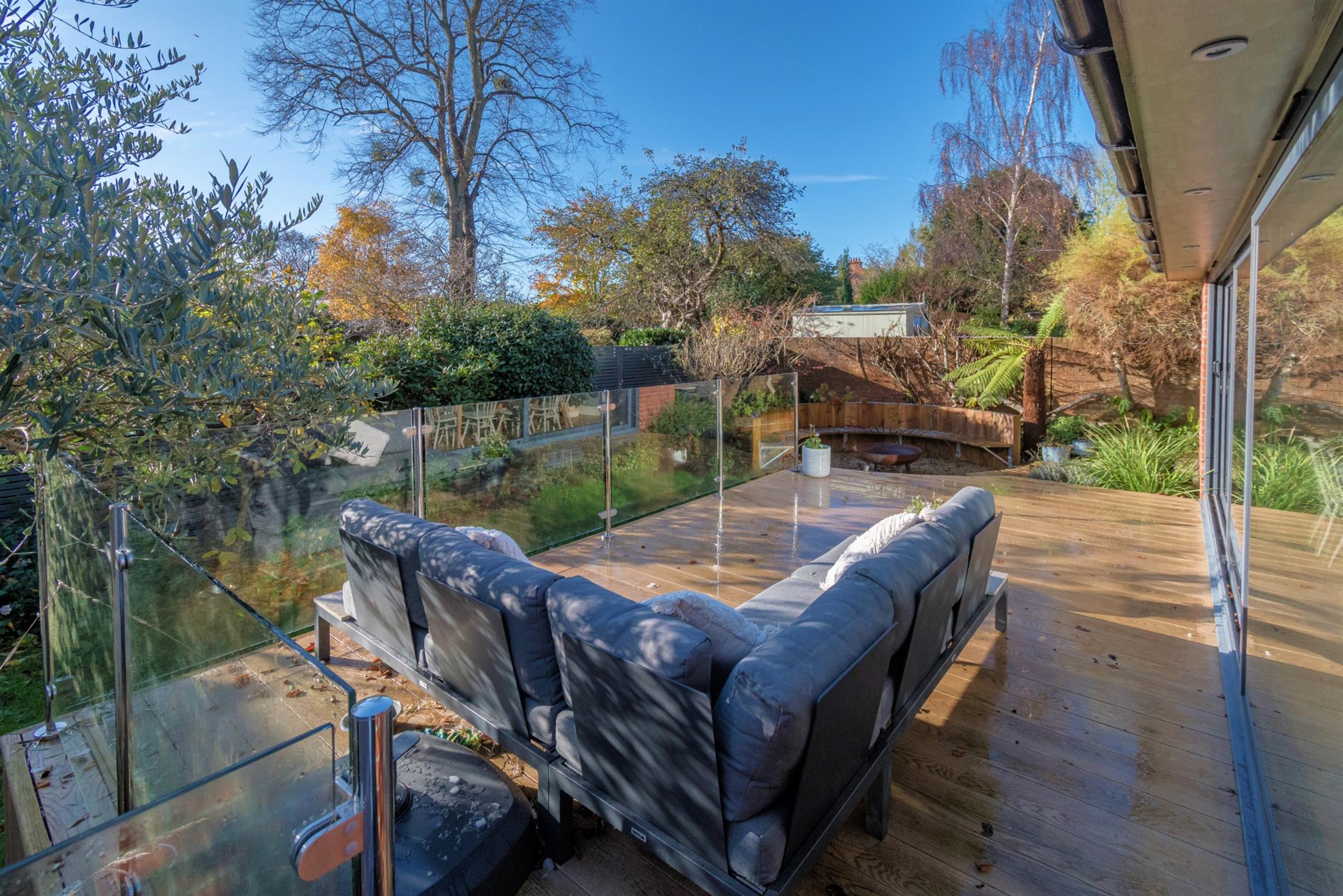 The rear garden is south facing and fully enclosed with established flower and shrub borders. Gated pedestrian access to the front. The garden has an outside patio dining area and fire pit with seating and additional decked area with glass balustrade and external power points.