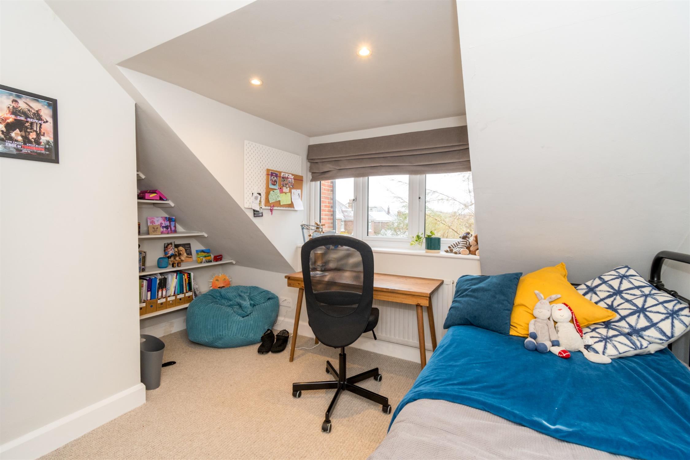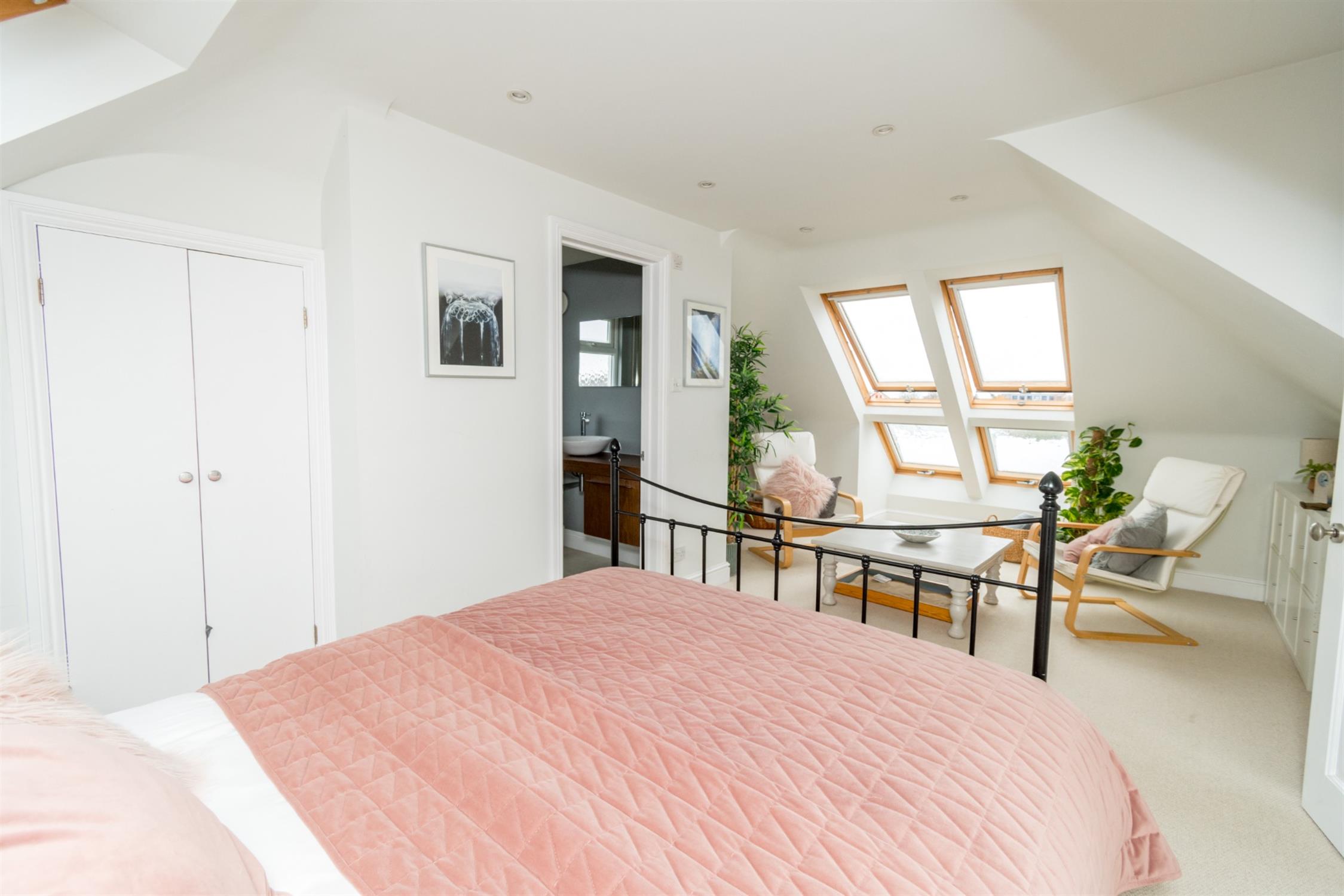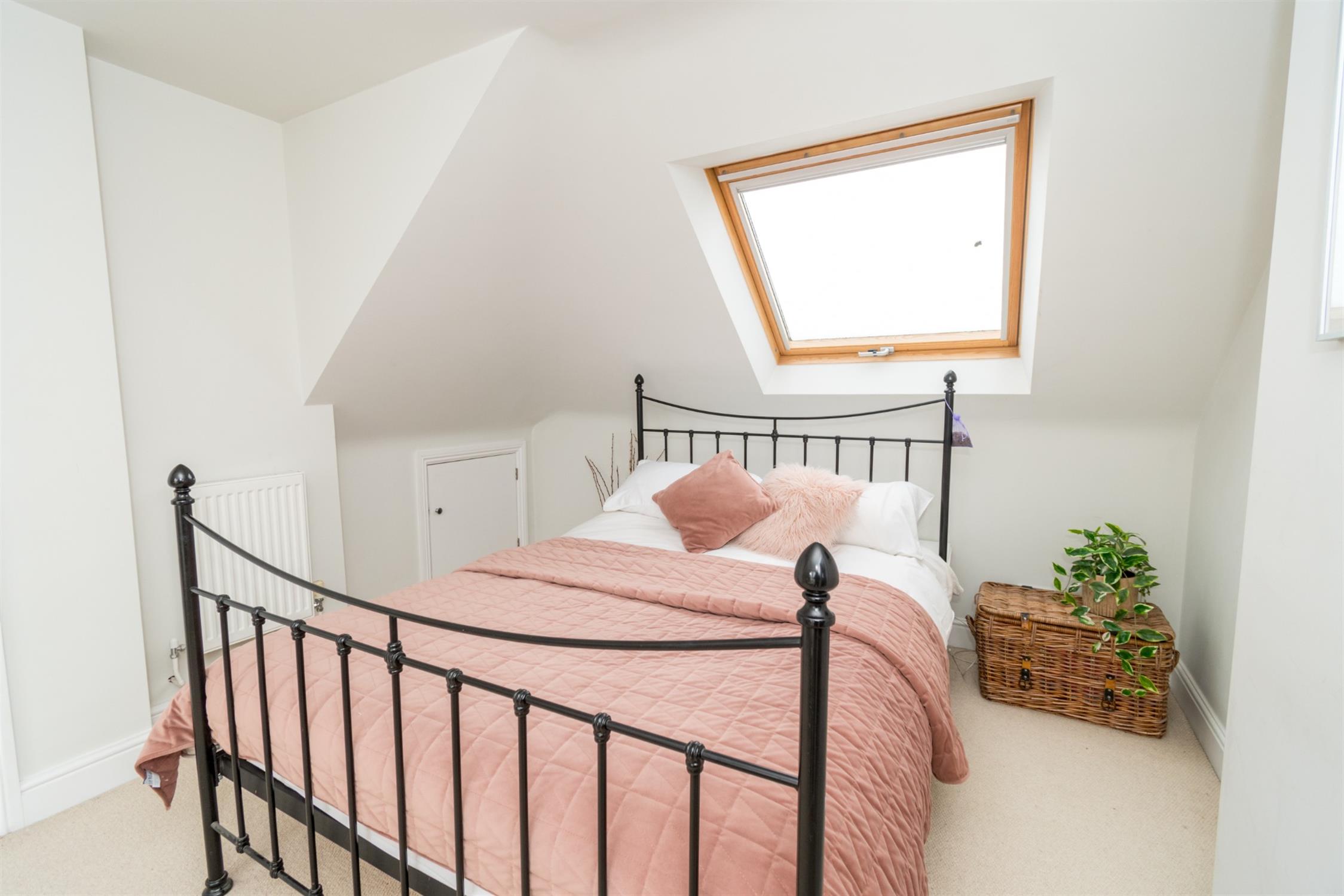 Double glazed velux windows to front and rear aspects. Smooth ceiling with recessed lighting. Built-in wardrobe. Access to eaves for storage. Radiator. Door to:-