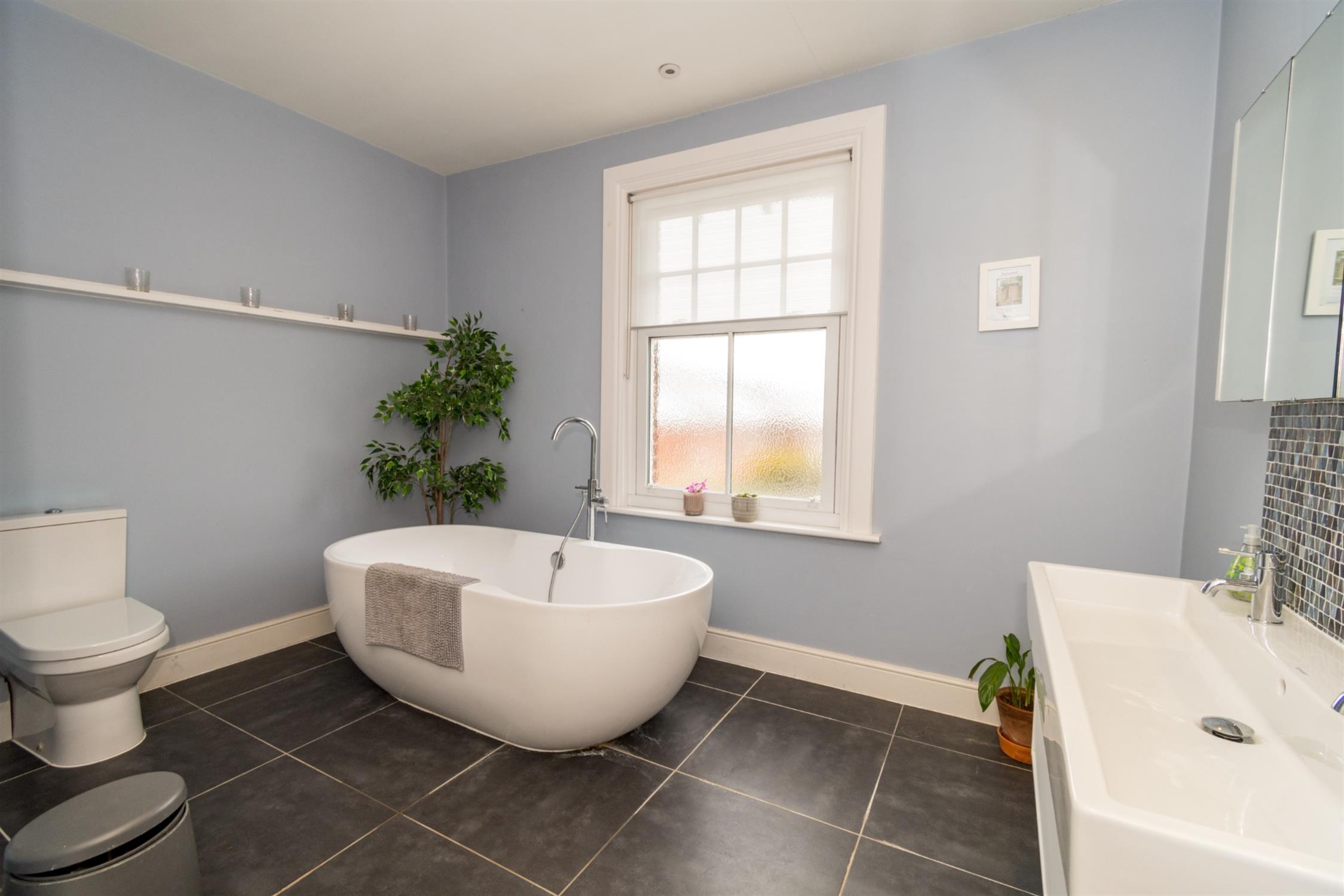 Double glazed obscure glass sash window to rear aspect. Smooth ceiling with recessed lighting. Free-standing roll top bath with central mixer tap and shower attachment, tiled shower cubicle and over-sized vanity wash basin with drawer under and low level flush w.c. Heated towel rail. Tiled flooring.