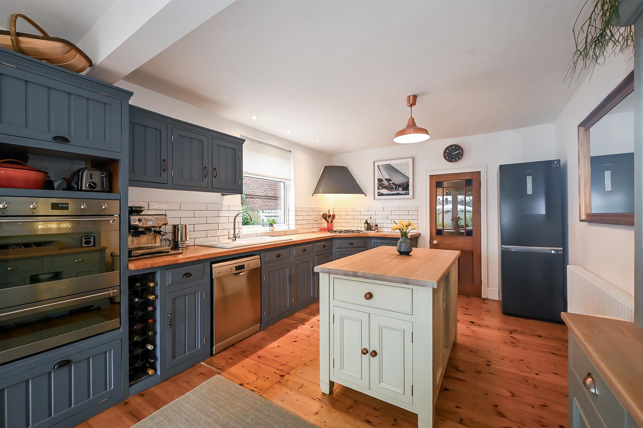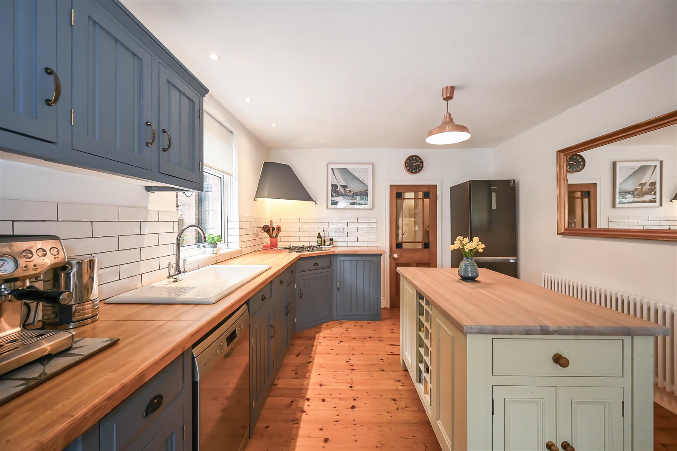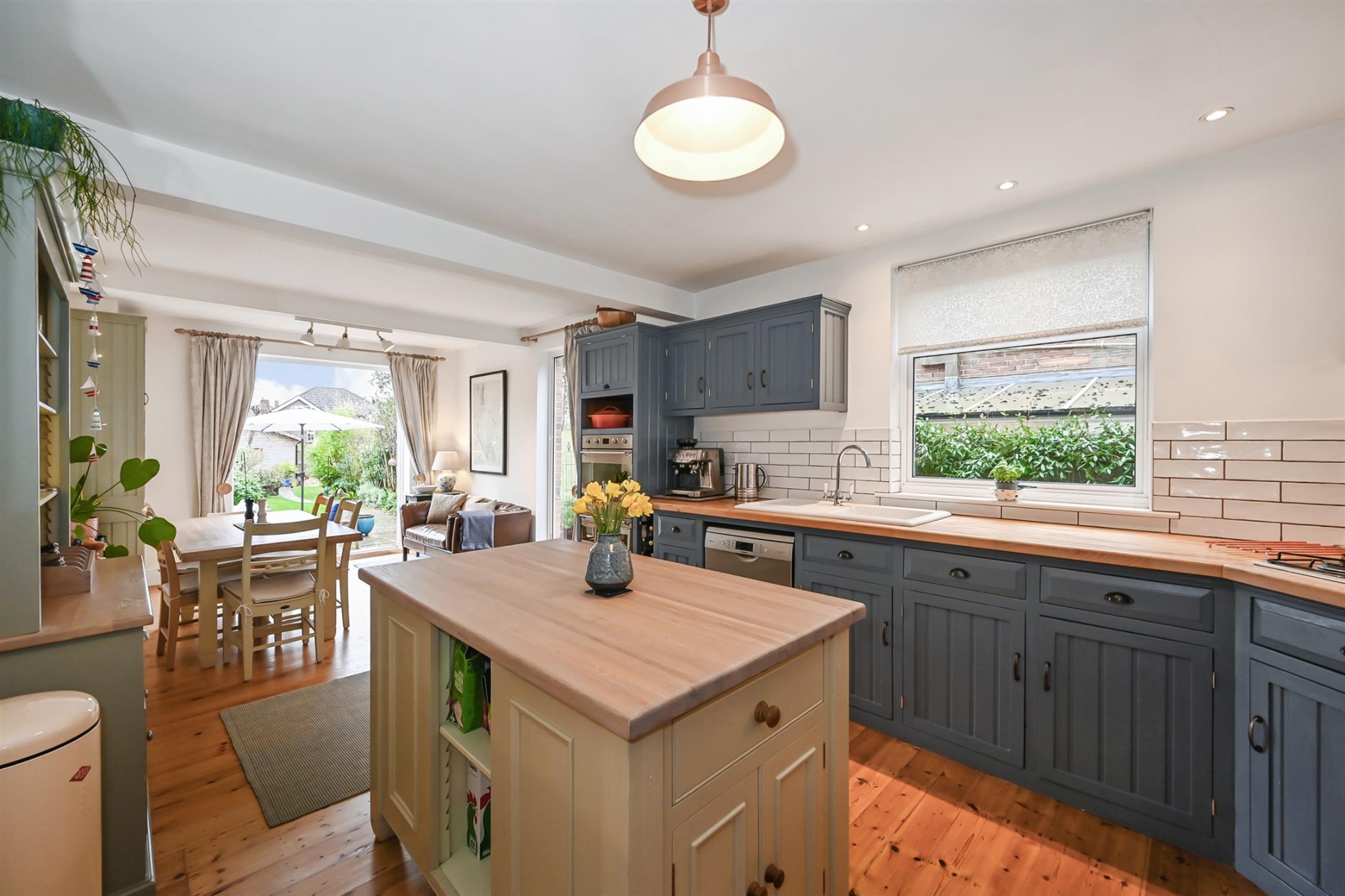 Double glazed French doors opening onto rear garden. Full height double glazed window to side aspect. Smooth ceiling with recessed lighting. Single drainer sink unit with swan neck mixer tap with cupboard under and double glazed window over to side aspect. A range of bespoke hand built solid timber matching eye level and base mounted units with roll top work surface over. Built-in double oven and fitted four ring gas hob. Space and plumbing for dishwasher. Space for fridge/freezer. Bespoke hand built cupboard housing wall mounted Worcester boiler.
