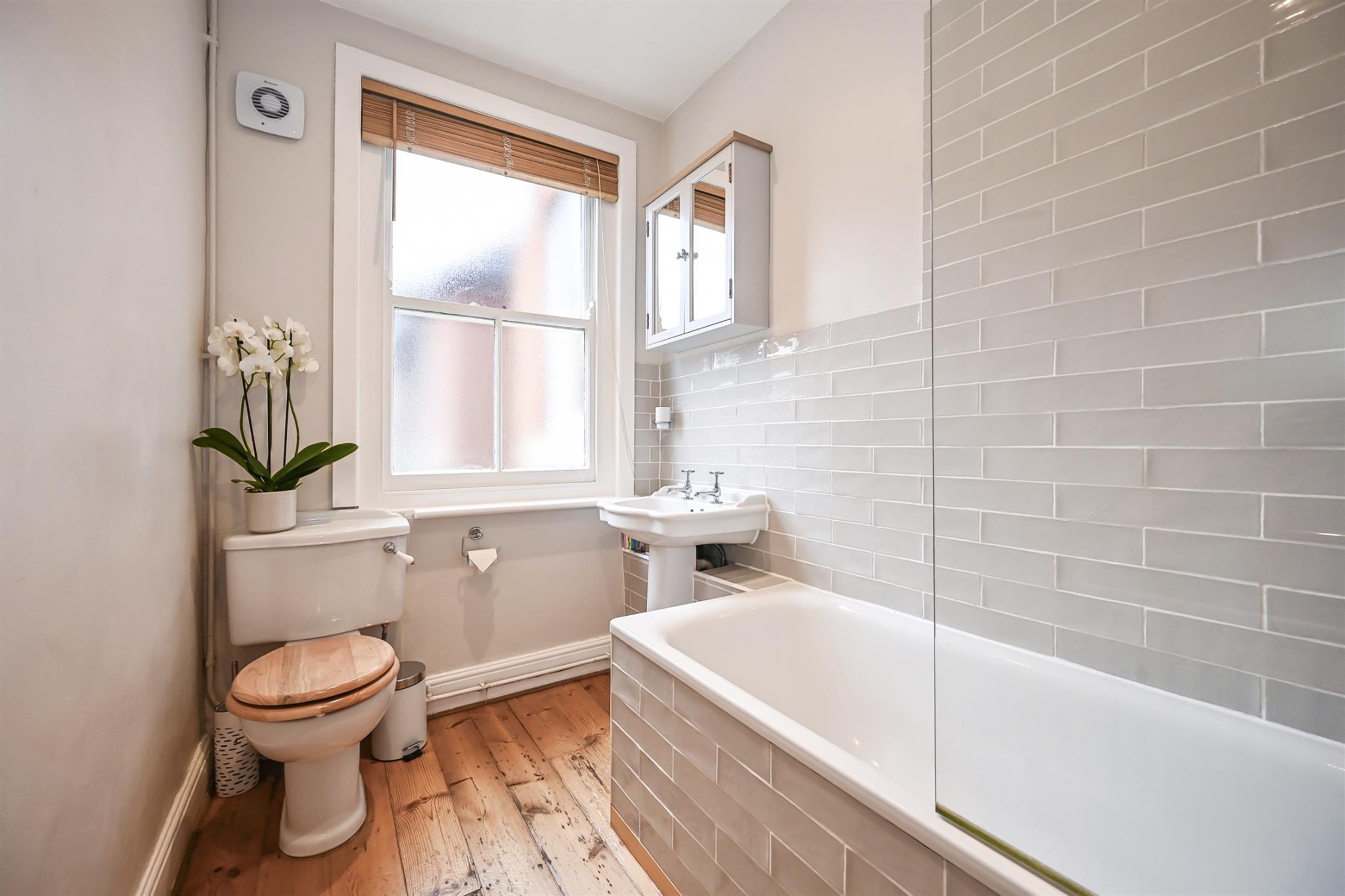 Obscure glass sash window to side aspect. Smooth ceiling with recessed lighting. Panel enclosed bath with shower over, pedestal wash basin and low level flush w.c. Extractor fan. Part tiled walls. Radiator. Stripped and polished floorboards.