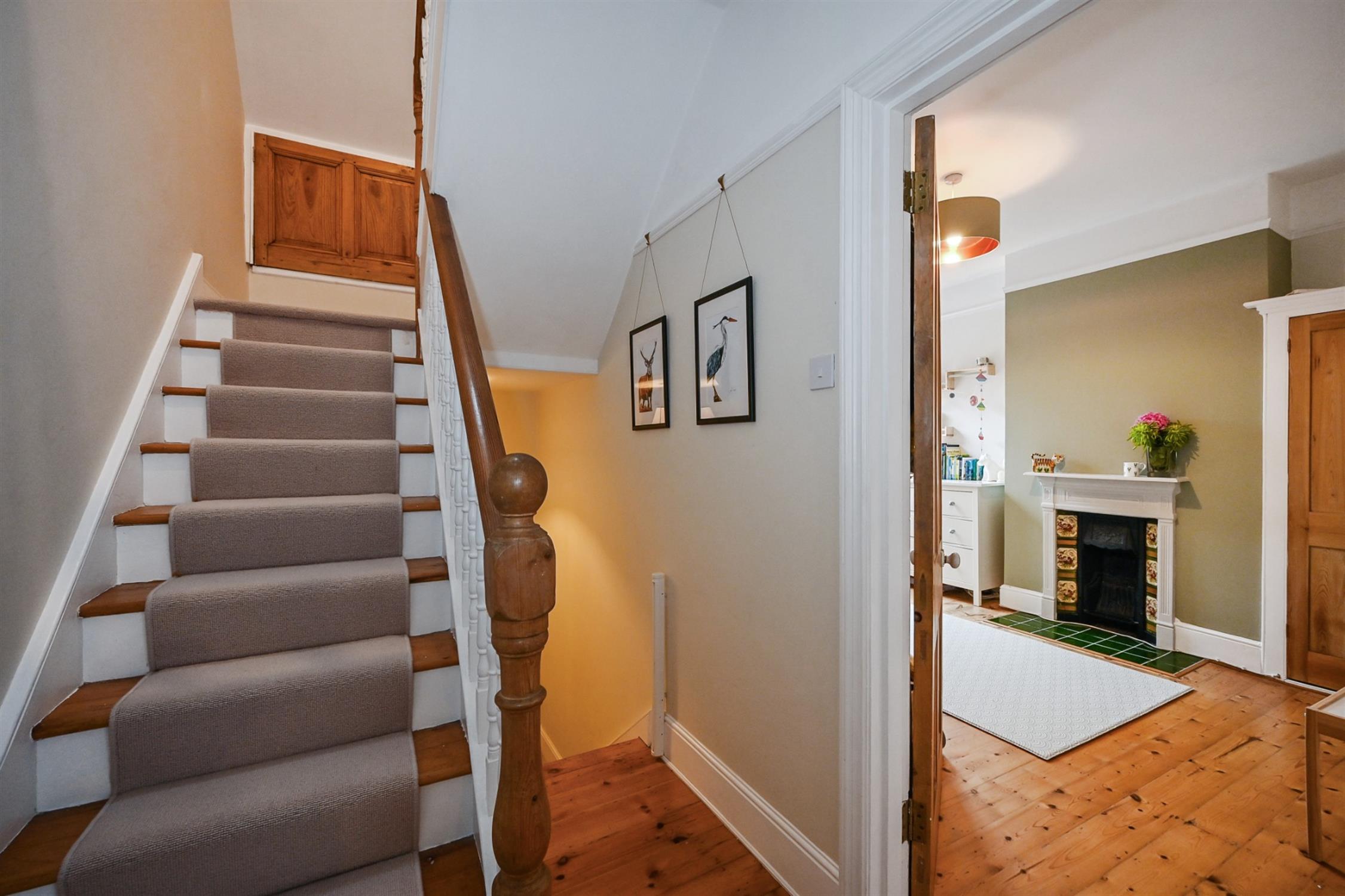 Period plaster coving to smooth ceiling. Picture rail. Moulded arch with plaster moulded buttresses. Stripped and polished floorboards. Radiator with bespoke hand built radiator cover and solid oak top. Stairs to first floor. Under stairs storage cupboard containing storage shelving, recently replaced consumer unit and gas meter. Doors to all rooms.