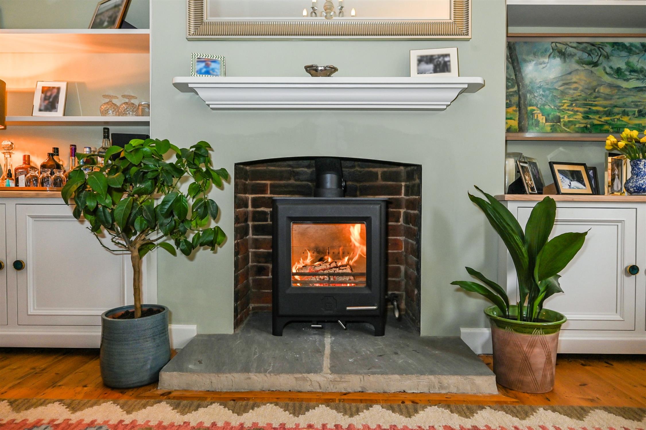 Sash bay window to front aspect. Period plaster coving to skimmed ceiling. Ornate ceiling rose. Picture rail. Stripped and polished floorboards. Multi-fuel burner (Woodwarm 5kw eco). Stone hearth and bespoke fireplace shelf. Bespoke hand made cupboards with solid oak worktops and overhead sawtooth adjustable shelves into chimney recesses. Two radiators with bespoke hand built radiator cover with solid oak top. Double multi paned internal doors leading to:-