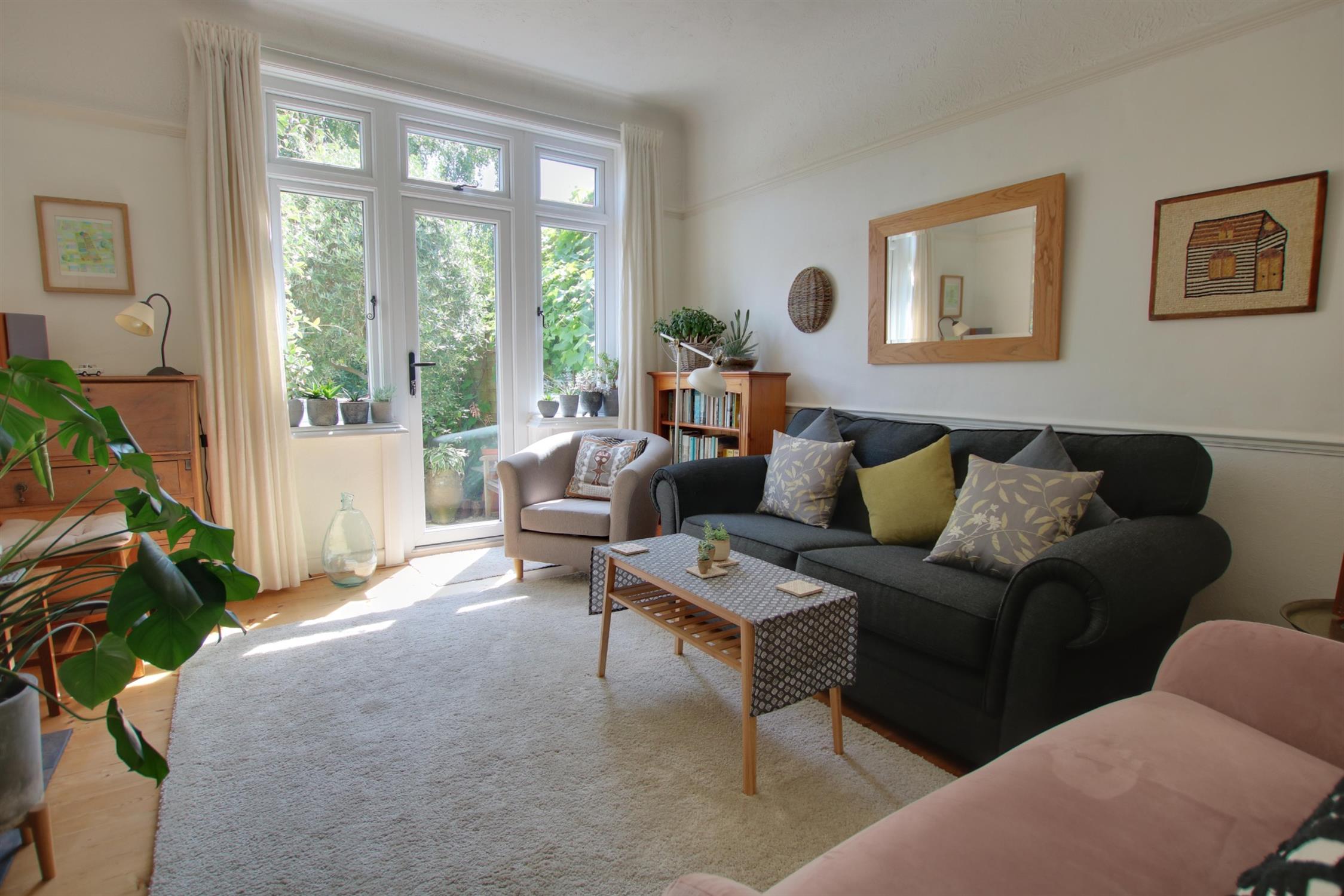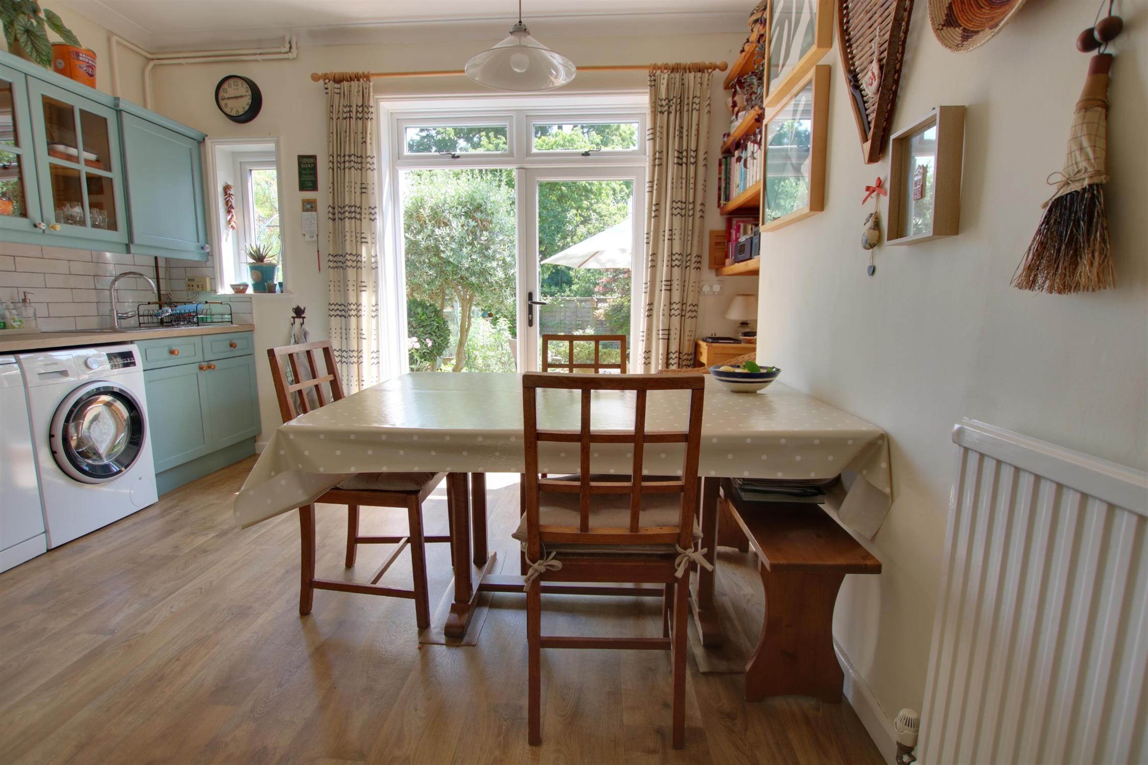 Double glazed window with double glazed door opening onto rear garden. Textured ceiling. Picture rail. Feature fireplace. Floating shelves to chimney recess. Radiator. Stripped wood flooring.