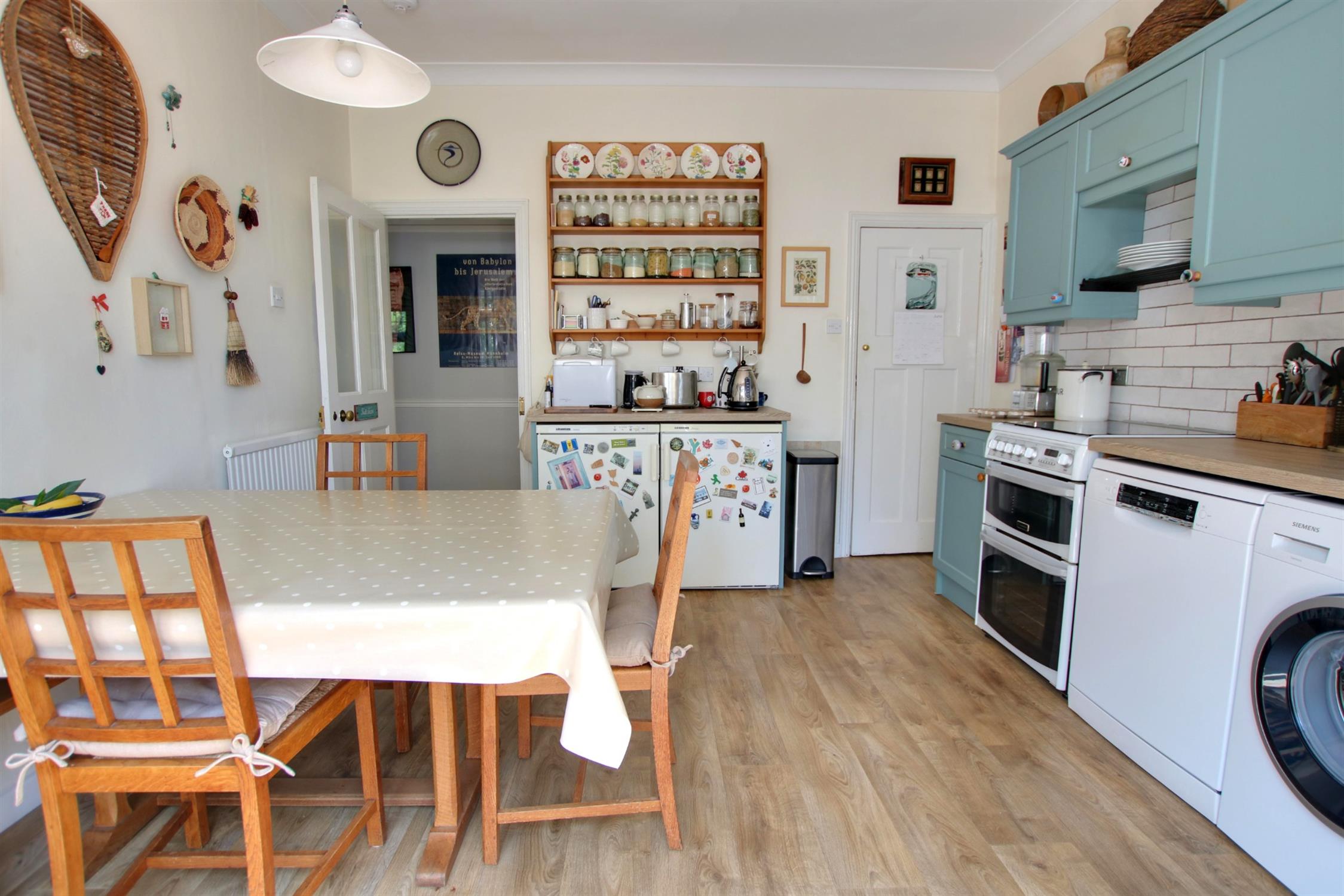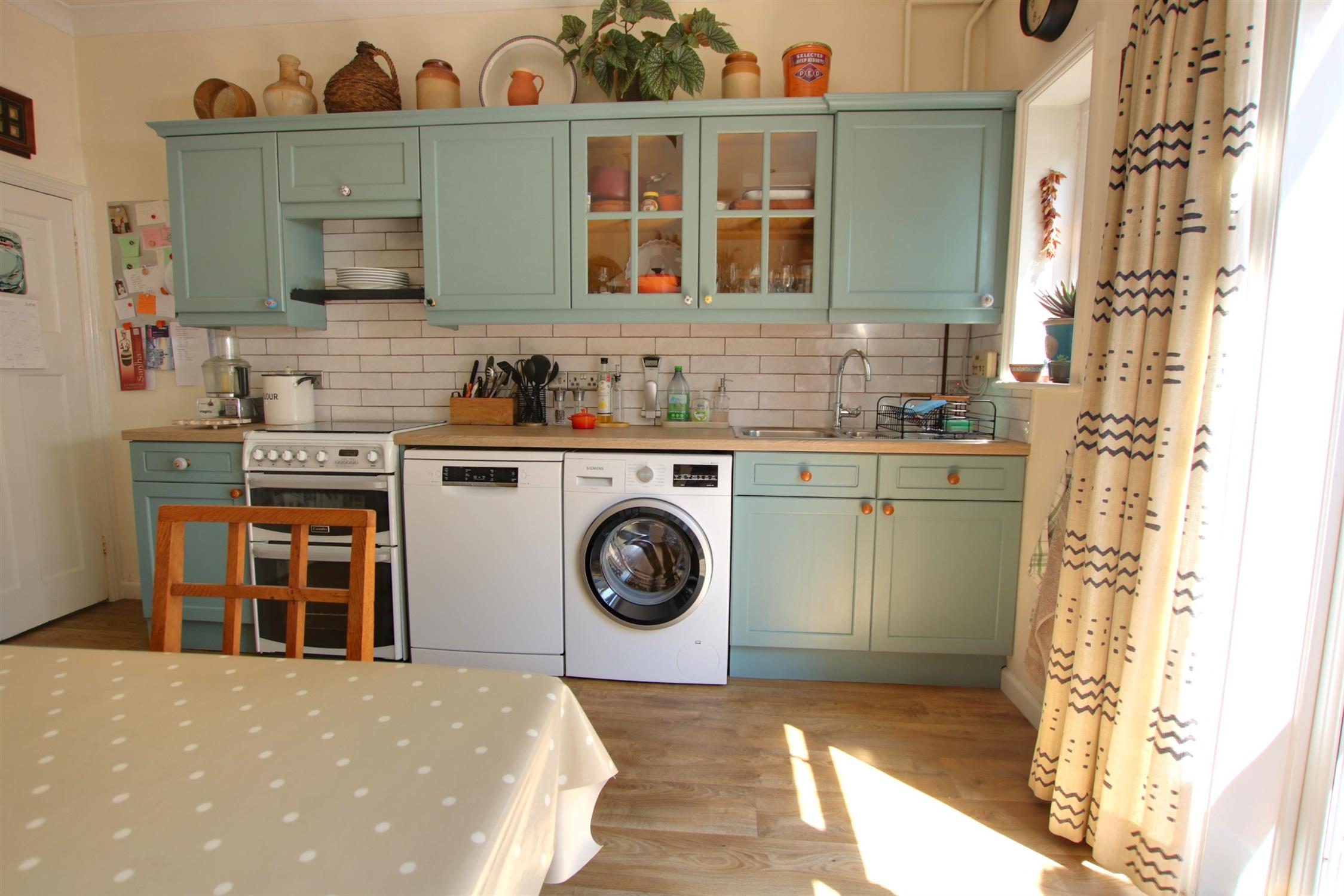 Double glazed French doors opening onto rear garden. Double glazed window to rear aspect. Coving to smooth ceiling with LED recessed lighting. Single drainer one and a half bowl sink unit with mixer tap and cupboard under. A range of matching eye level and base mounted units with roll top work surface over. Space for cooker. Space and plumbing for washing machine and dishwasher. Space for under counter fridge and freezer. Walk-in larder.