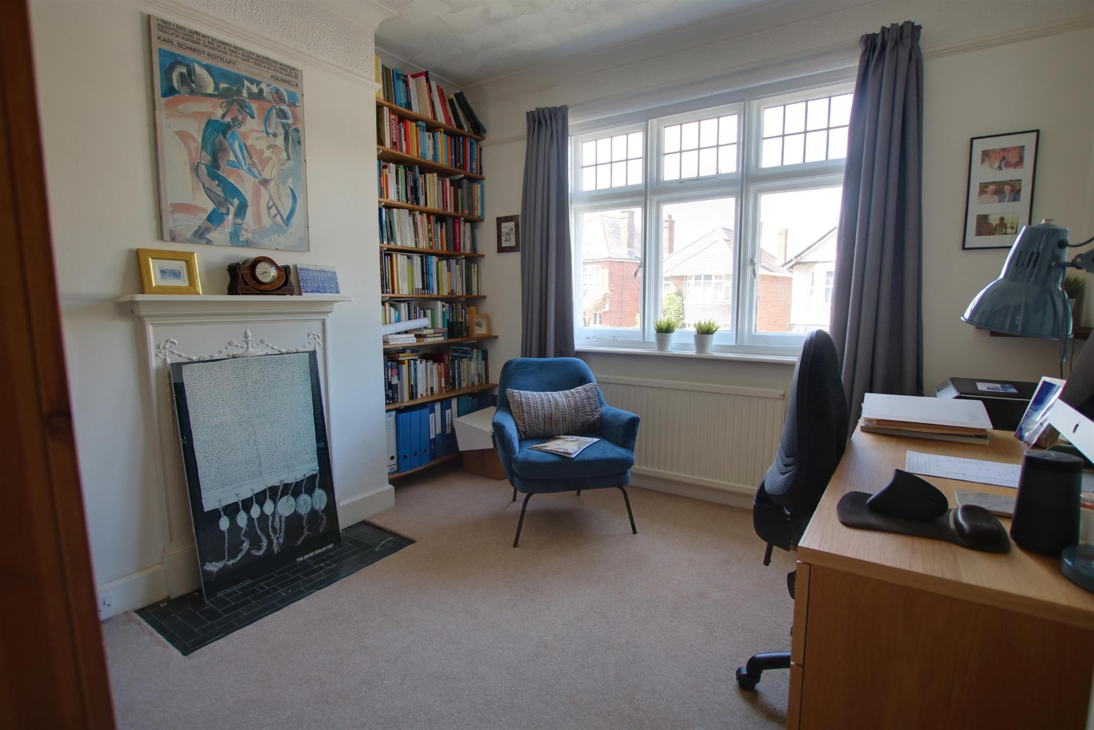Bay window with secondary glazing to front aspect. Textured ceiling. Picture rail. Feature fireplace. Fitted shelving and cupboard to chimney recess. Stripped wood flooring. Radiator.