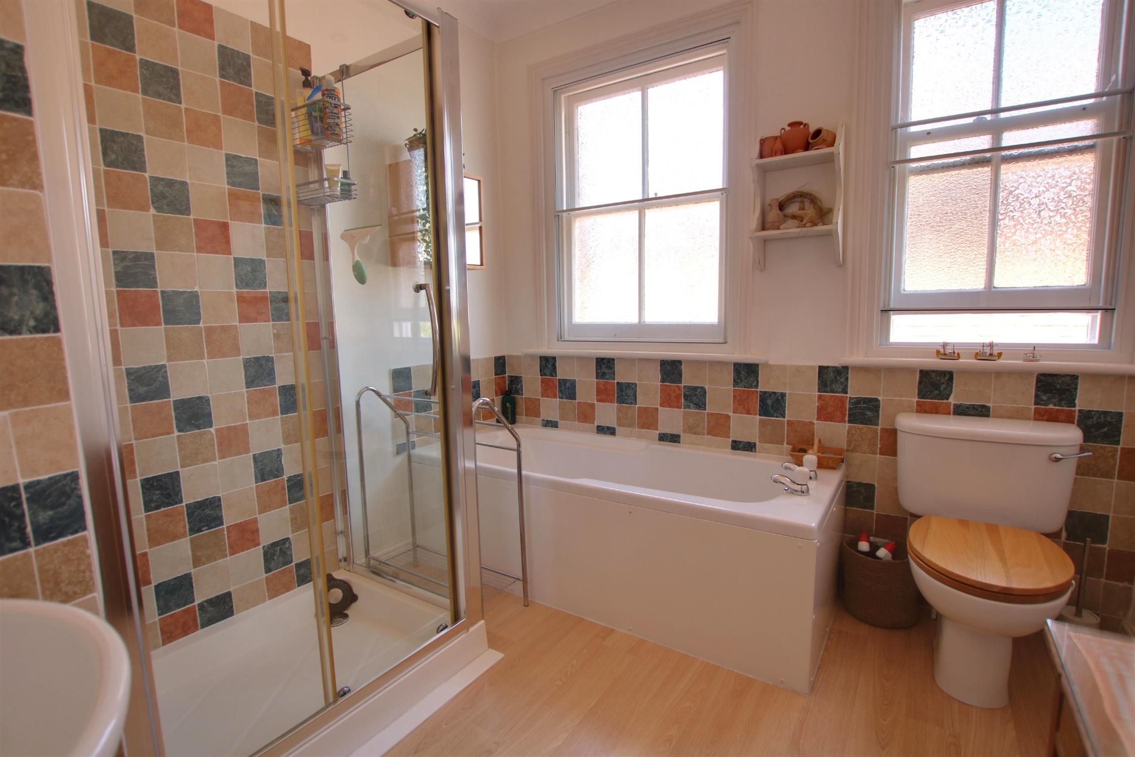 Two secondary double glazed obscure glass sash windows to side aspect. Coving to smooth ceiling with recessed LED lighting. Extractor. Tiled shower cubicle, wash basin with mixer tap, panel enclosed bath and low level flush w.c. Radiator.
