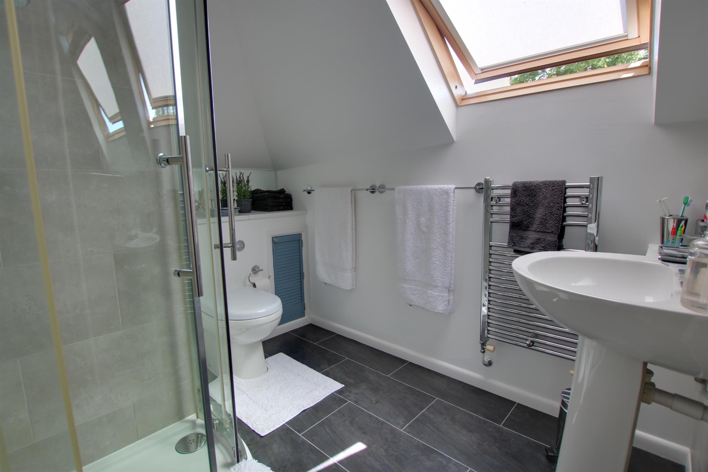 Double glazed velux window to rear aspect. Smooth ceiling with LED lighting. Extractor. Tiled shower cubicle, concealed cistern w.c. and wash basin. Heated towel rail.