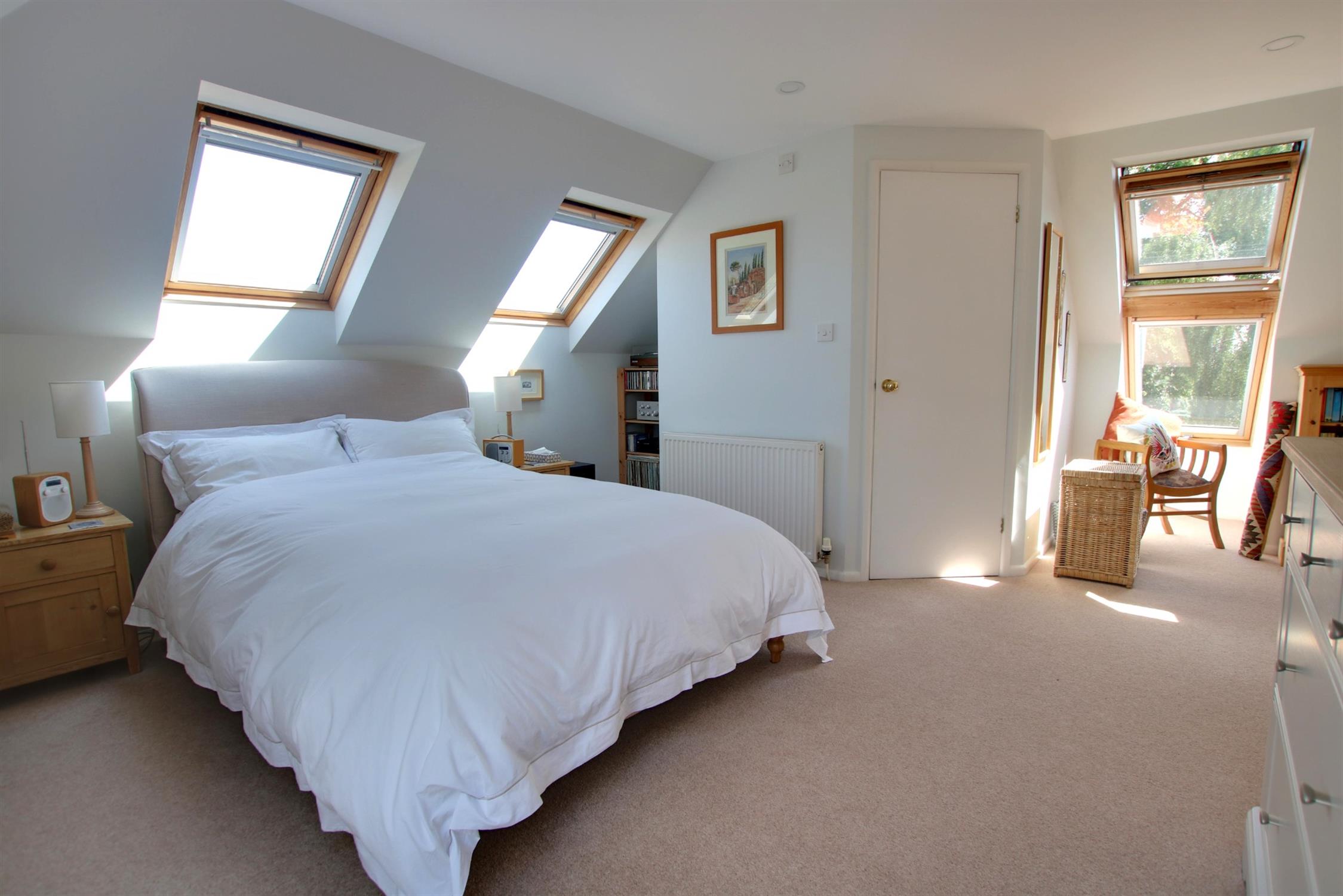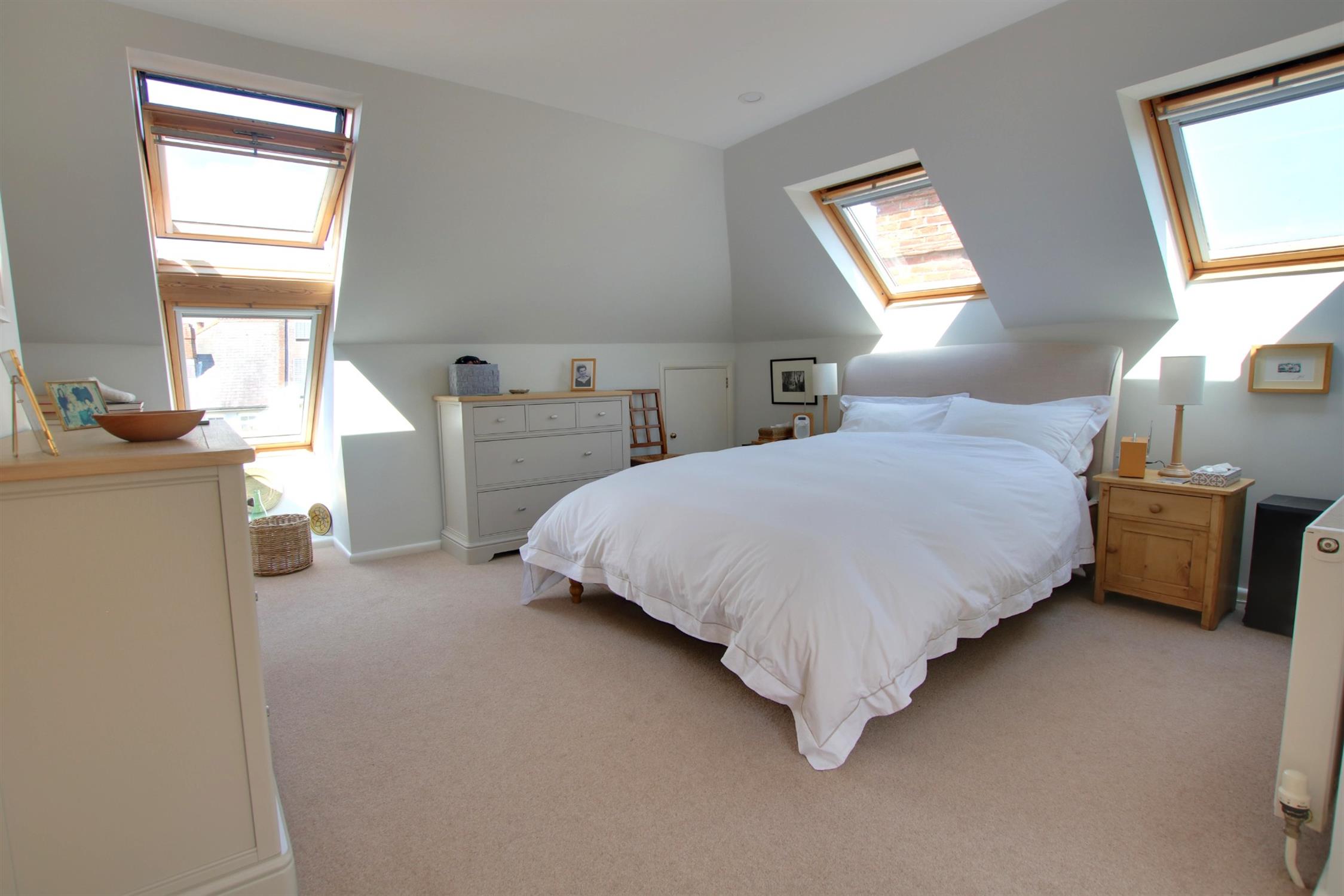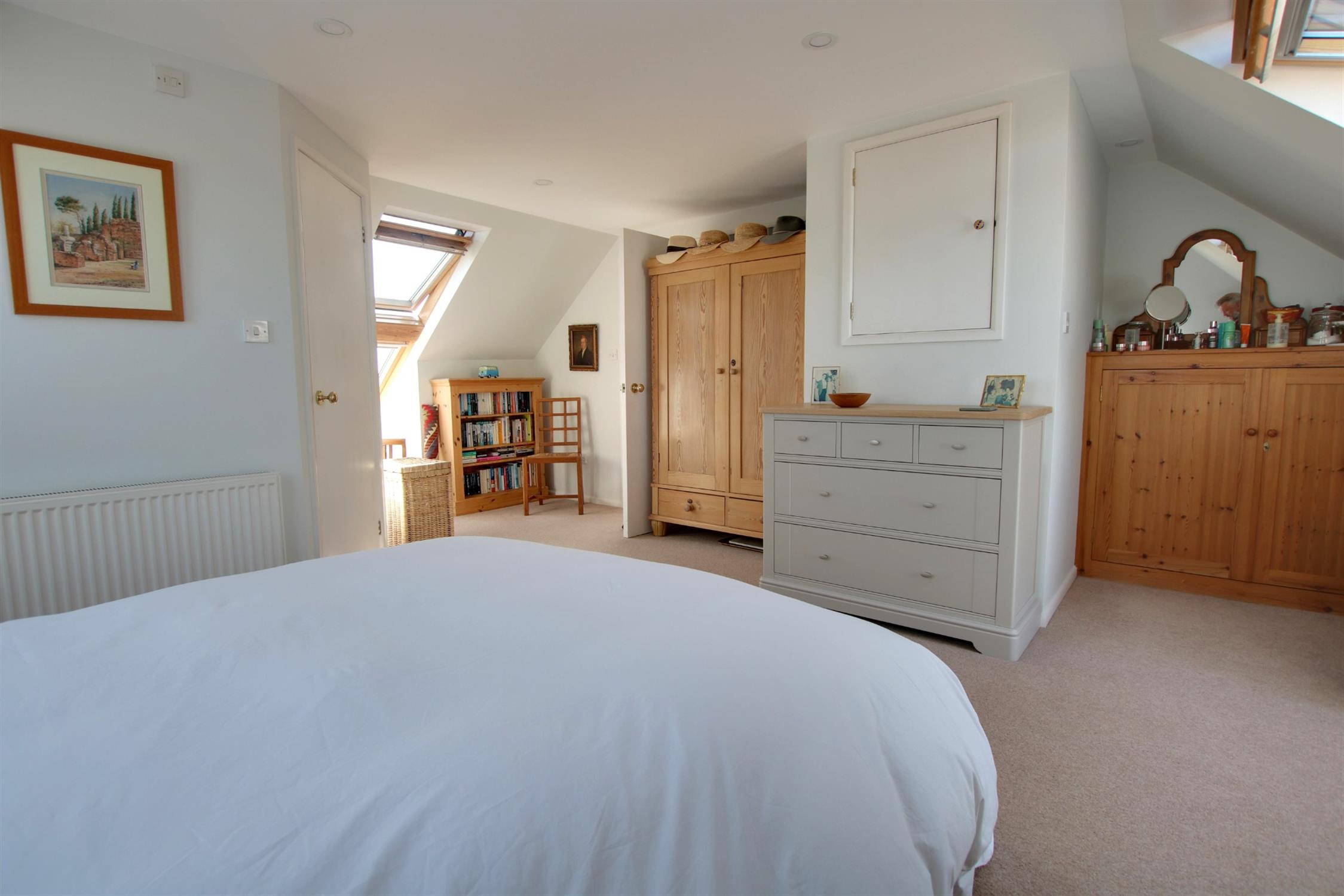 Double glazed velux windows to front, rear and side aspects. Smooth ceiling with recessed LED lighting. Fitted cupboards. Radiator. Access to eaves for storage. Door to:-