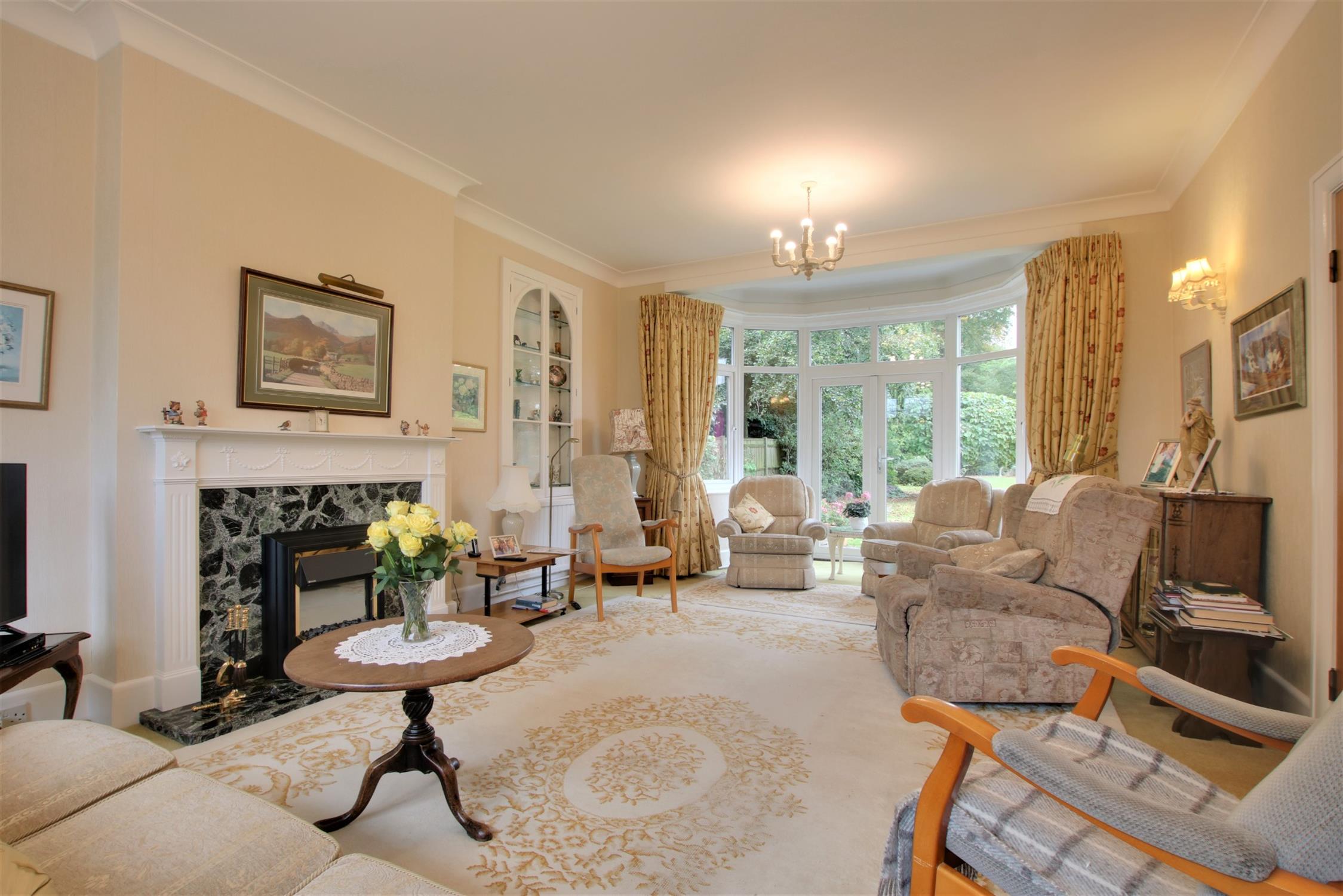 Superb dual aspect room with double glazed window to front elevation. Double glazed windows and double glazed double doors forming bay to rear elevation. Three radiators. Two glazed display cabinets with shelving. Feature fireplace with electric fire and stone backdrop hearth. The owners have advised that the fireplace could be opened again if preferred.