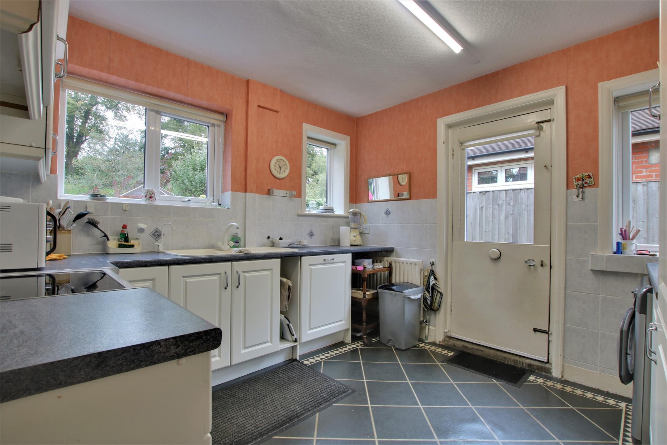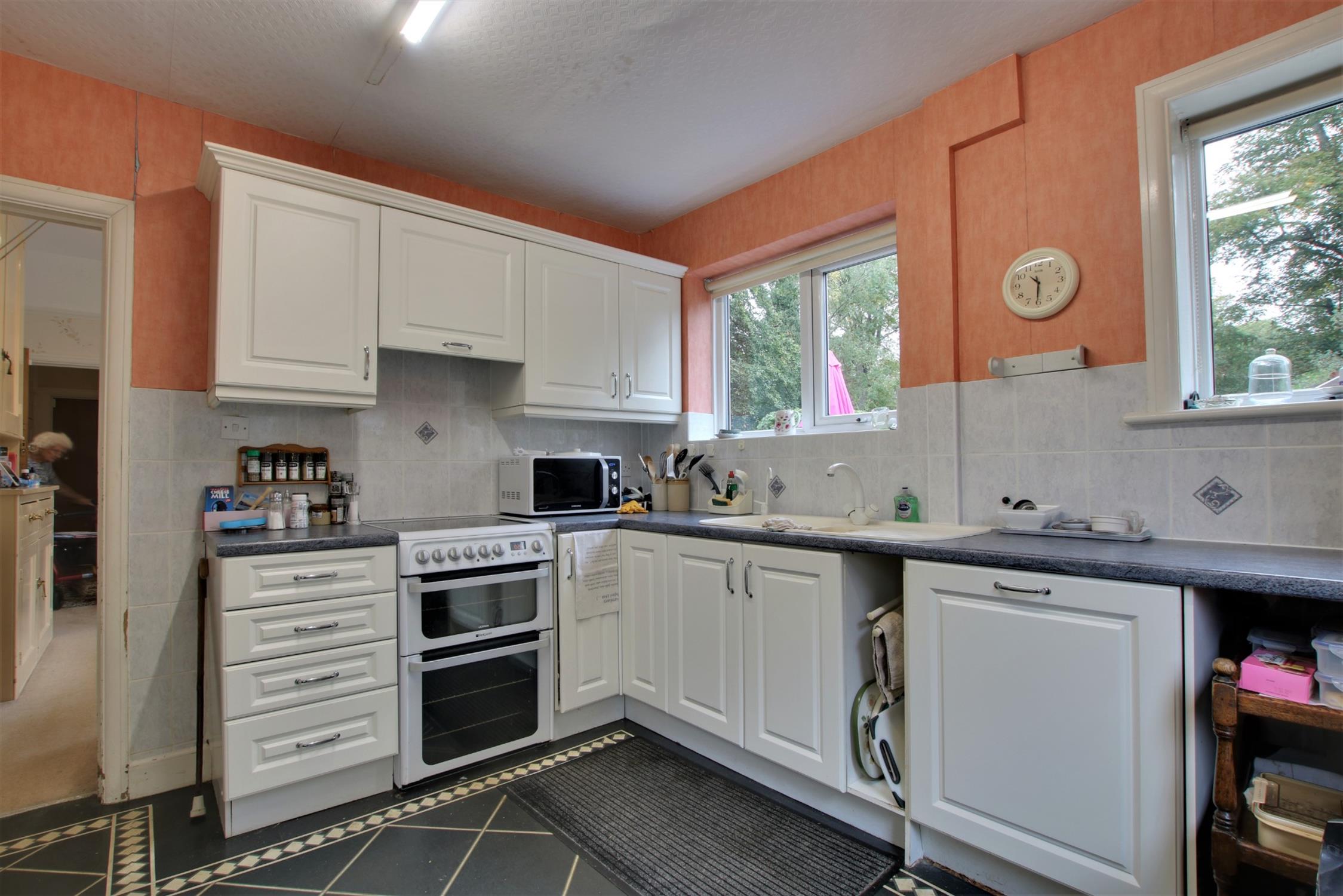 A comprehensive fitted range of units to include one and a half bowl single drainer sink unit with mixer tap fitting. Tiled splash backs to worktop surfaces and suitable space for slot-in cooker. Two double glazed windows. Further double glazed door and window to side elevation. Space and plumbing for automatic washing machine. Panel door leading to attached garage.