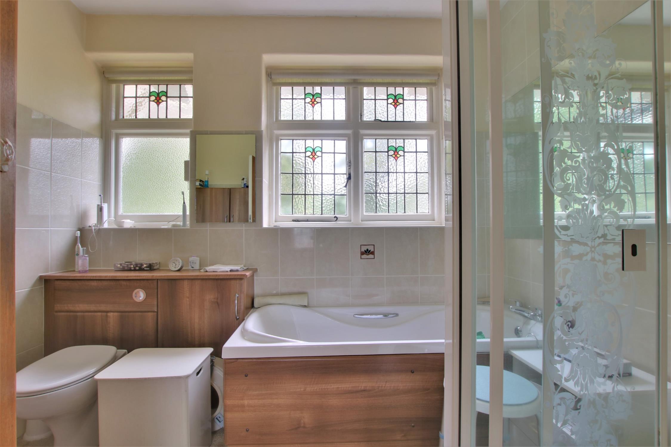 Refitted suite comprising of panel bath with separate shower cubicle, low level WC, vanity hand basin, two obscure glazed windows with leaded lighting and stained glass features. Tiling, heated towel rail radiator combination. Access to loft space. The loft benefits from insulation.