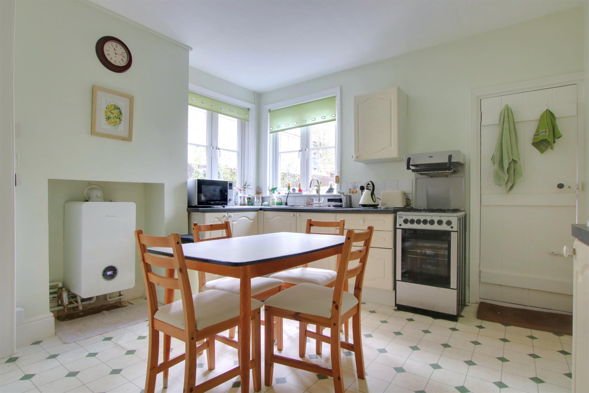 Fitted range of eye and base level units to include one and a half bowl single drainer sink unit with mixer tap fitting and filter tap.. Wall mounted Worcester central heating boiler. Large built-in storage cupboard. Two double glazed windows. Gas cooker point. Radiator. Door to:-