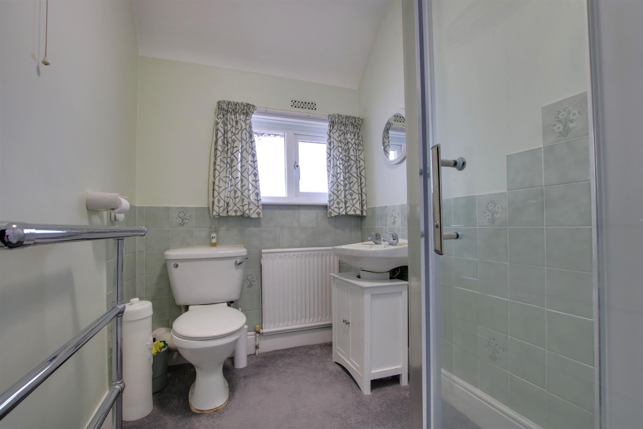 Three piece suite comprising; double width shower, separate hand basin and low level w.c. Heated towel rail. Obscure double glazed window. Smooth plastered ceiling.