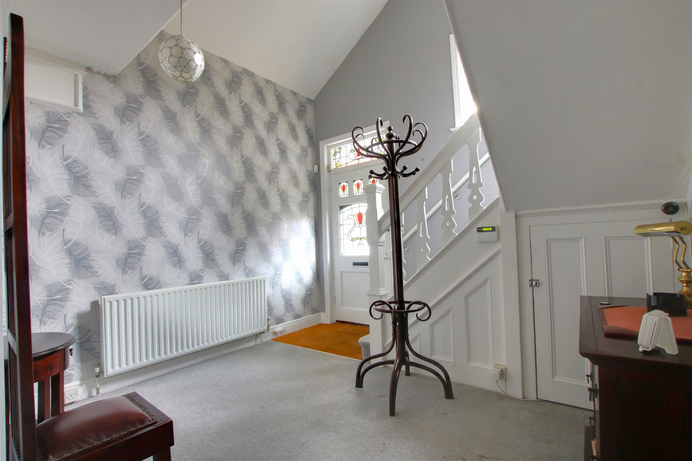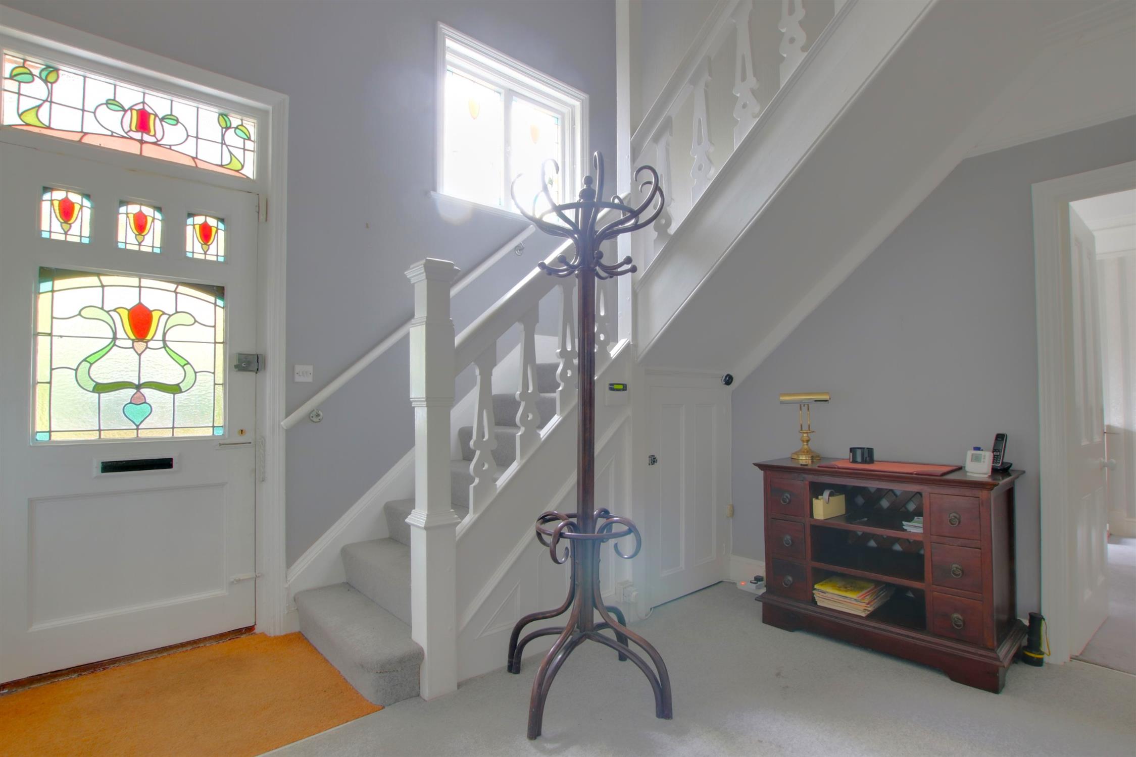 Undoubtedly one of the property's notable features is the full height vaulted reception hallway with fine turning staircase with intricate and detailed balustrade. Picture railing. Ornate moulded coving. Under stairs storage cupboard. Feature stained glass window to front elevation. Entrance door also with stained glass window.