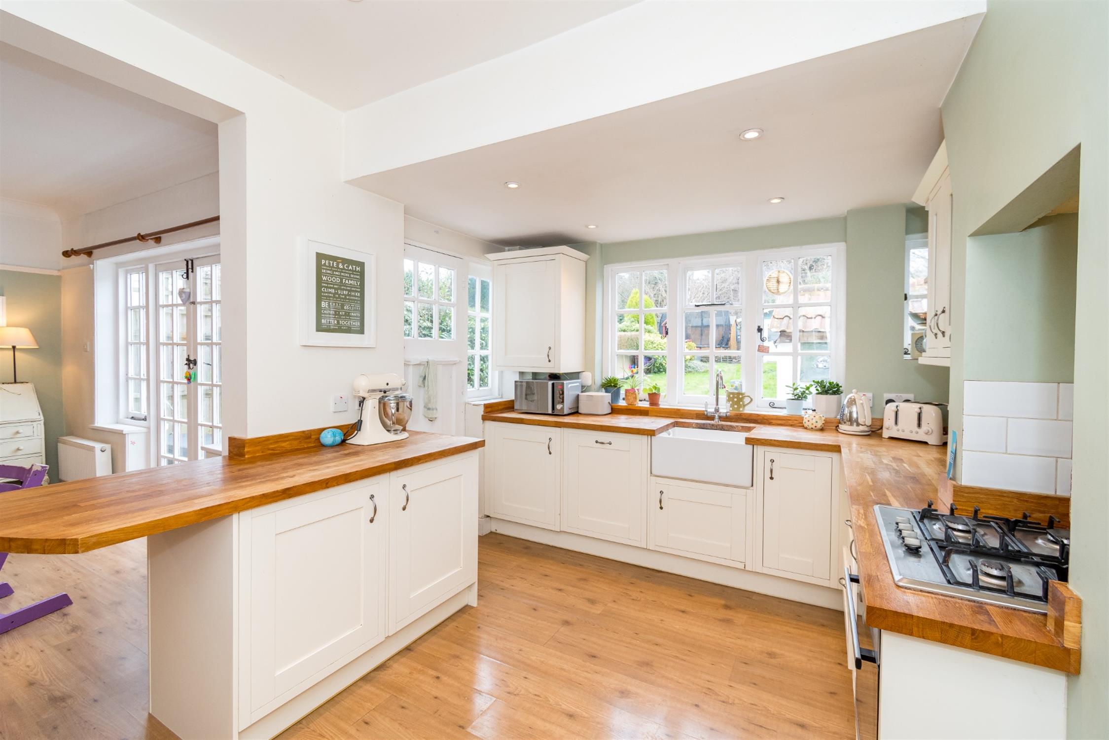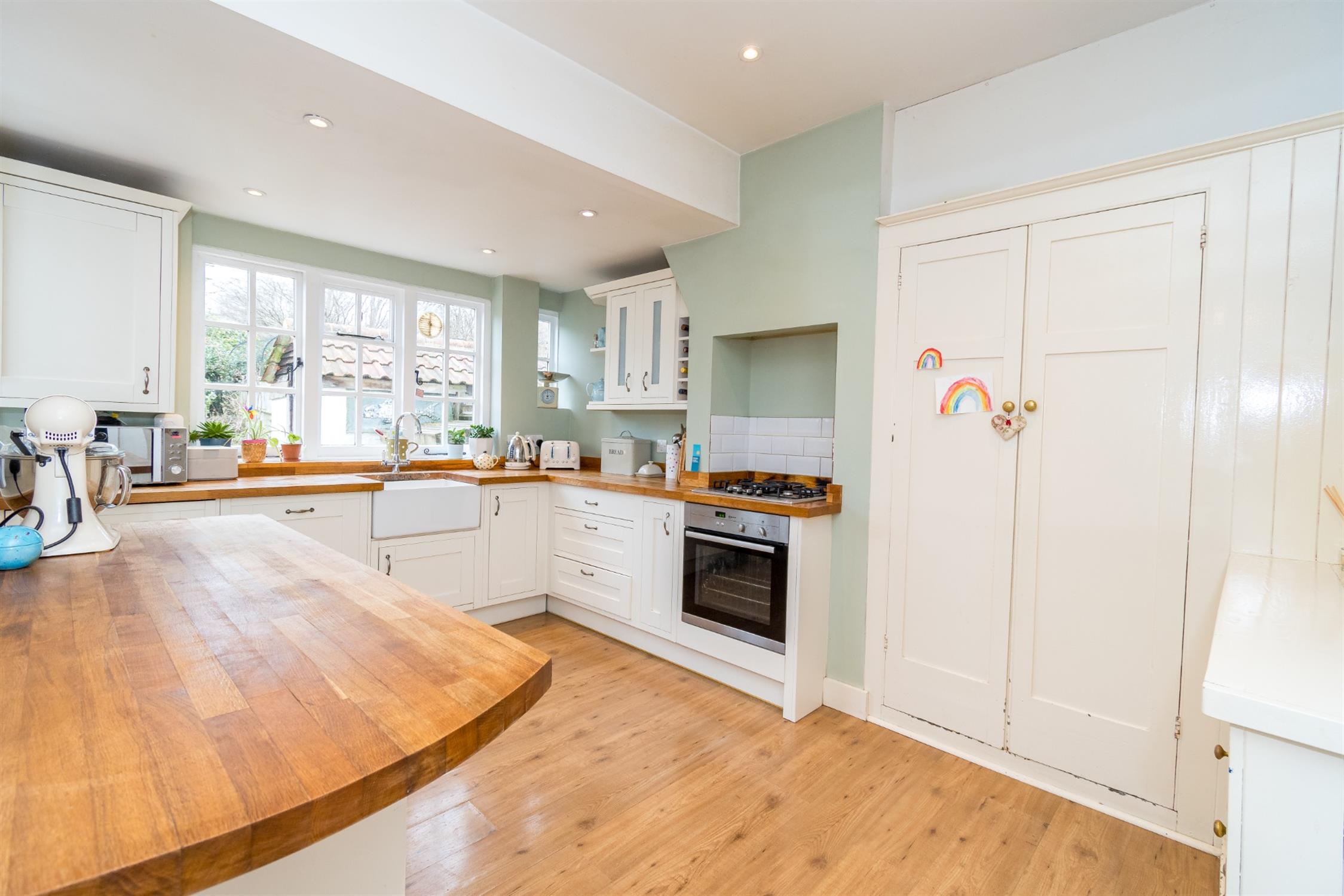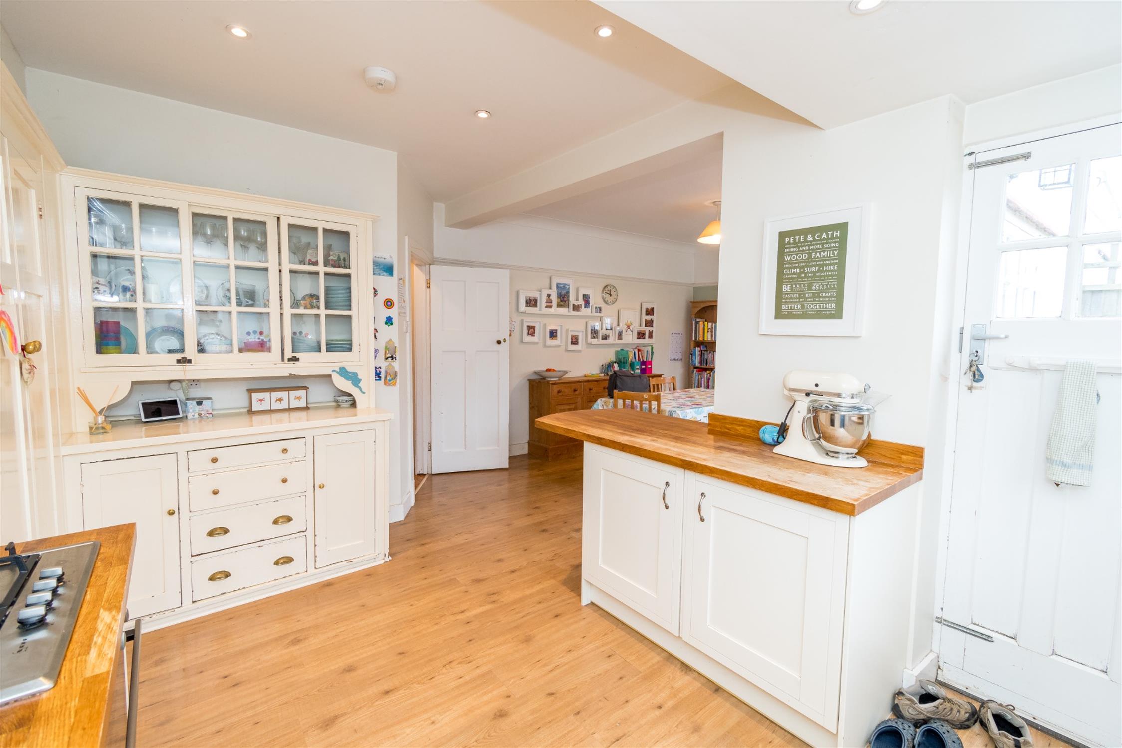 Windows to side and rear aspects. Door opening onto rear garden. Belfast sink with mixer tap and cupboard under. A range of matching eye level and base mounted units with Oak work surface. Built-in electric oven with fitted four ring gas hob. Integrated dishwasher, washing machine, fridge and freezer. Original Collins features - fitted larder cupboard and dresser. Laminate flooring.