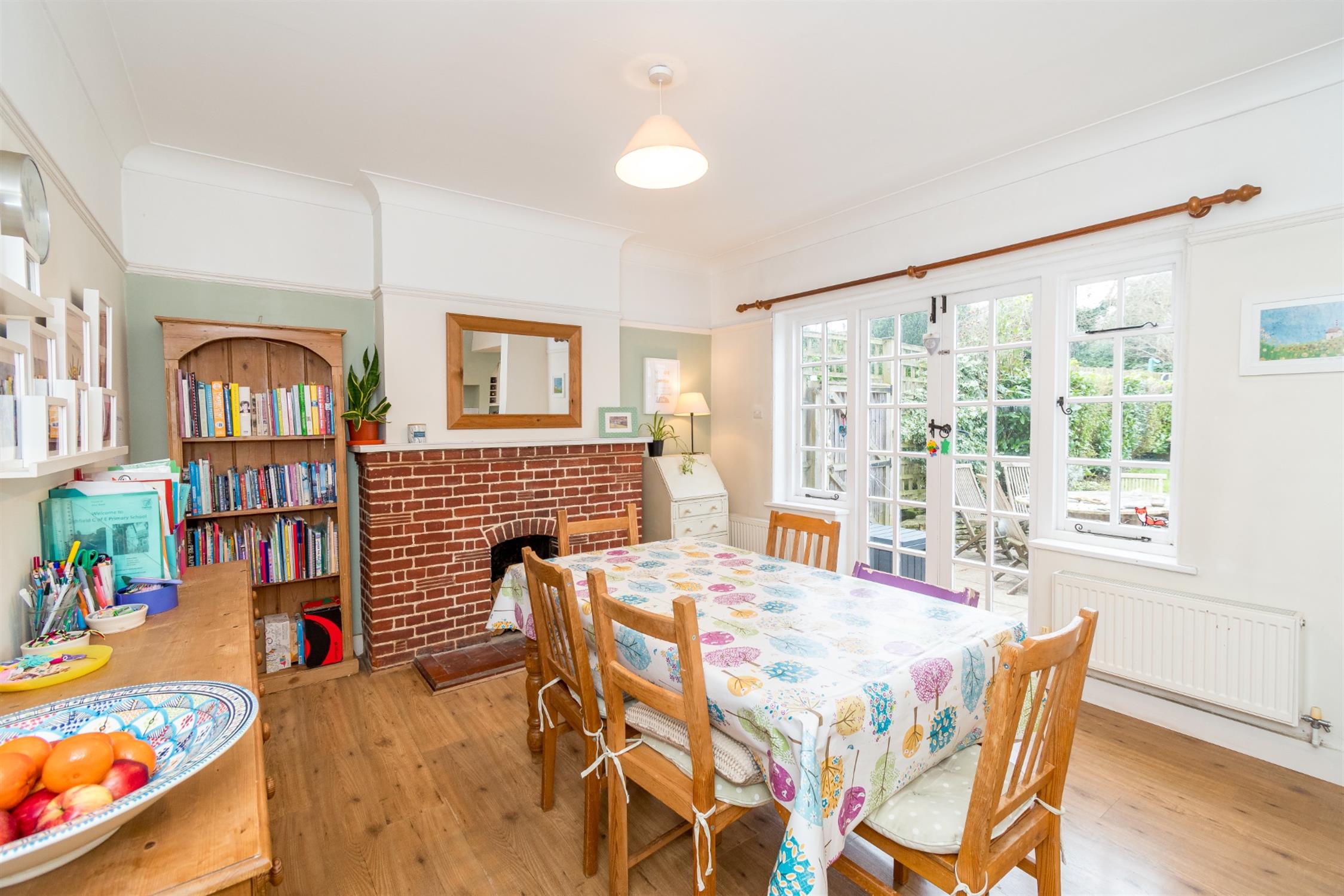 French doors and side windows onto rear garden. Coving to smooth ceiling. Picture rail. Feature fireplace. Two radiators. Laminate flooring. Opening to:-