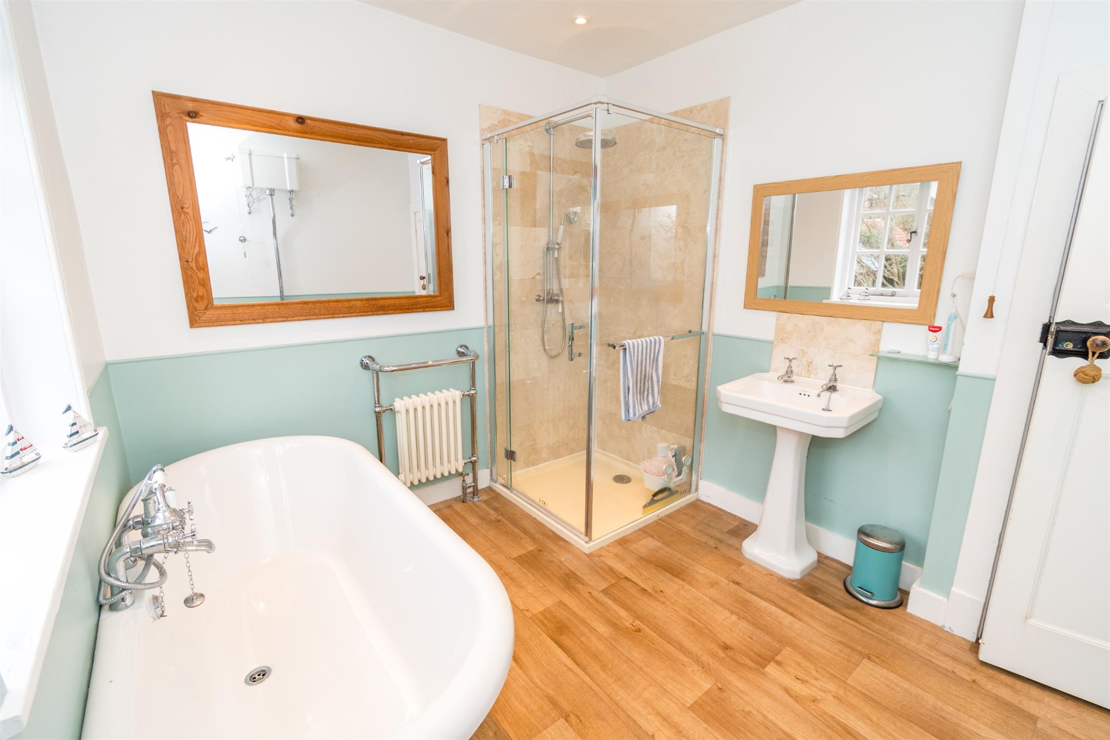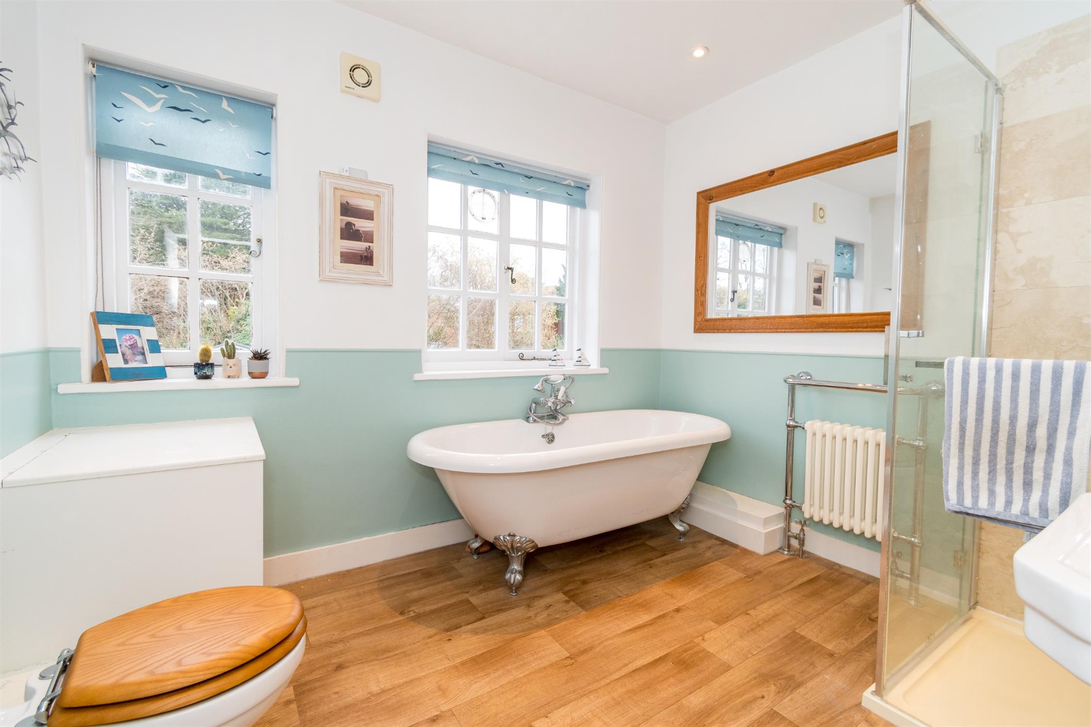Two windows to rear aspect. Free-standing roll top bath with mixer tap and shower attachment, tiled shower cubicle with rainfall shower head and shower attachment, pedestal wash basin and w.c. Radiator. Laminate flooring. Smooth ceiling with inset spotlights.