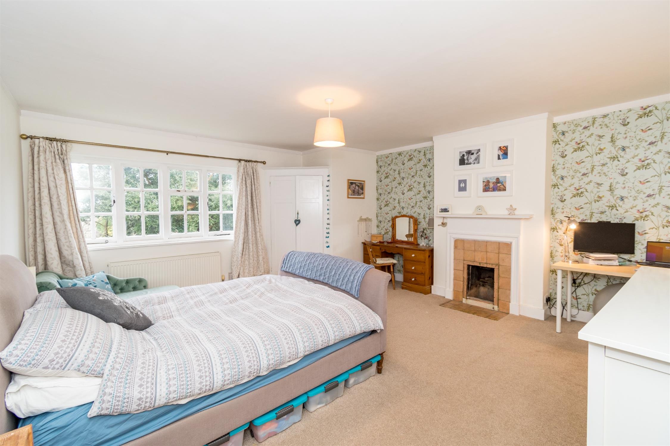 BEDROOM ONE:Window to front aspect. Original Collins fitted wardrobe. Feature fireplace. Radiator. Smooth ceiling.
