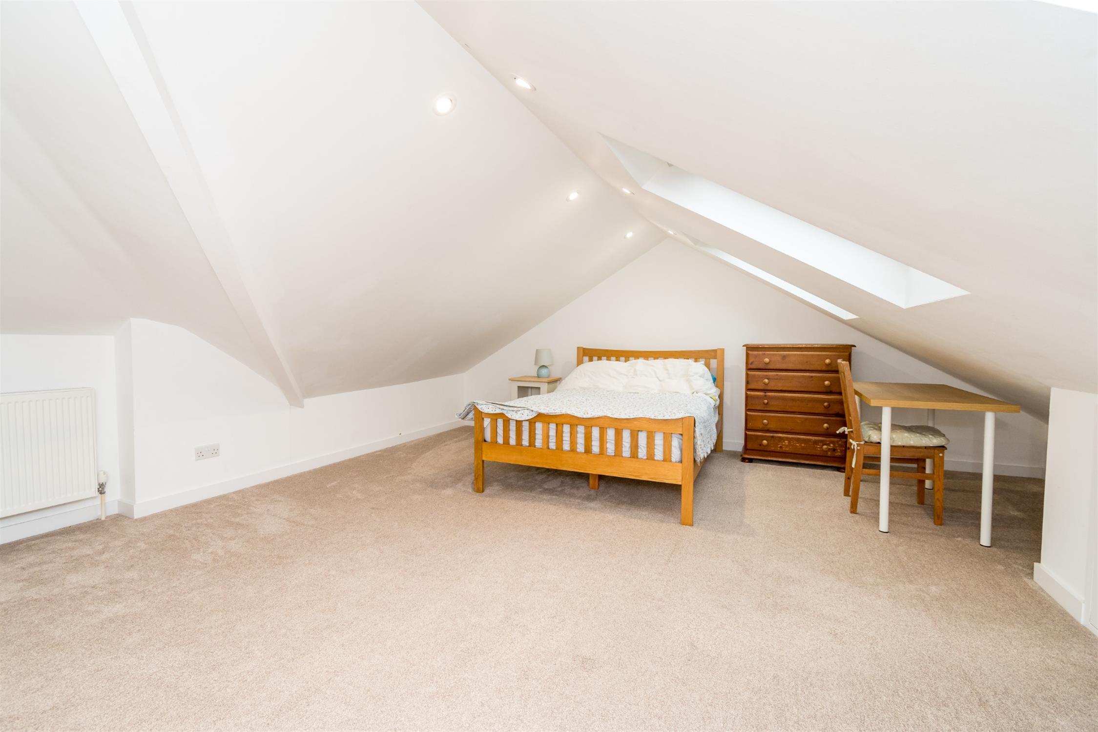Three double glazed velux windows to rear aspect. Smooth ceiling with recessed lighting. Eaves storage. Door to:-