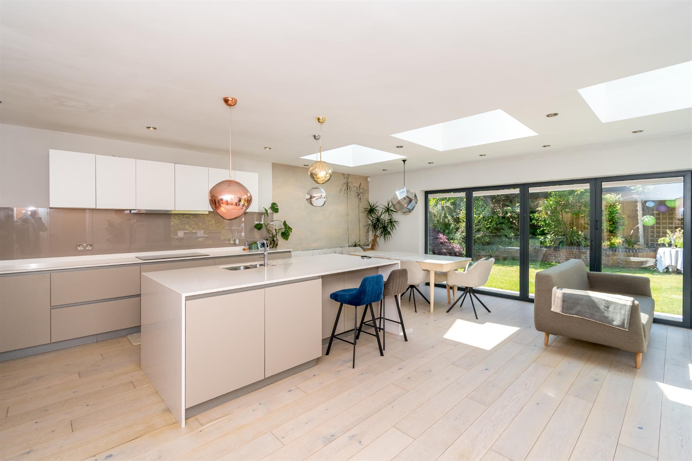 Double glazed bi-fold doors to rear and side aspects. Three large double glazed velux windows to rear aspect. Smooth ceiling with recessed lighting. Radiator. Engineered wood flooring. Single drainer one and a half bowl sink unit with waste disposal and quooker boiling hot water tap. A range of eye level and base mounted unit with quartz worktop over. Separate island unit with quartz worktop and cupboards under. Fitted five ring induction hob with extractor over. Integrated dishwasher. Integrated full height fridge and freezer. Built-in combi steam oven and combi microwave oven. Door to:-