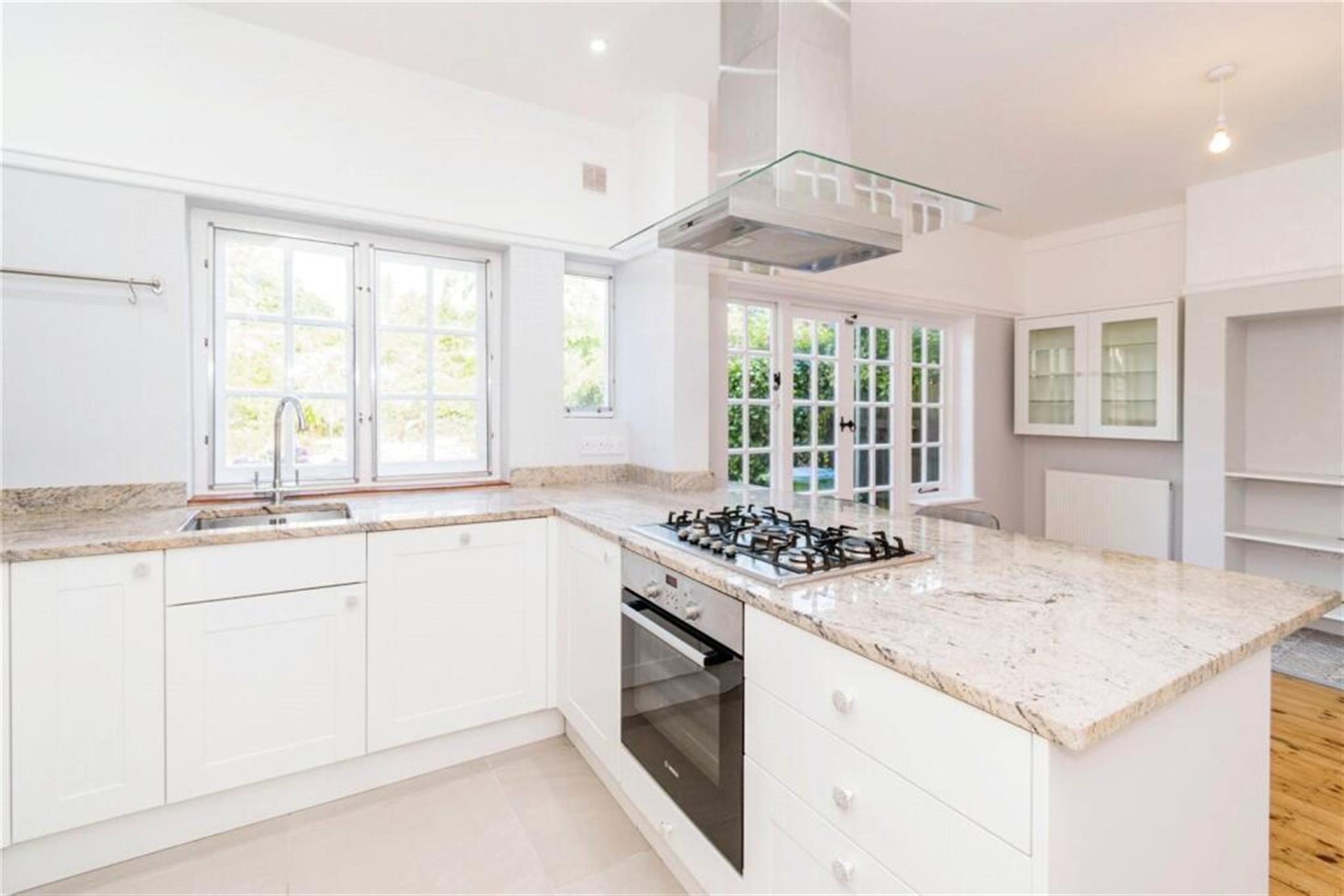 The kitchen has been re-fitted in a contemporary style to include a range of eye and base level units with work surfaces over. Built-in oven with gas hob and feature ceiling mounted stainless steel and glass chimney style extractor hood. Integrated dishwasher. Two secondary double glazed windows. Tiled flooring. Picture railing. Recessed lighting. Under stairs storage cupboard. Door to:-