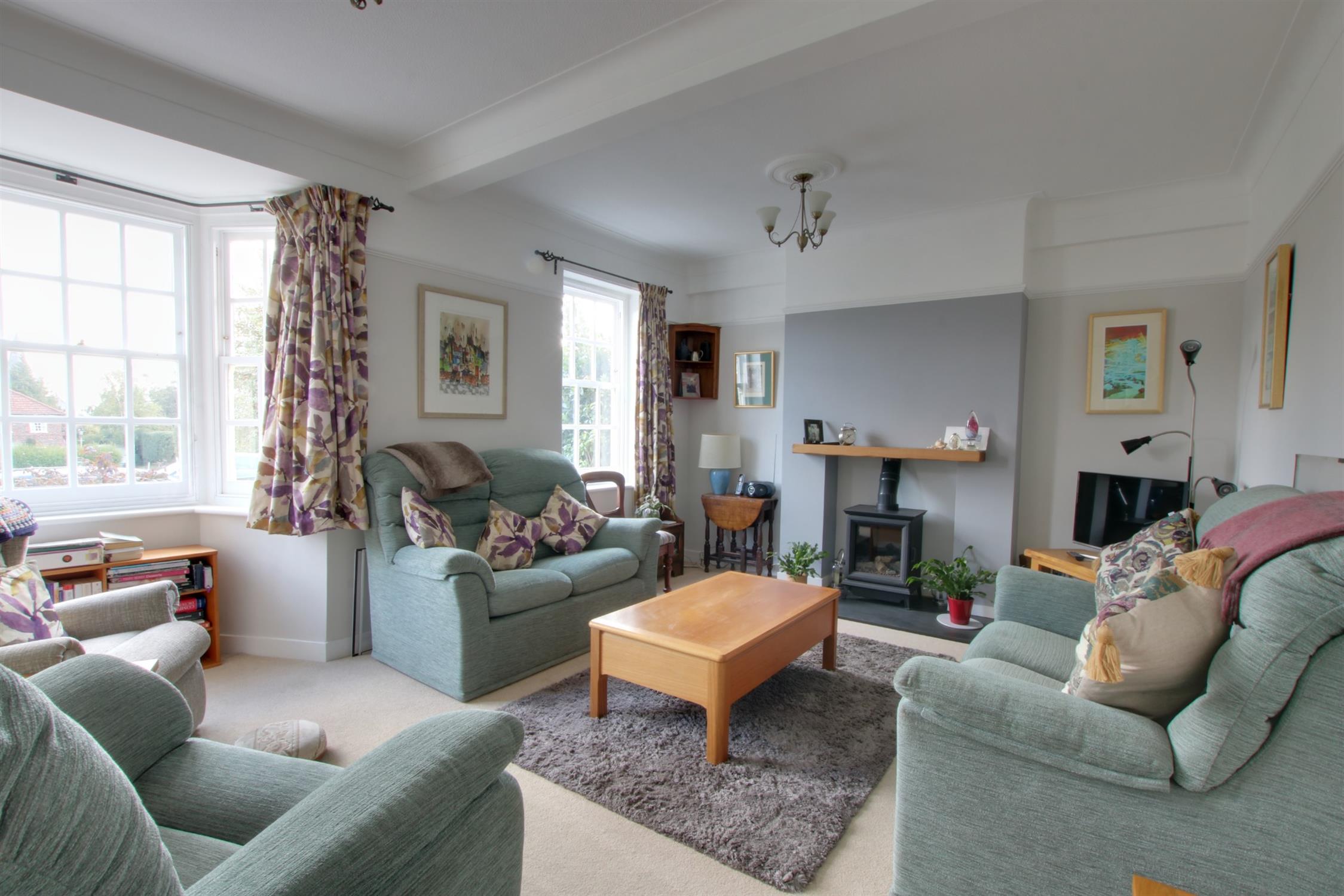 Georgian style bay window with additional Georgian style window to front elevation. The room centres around a fitted log burner effect gas fire with slate hearth. Radiator.